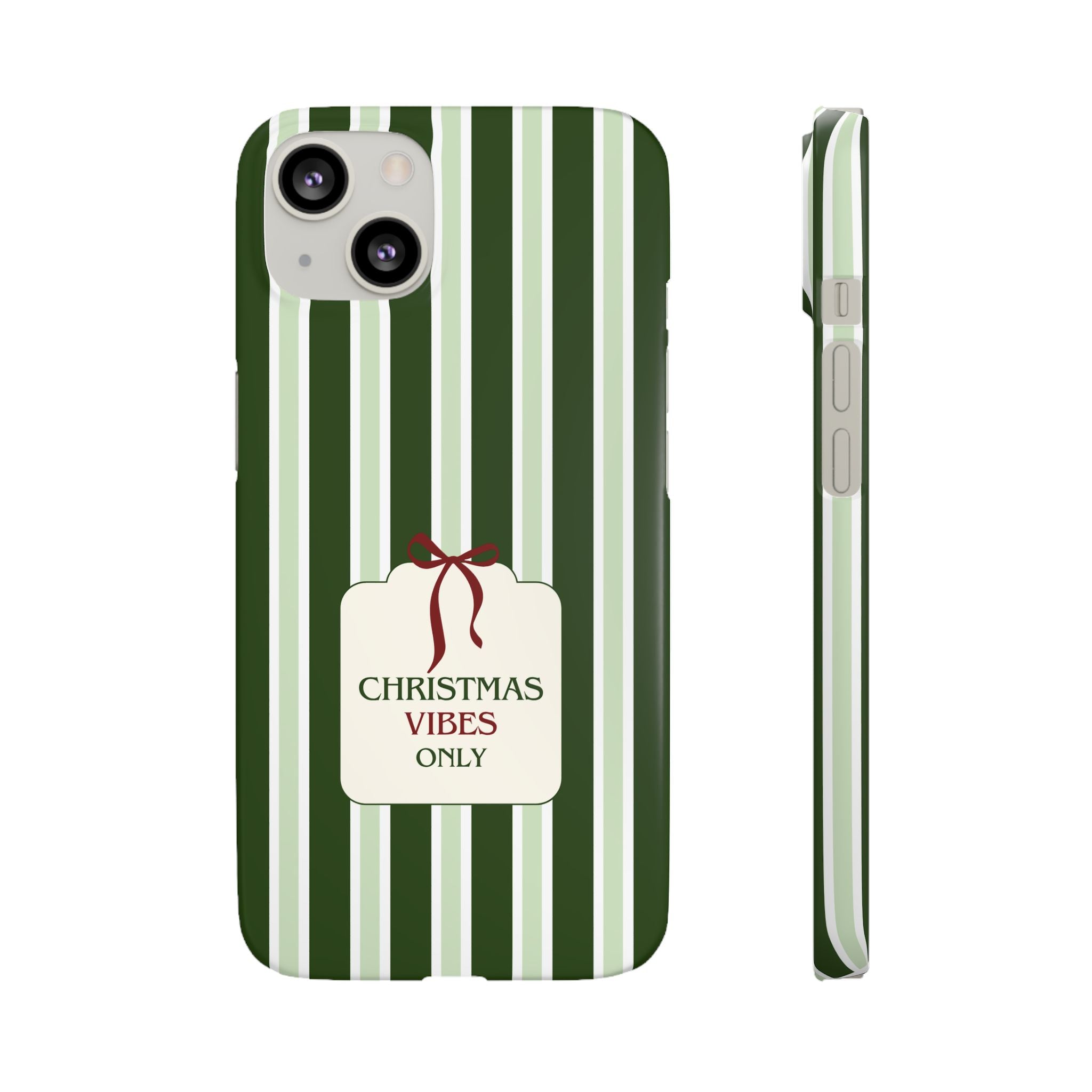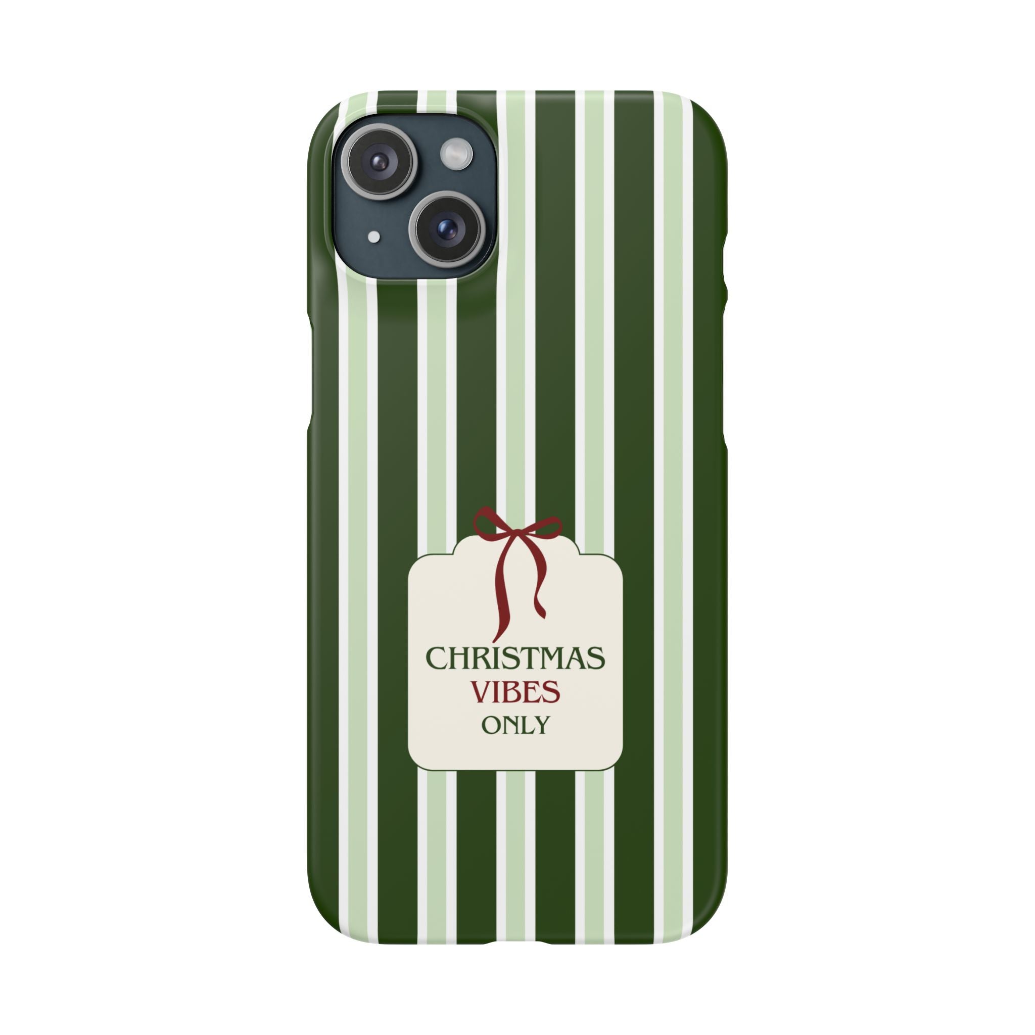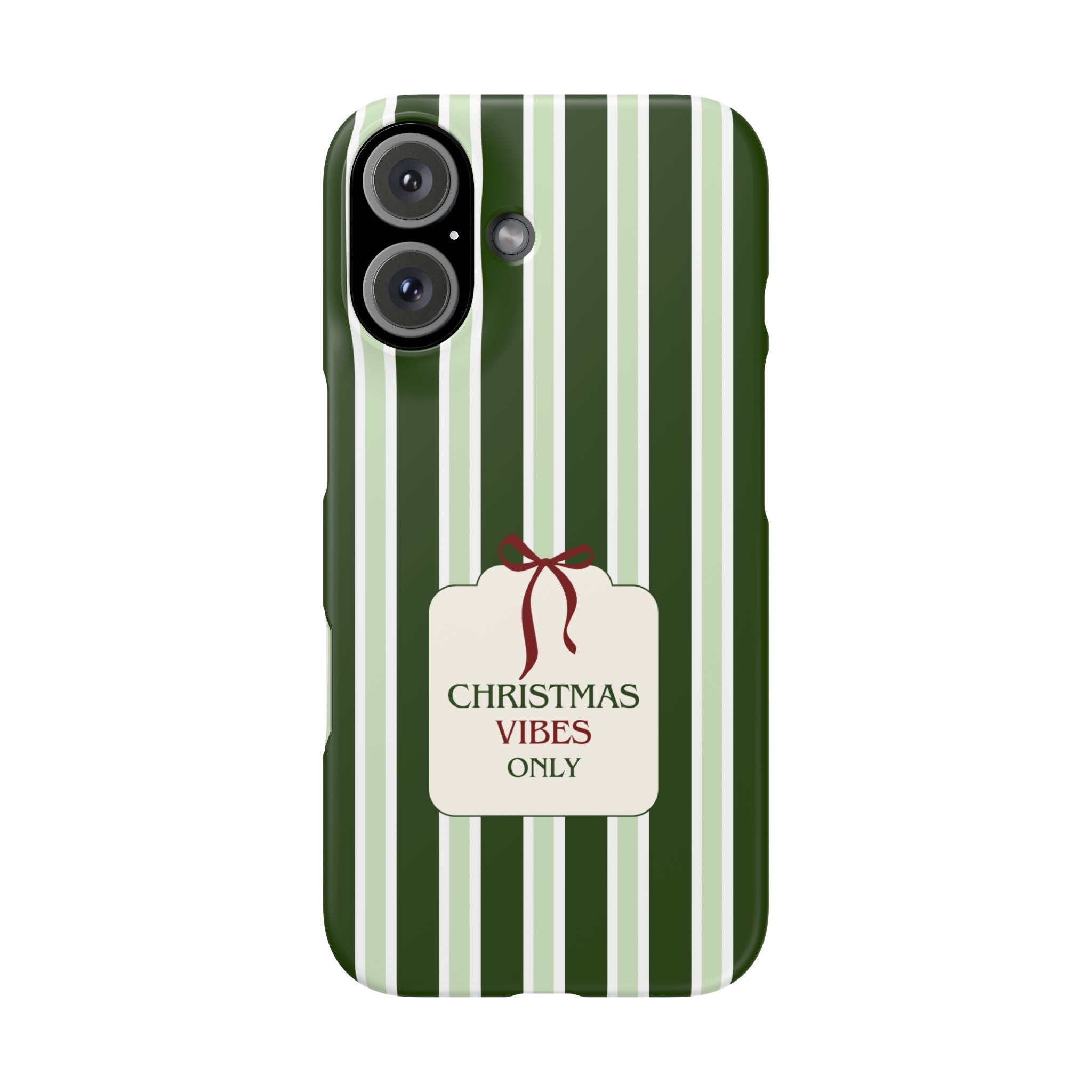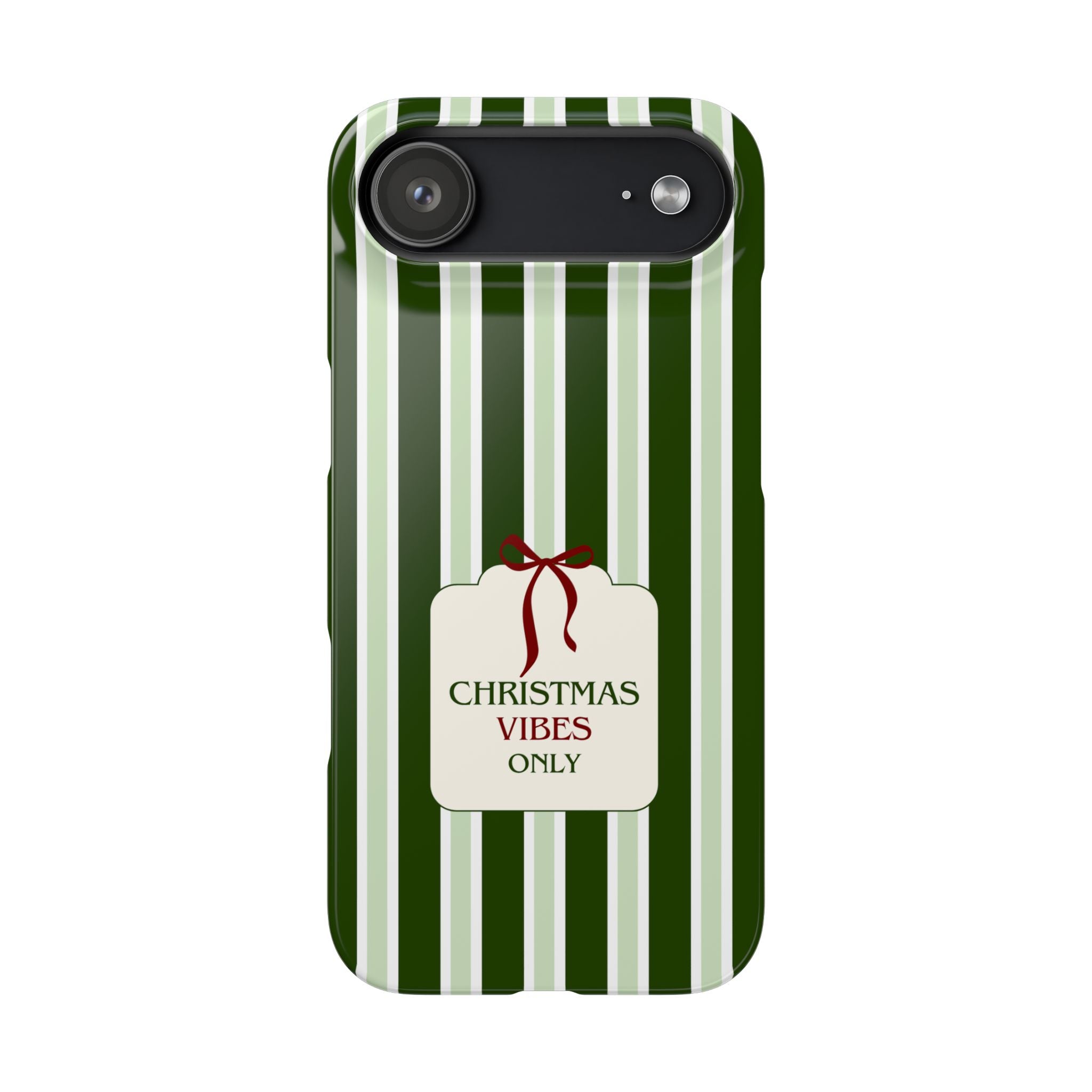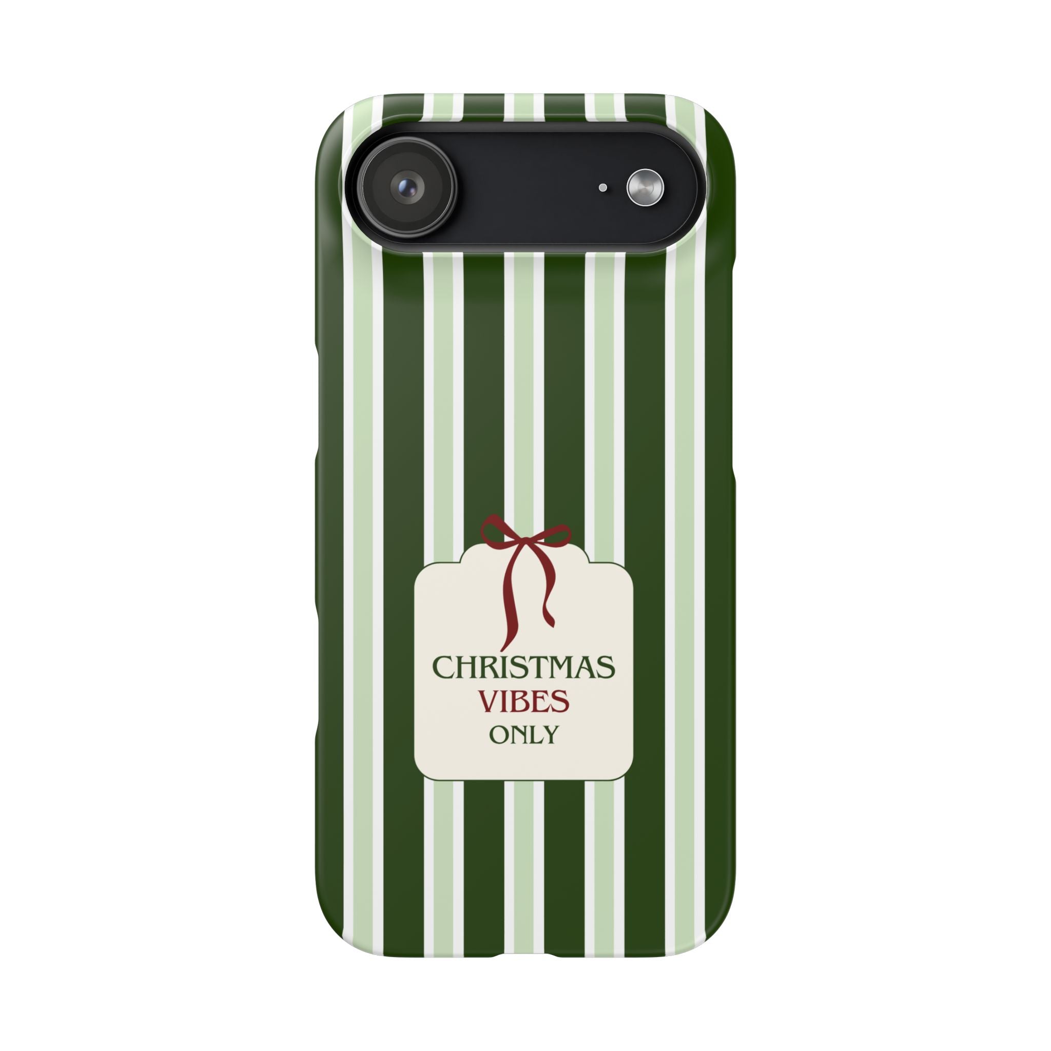 Christmas Vibes Only – schlank & stilvoll, schützt dein Smartphone zuverlässig vor Kratzern & leichten Stößen und bringt mit den frischen grünen Streifen und dem „Christmas Vibes Only“-Schriftzug moderne, entspannte Weihnachtsstimmung in deinen Alltag.