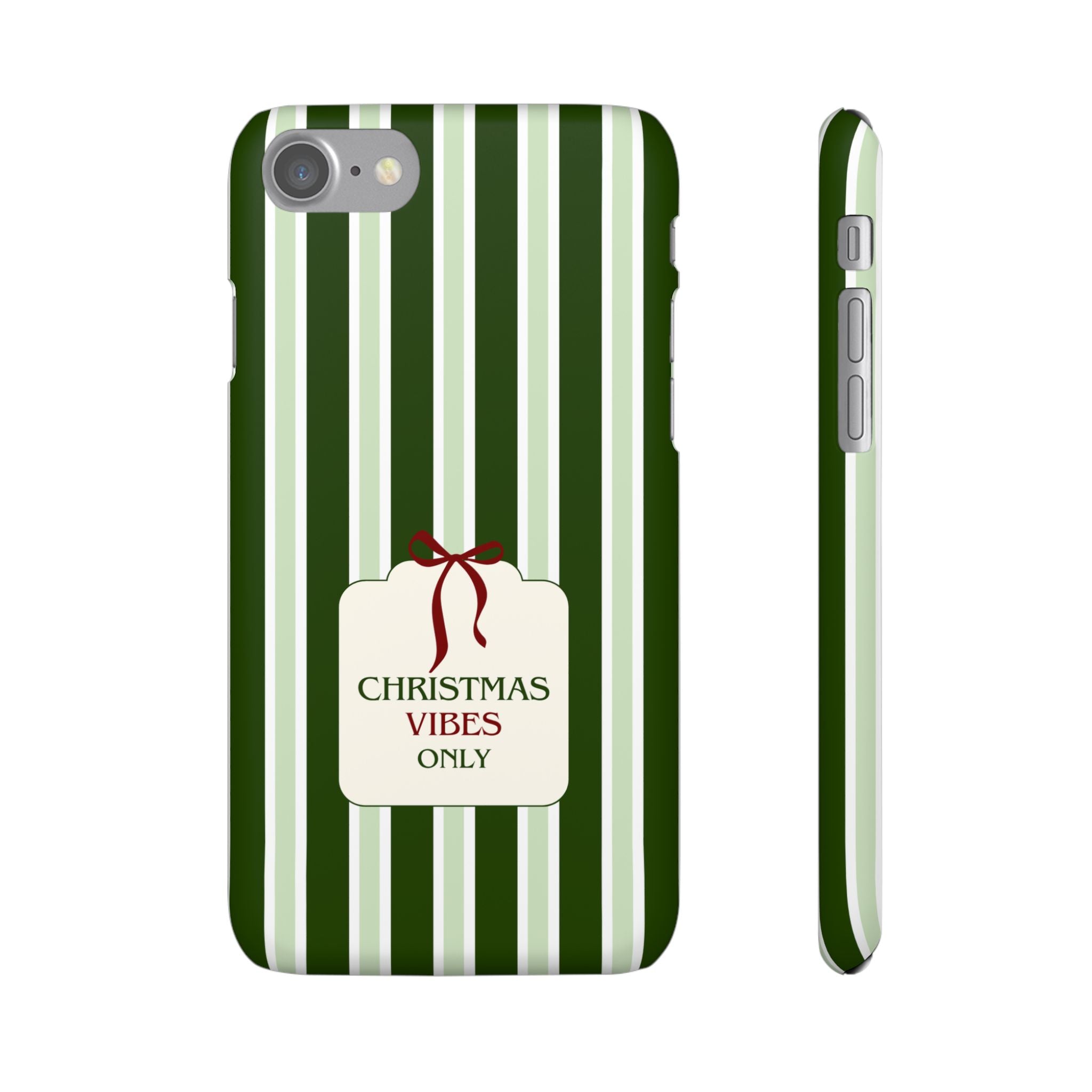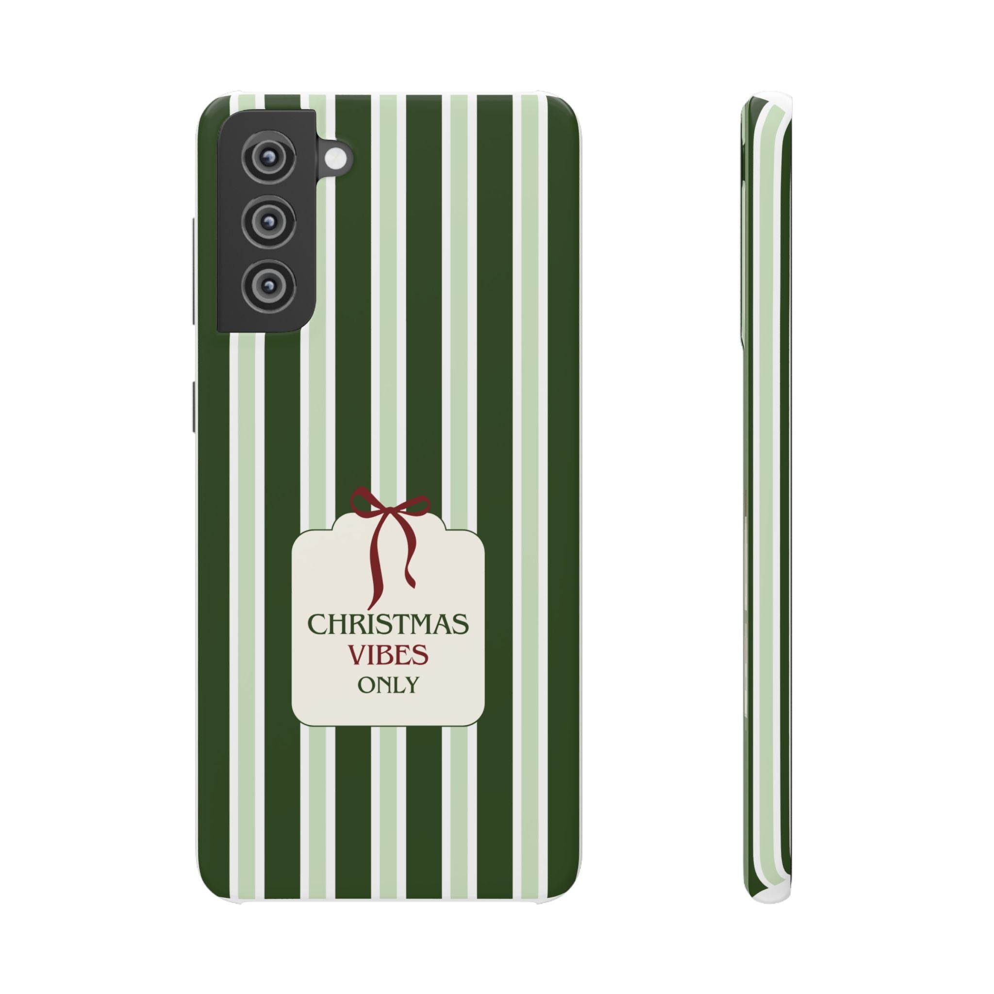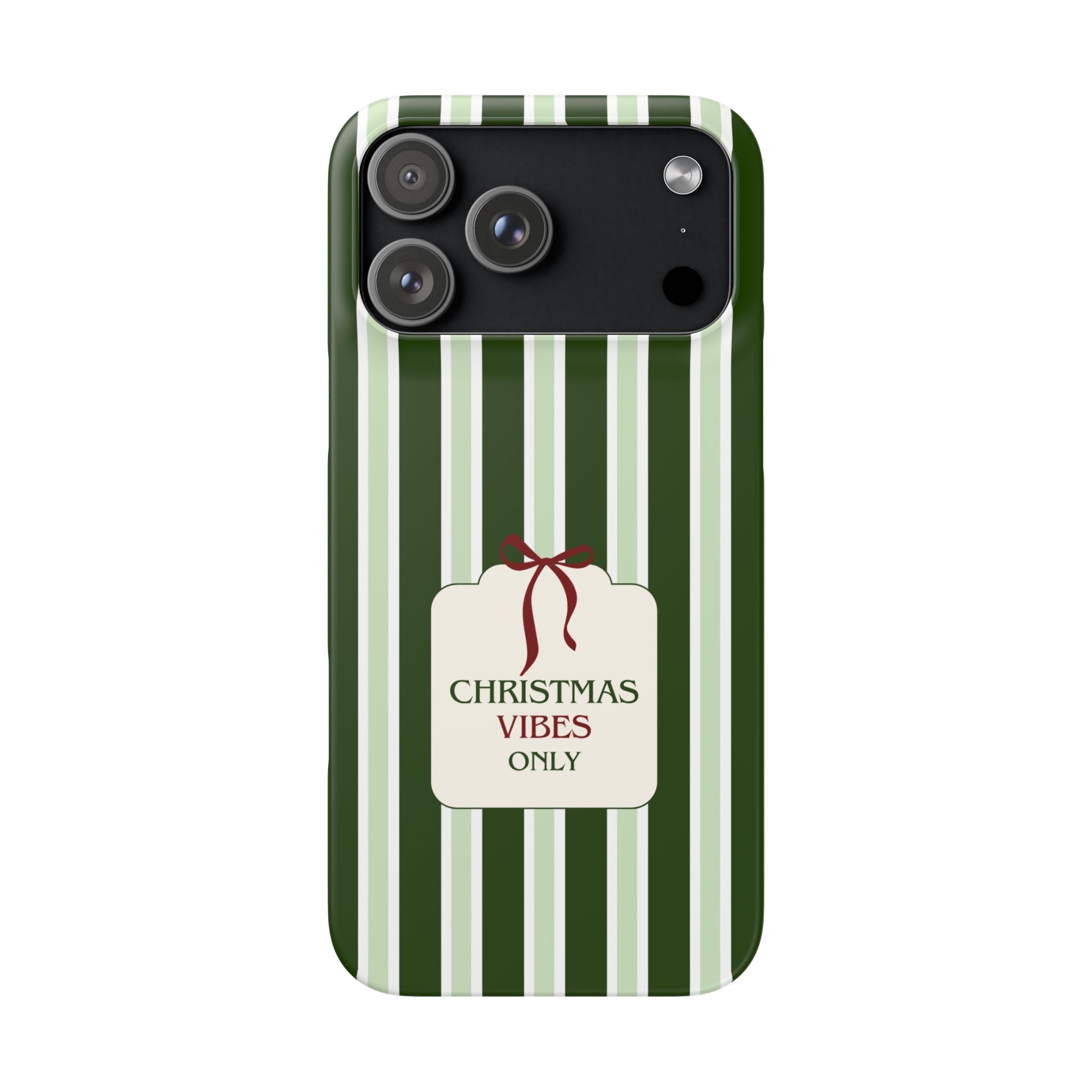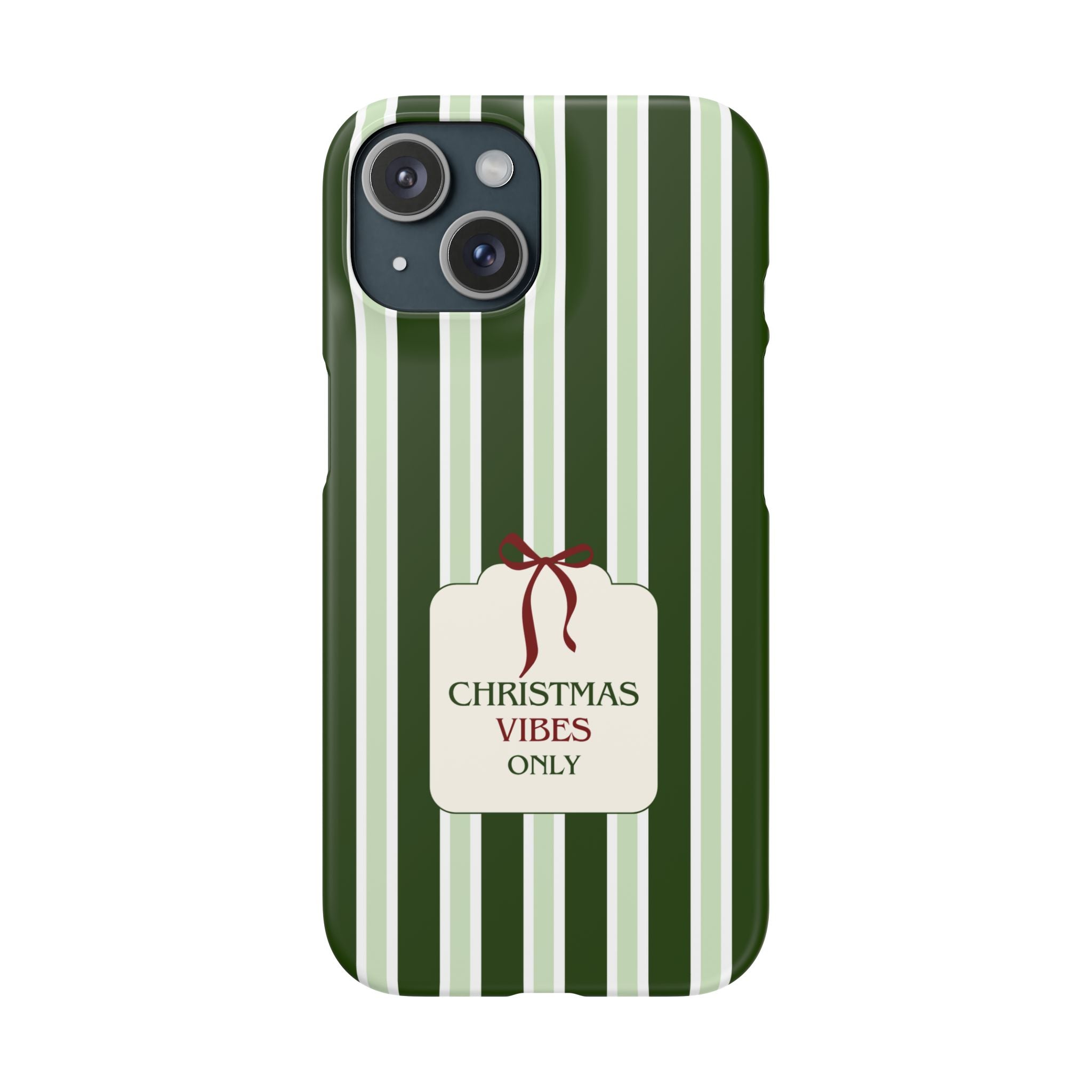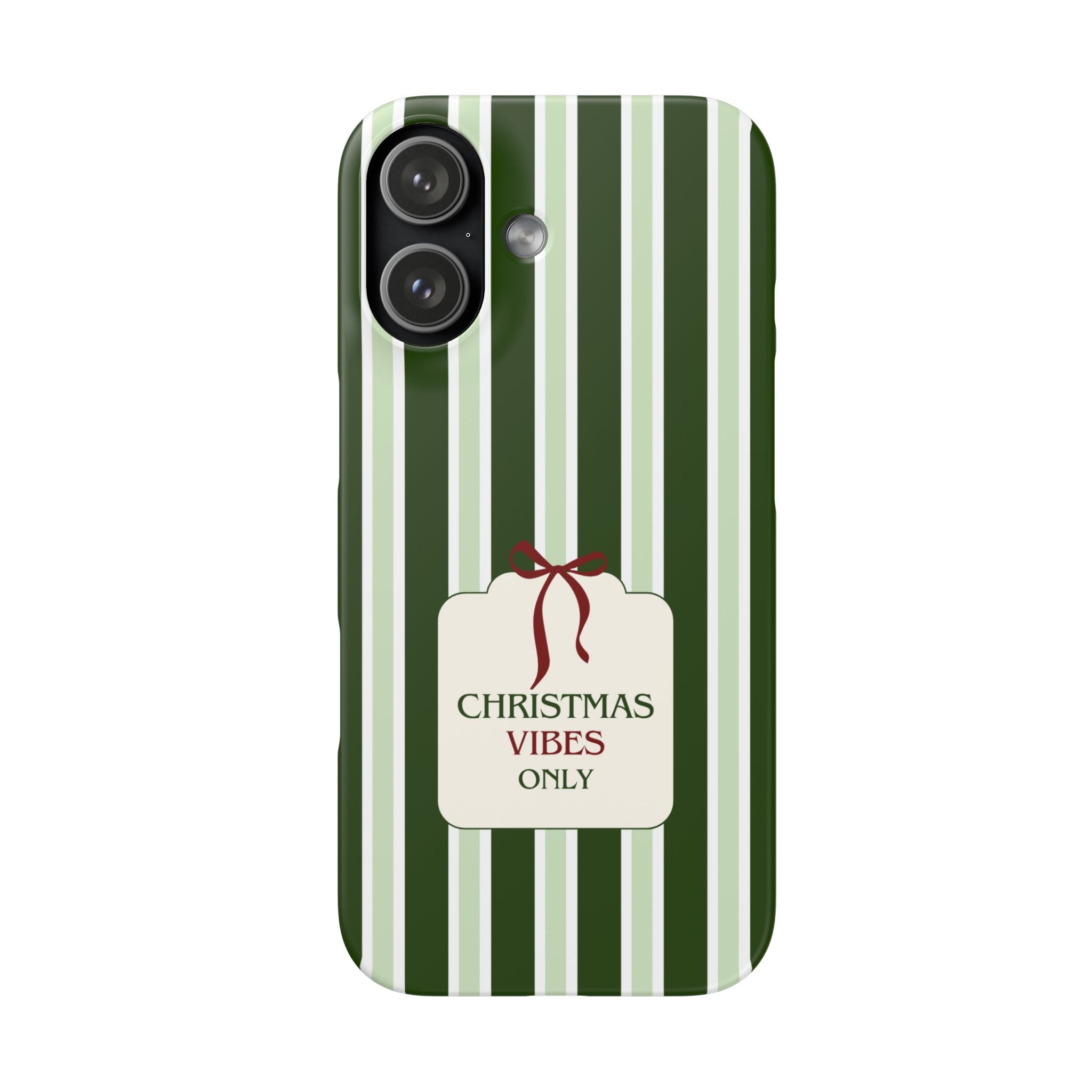 Christmas Vibes Only – schlank & stilvoll, schützt dein Smartphone zuverlässig vor Kratzern & leichten Stößen und bringt mit den frischen grünen Streifen und dem „Christmas Vibes Only“-Schriftzug moderne, entspannte Weihnachtsstimmung in deinen Alltag.