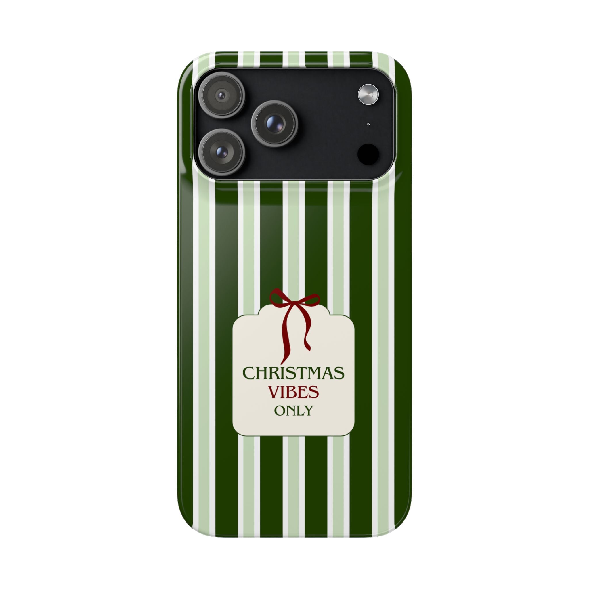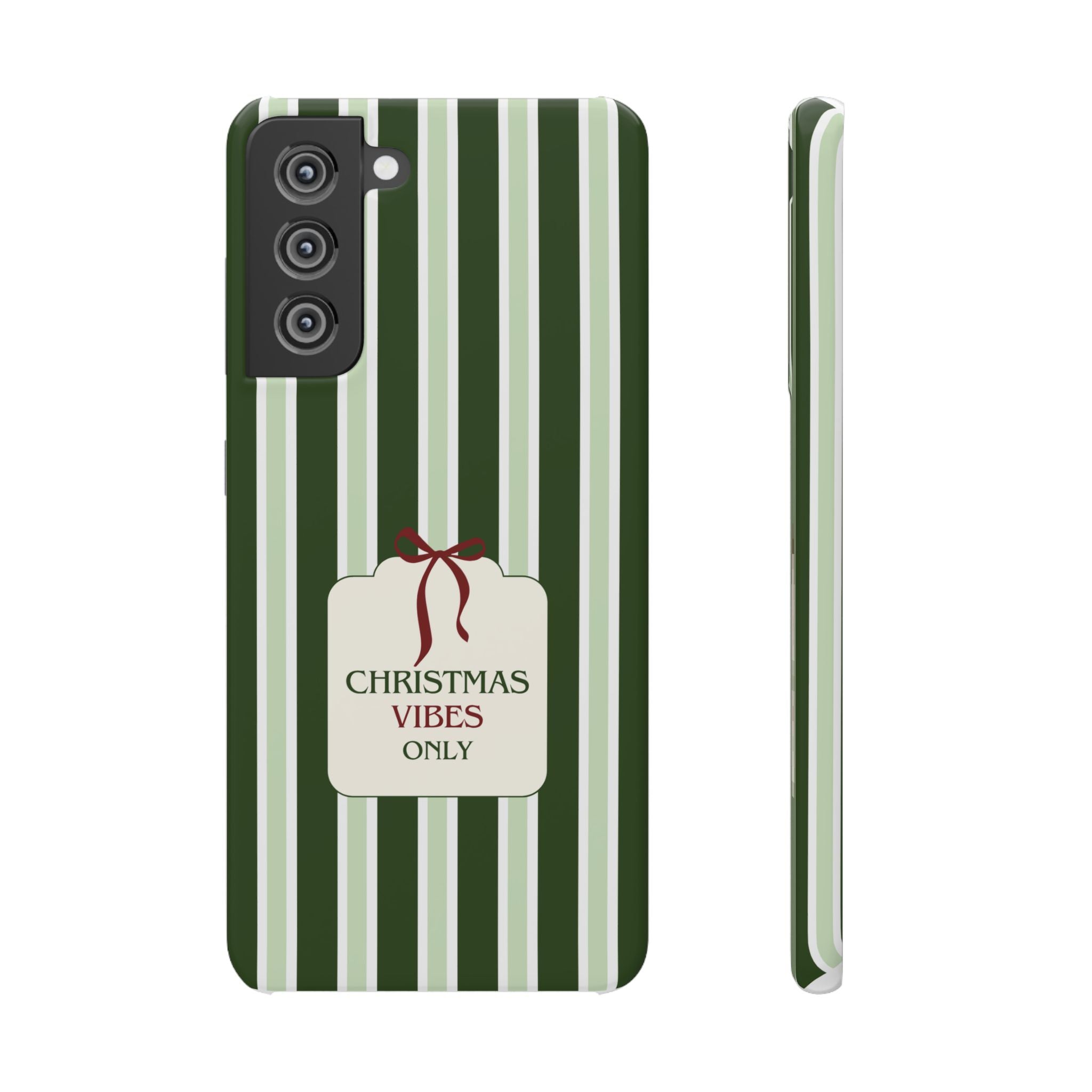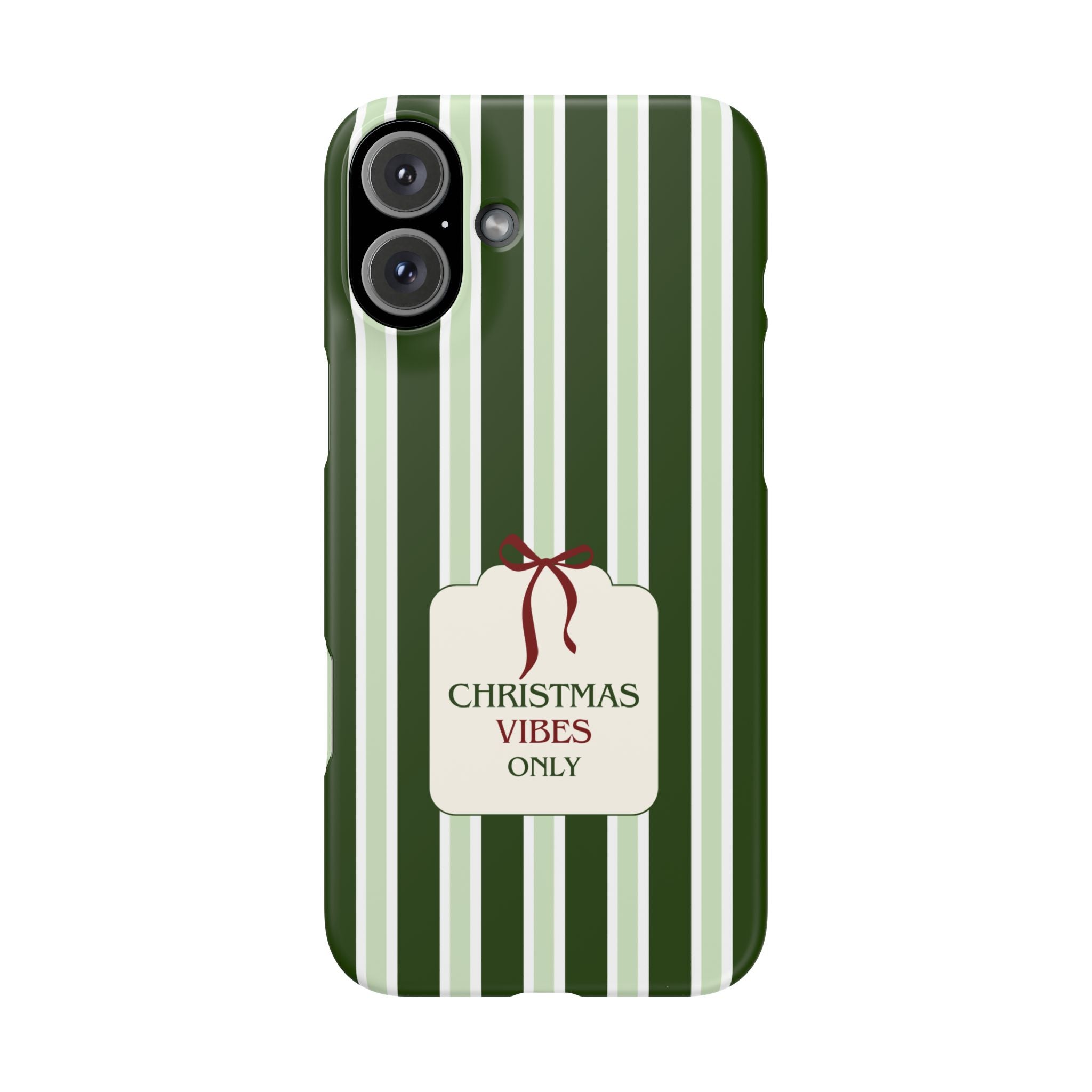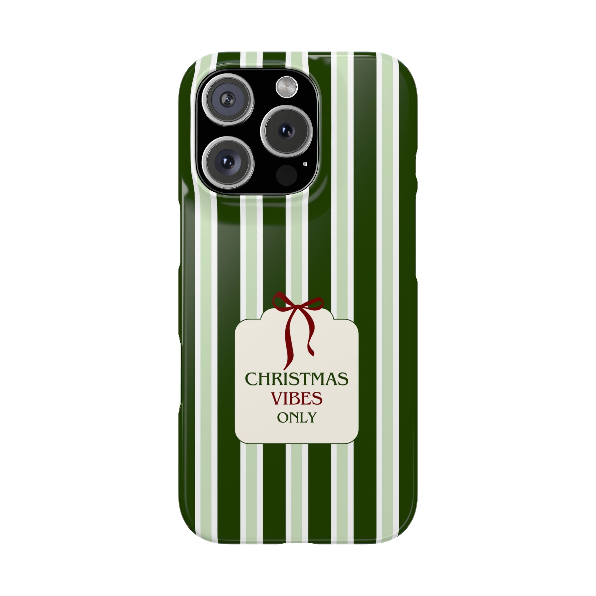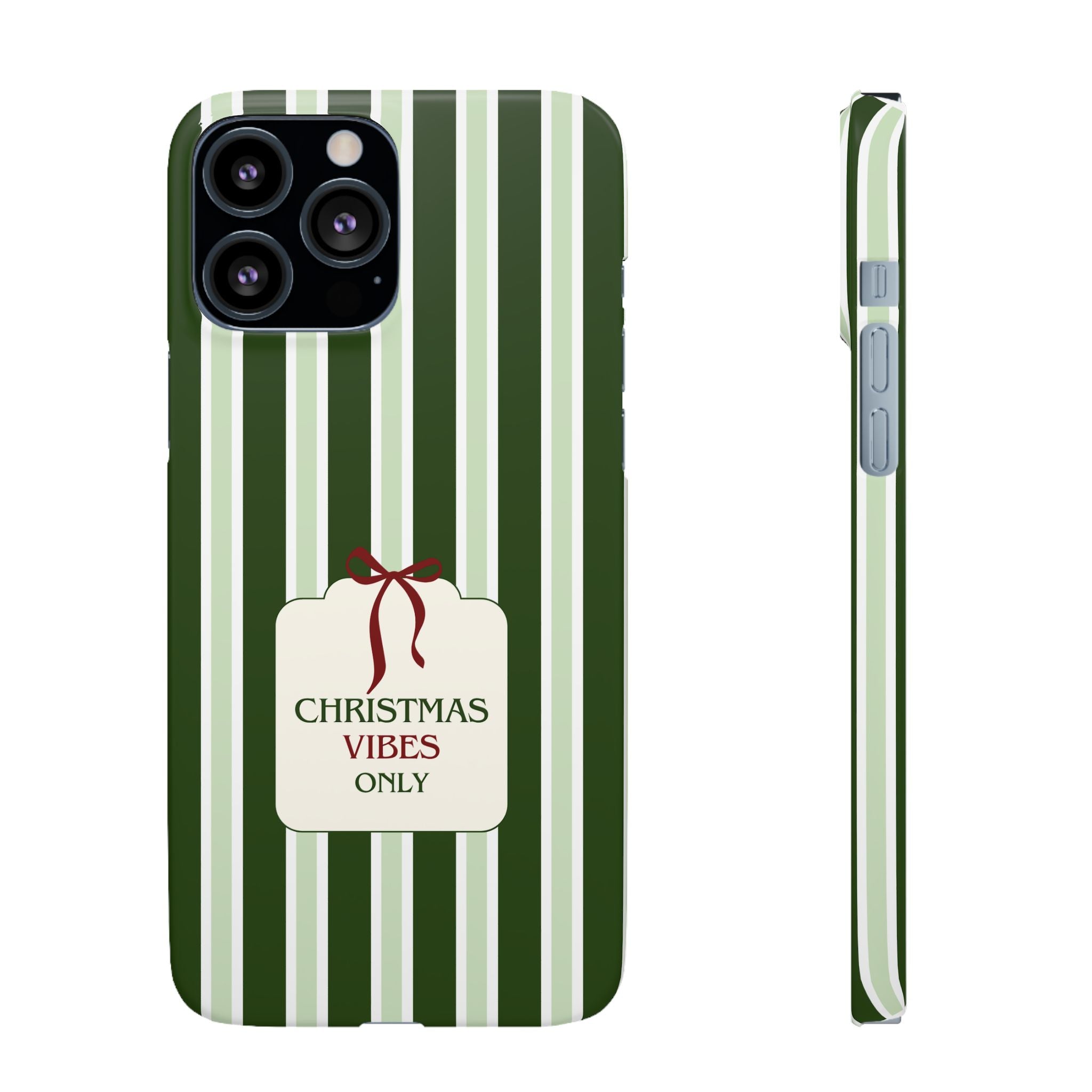 Christmas Vibes Only – schlank & stilvoll, schützt dein Smartphone zuverlässig vor Kratzern & leichten Stößen und bringt mit den frischen grünen Streifen und dem „Christmas Vibes Only“-Schriftzug moderne, entspannte Weihnachtsstimmung in deinen Alltag.