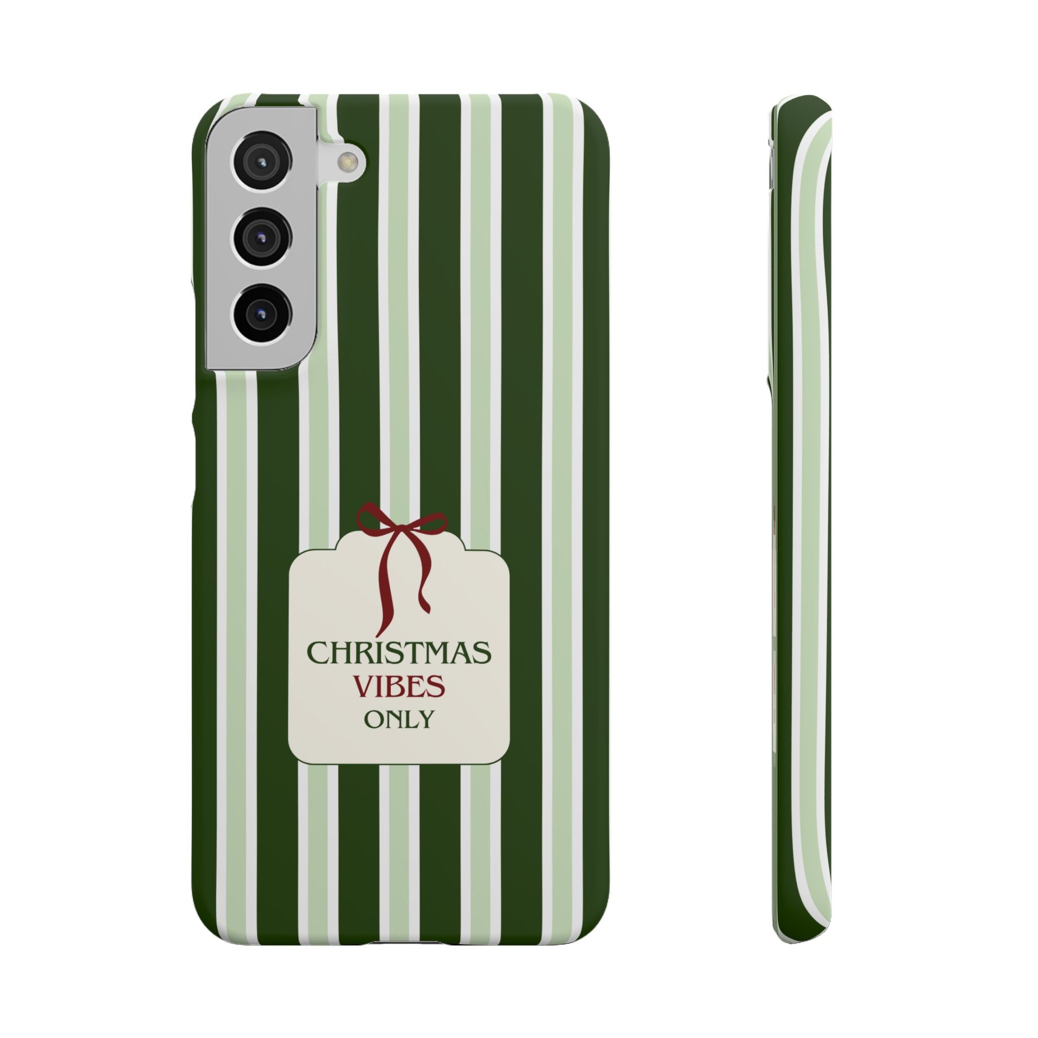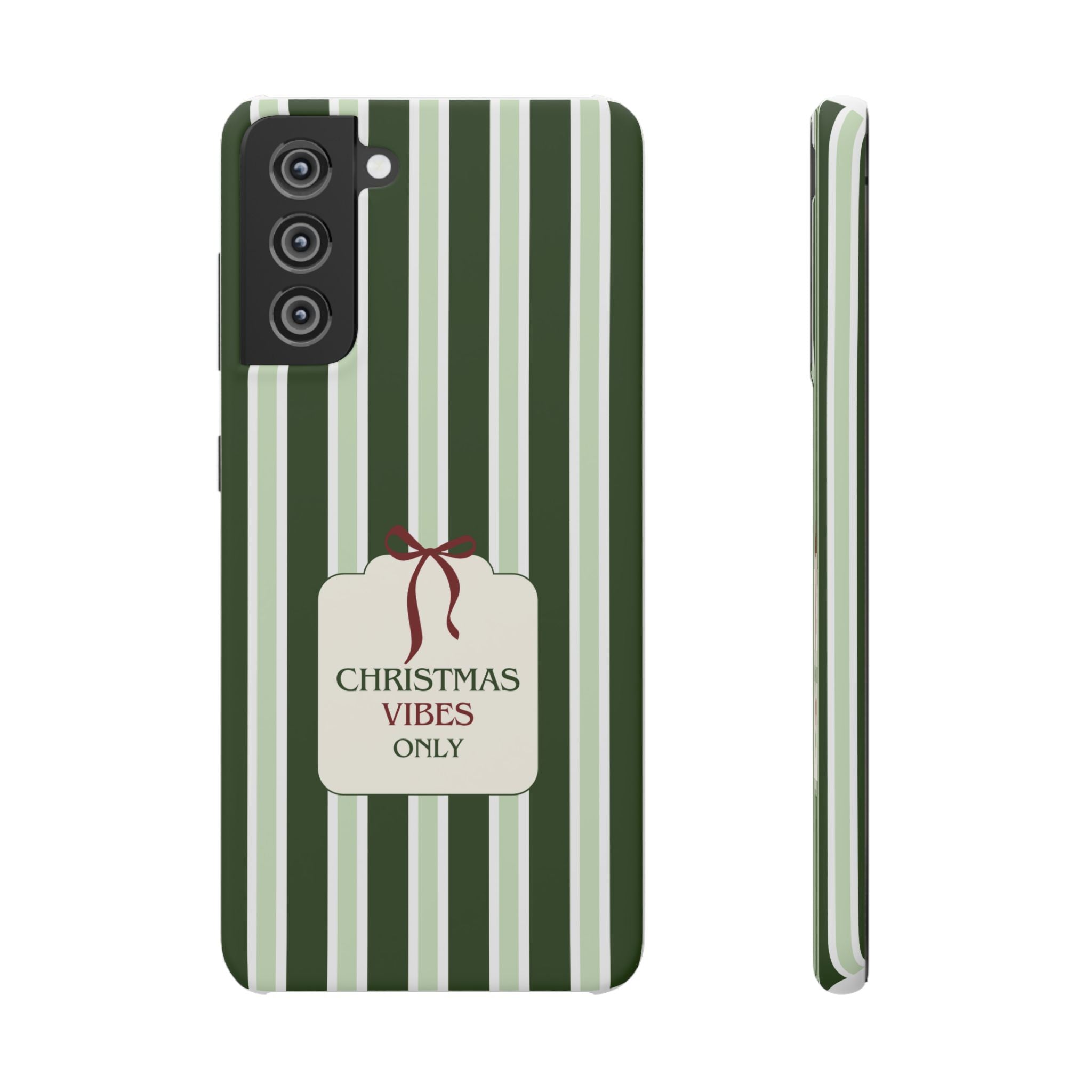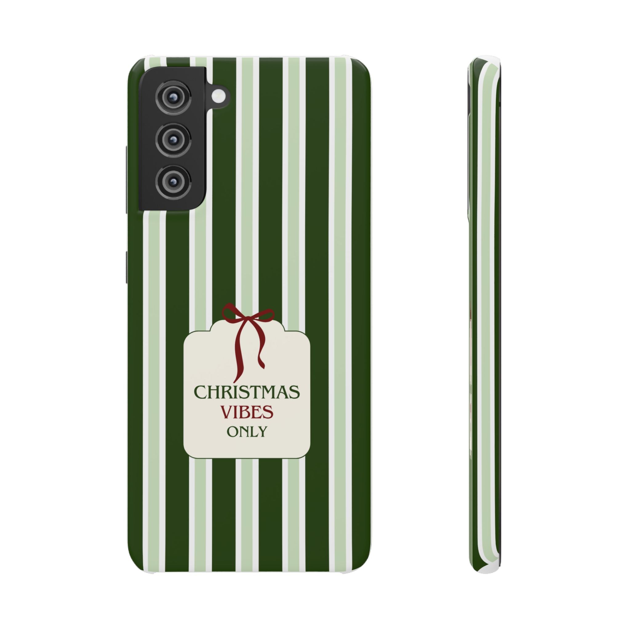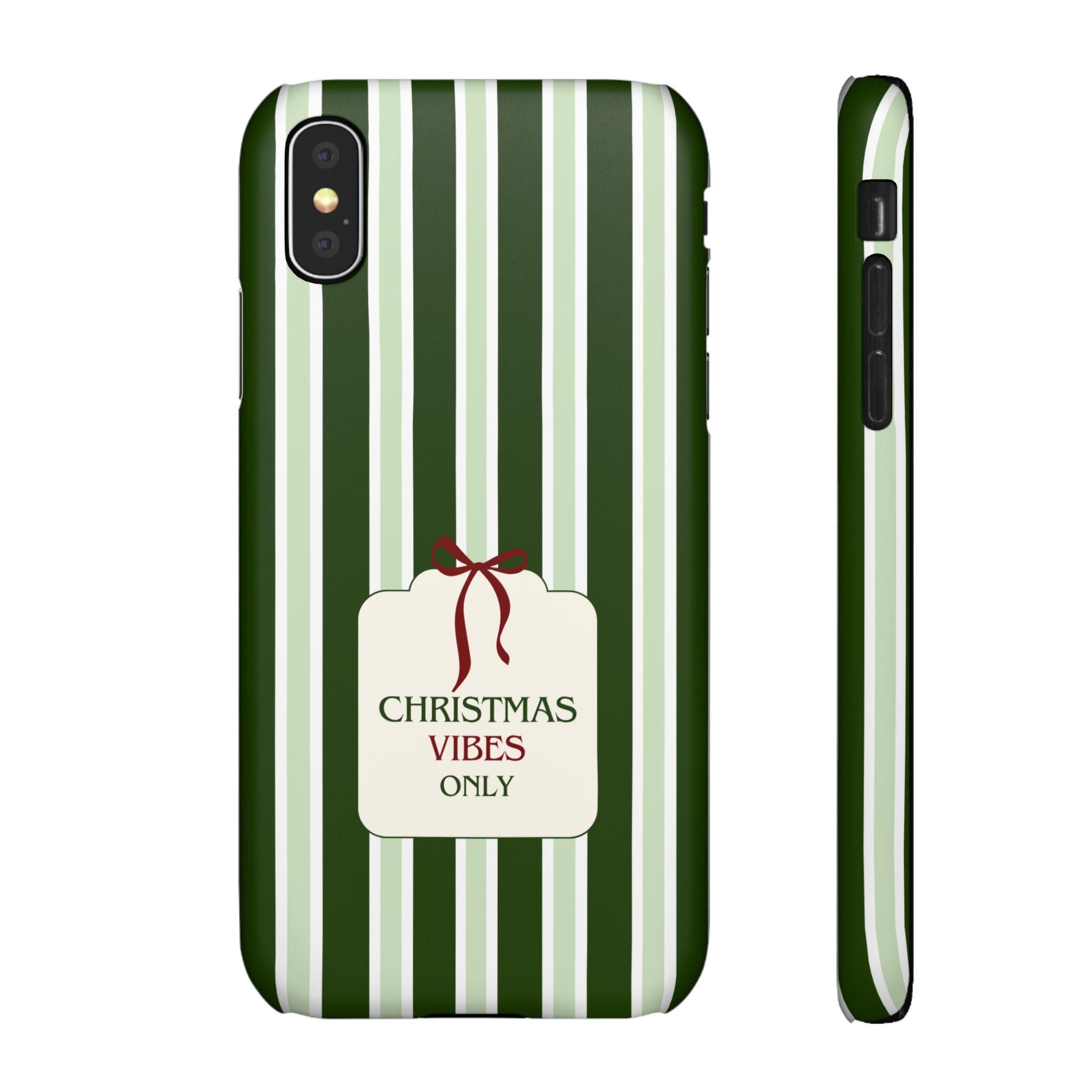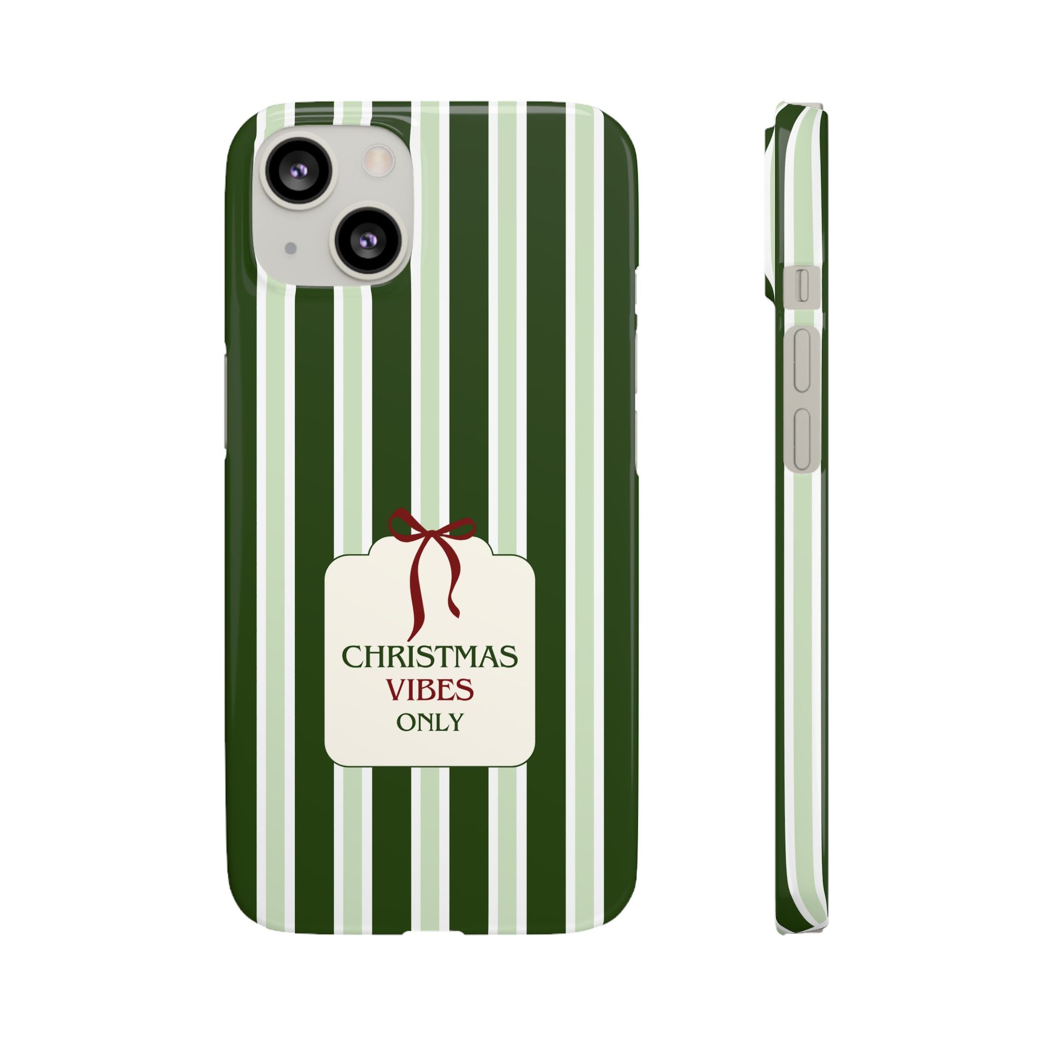 Christmas Vibes Only – schlank & stilvoll, schützt dein Smartphone zuverlässig vor Kratzern & leichten Stößen und bringt mit den frischen grünen Streifen und dem „Christmas Vibes Only“-Schriftzug moderne, entspannte Weihnachtsstimmung in deinen Alltag.