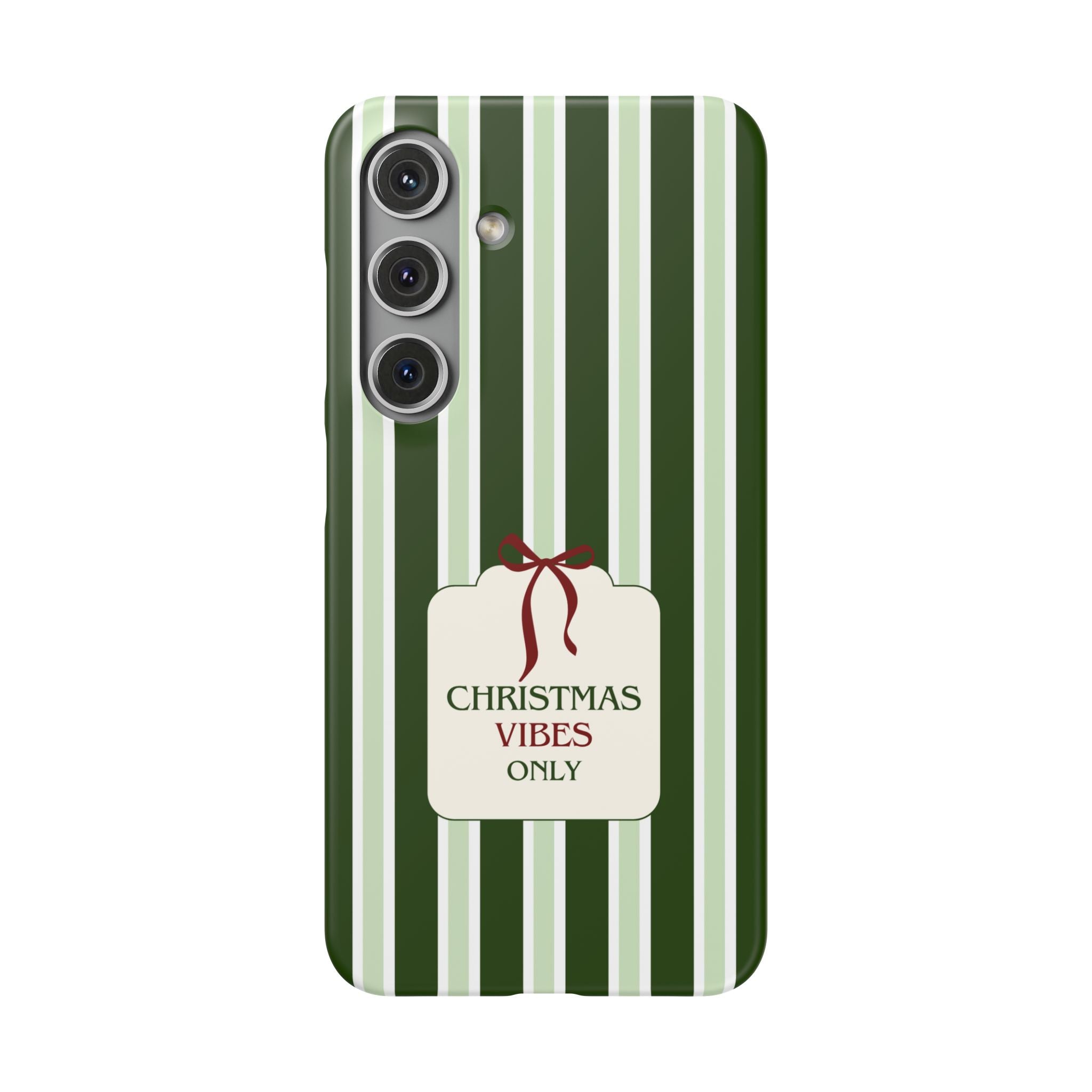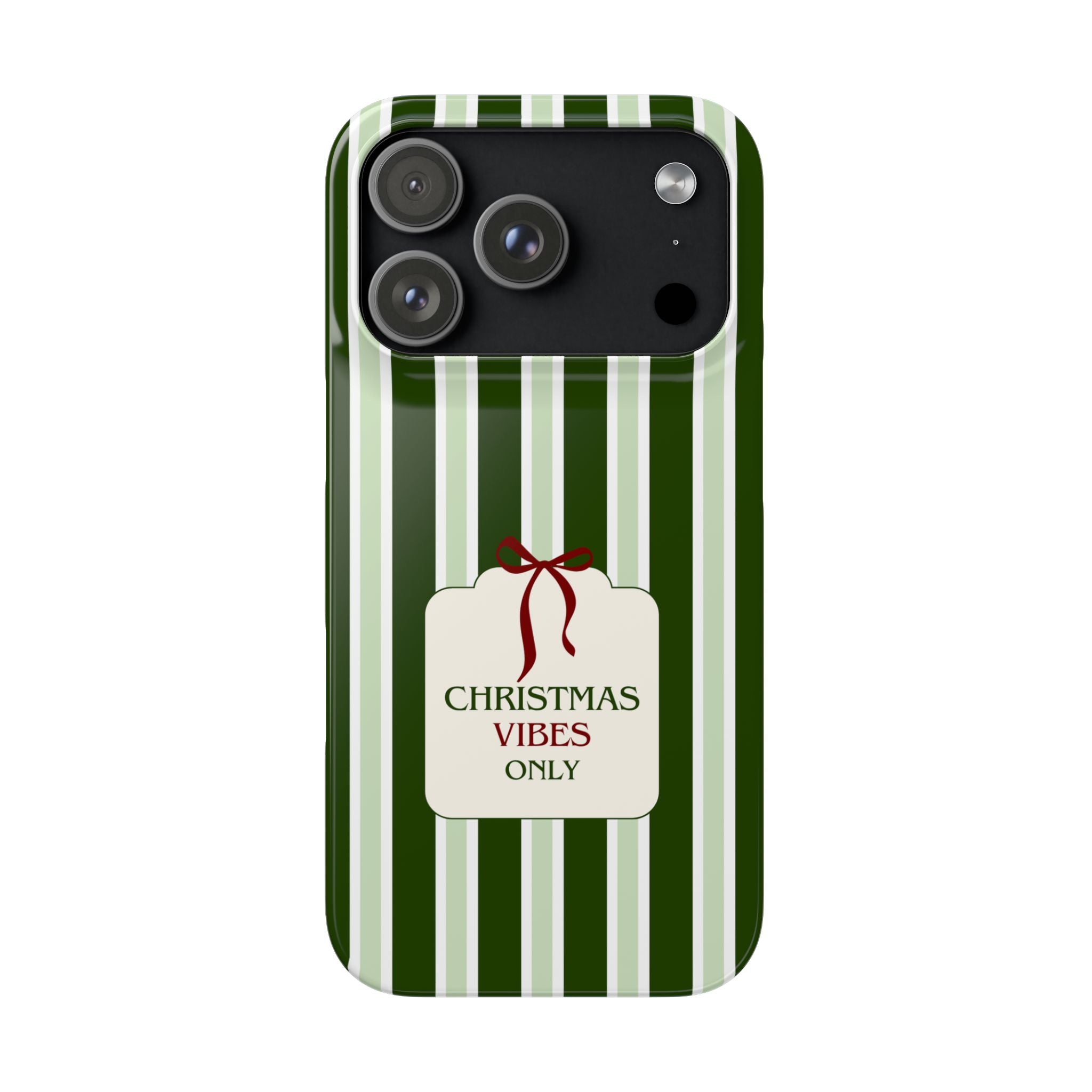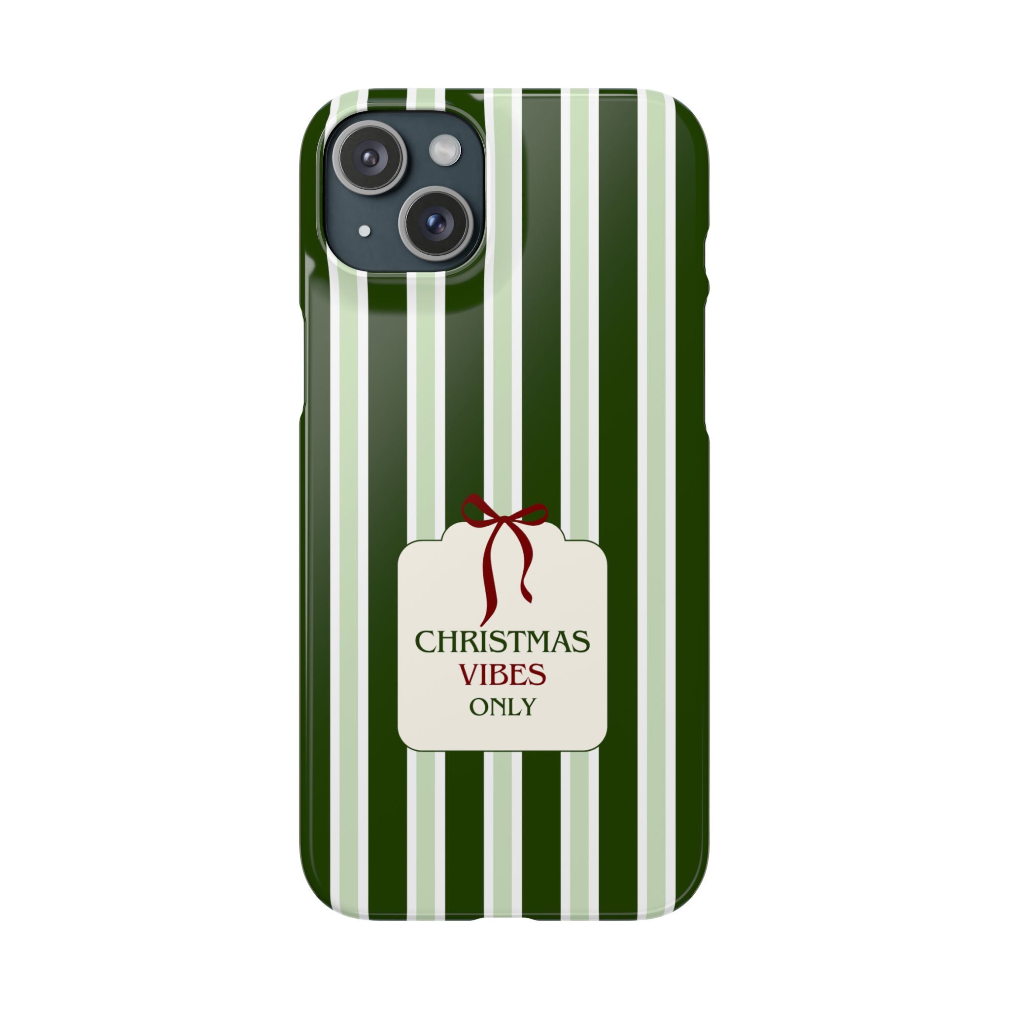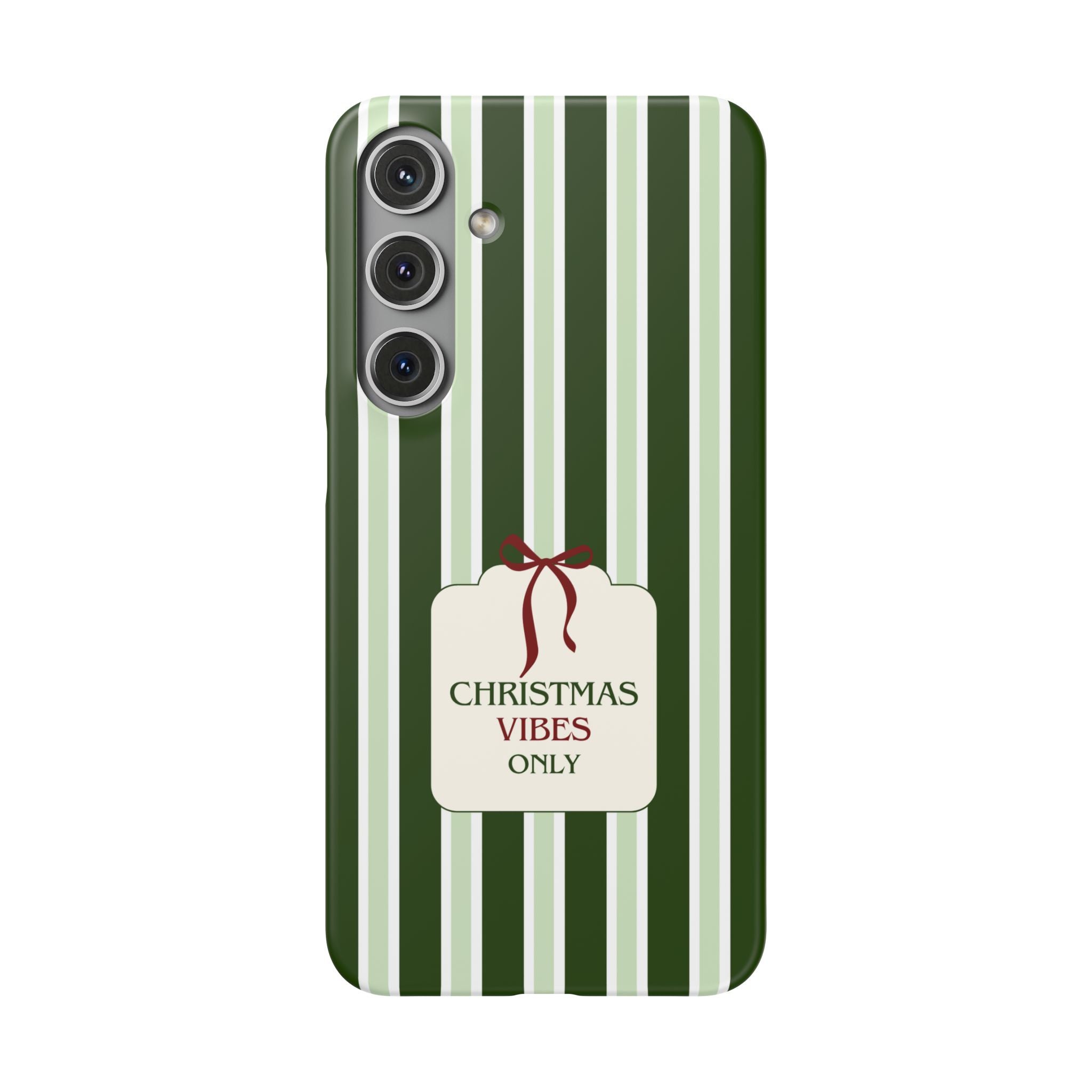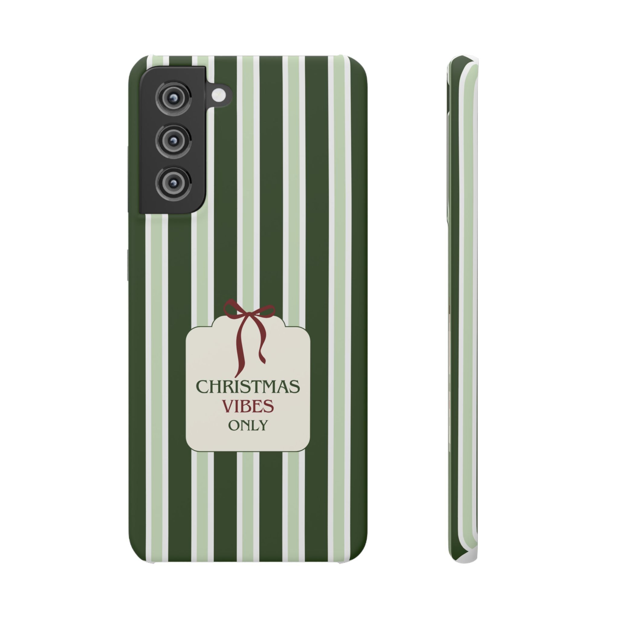 Christmas Vibes Only – schlank & stilvoll, schützt dein Smartphone zuverlässig vor Kratzern & leichten Stößen und bringt mit den frischen grünen Streifen und dem „Christmas Vibes Only“-Schriftzug moderne, entspannte Weihnachtsstimmung in deinen Alltag.