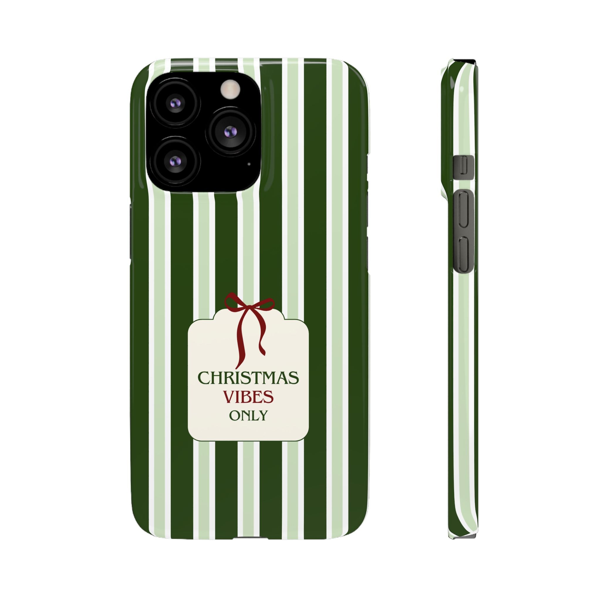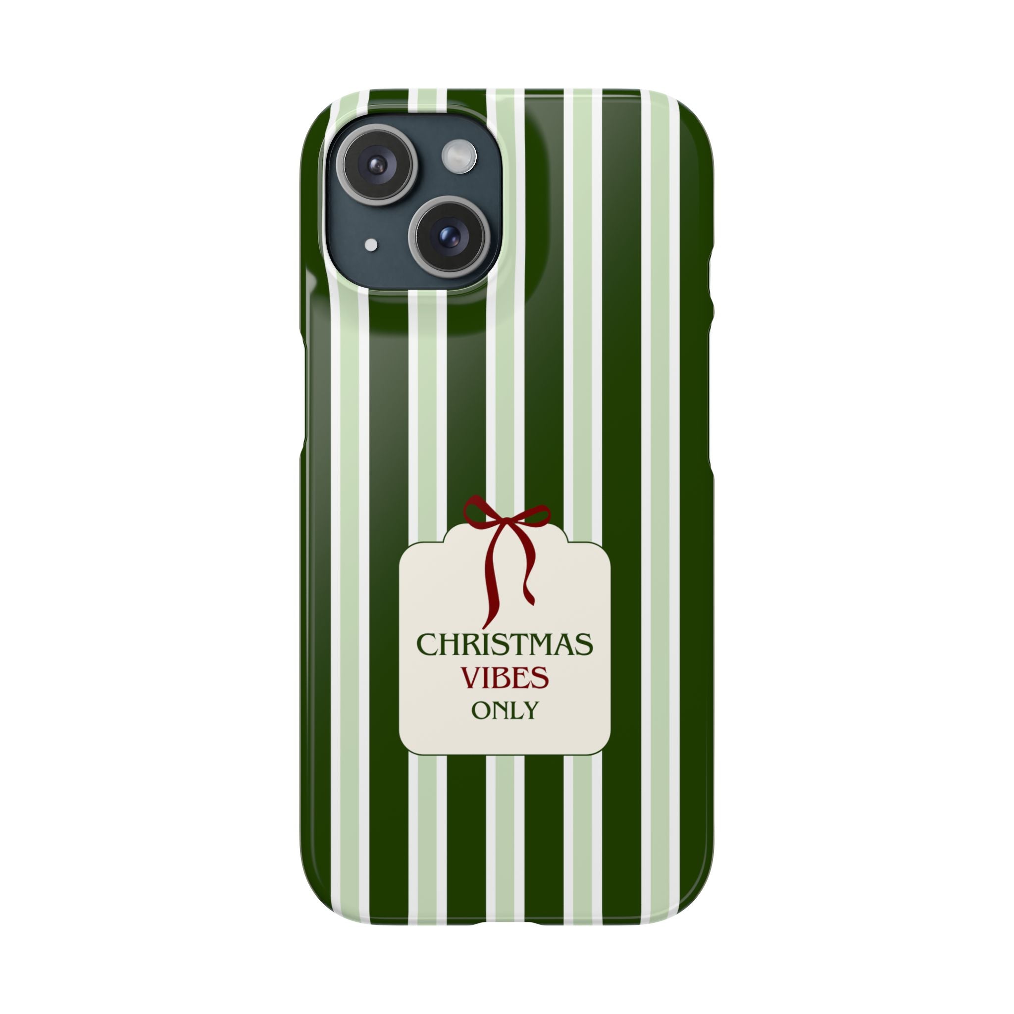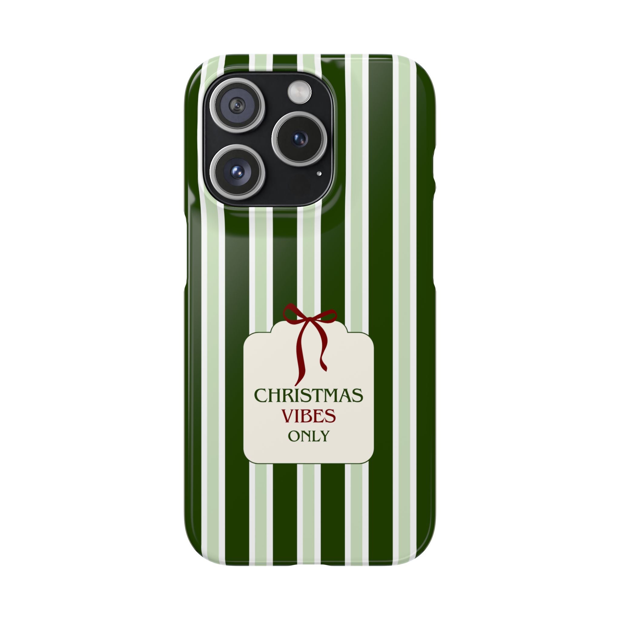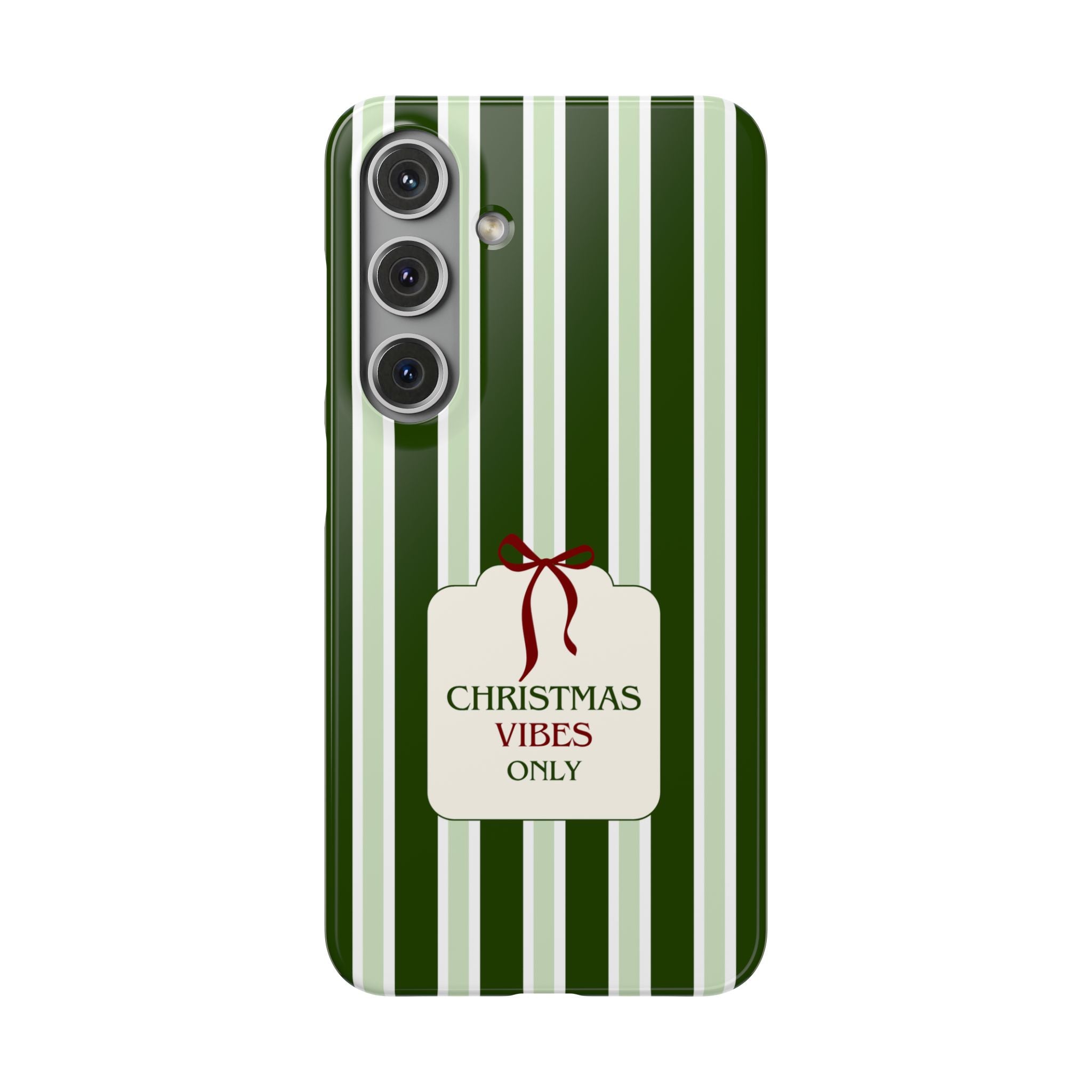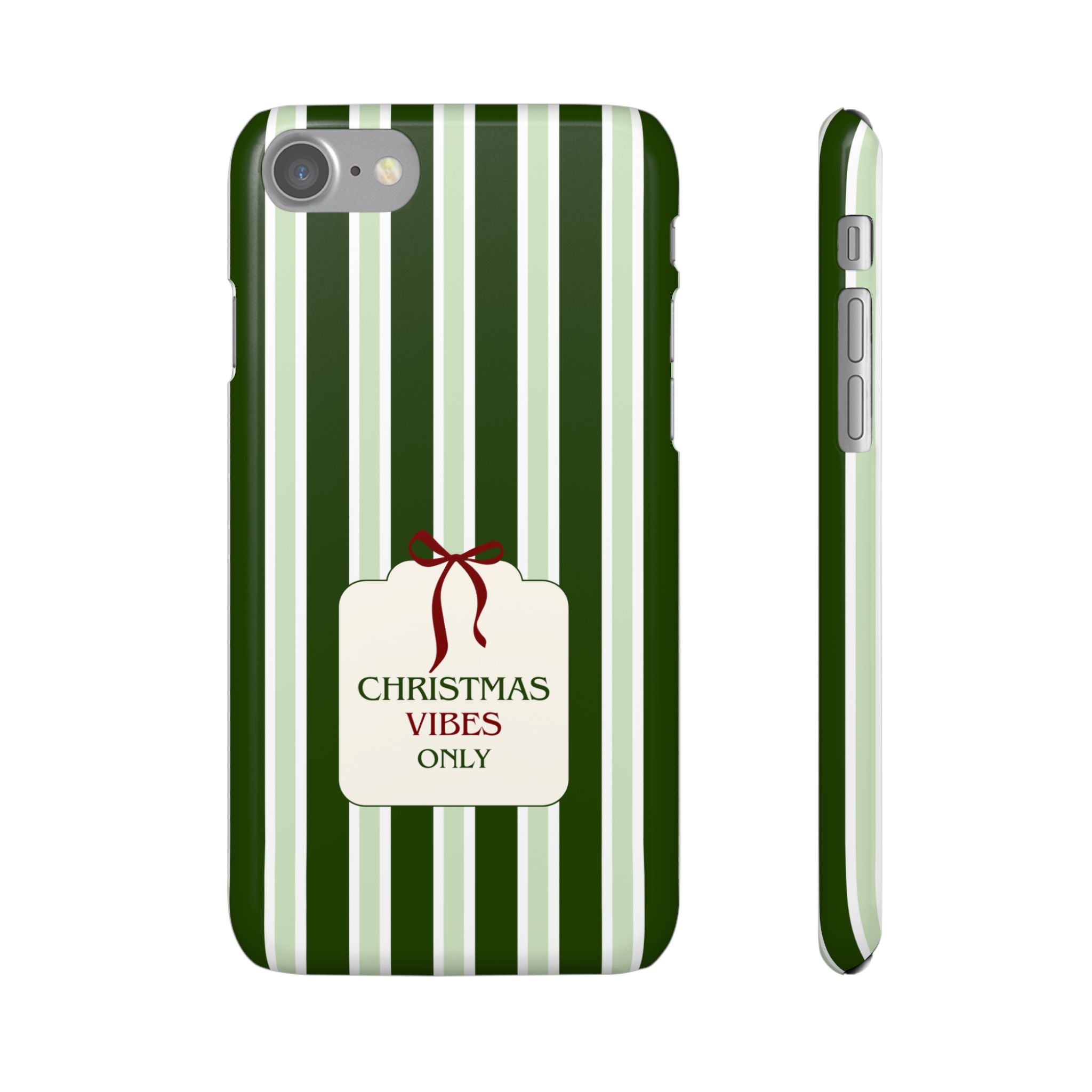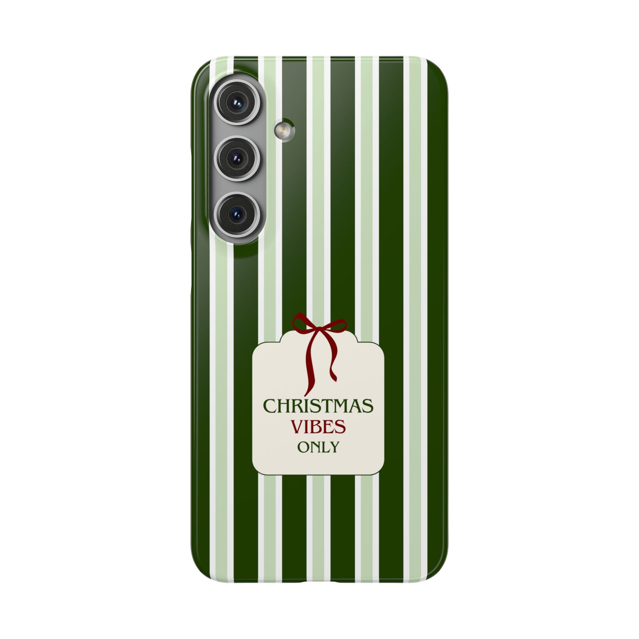 Christmas Vibes Only – schlank & stilvoll, schützt dein Smartphone zuverlässig vor Kratzern & leichten Stößen und bringt mit den frischen grünen Streifen und dem „Christmas Vibes Only“-Schriftzug moderne, entspannte Weihnachtsstimmung in deinen Alltag.