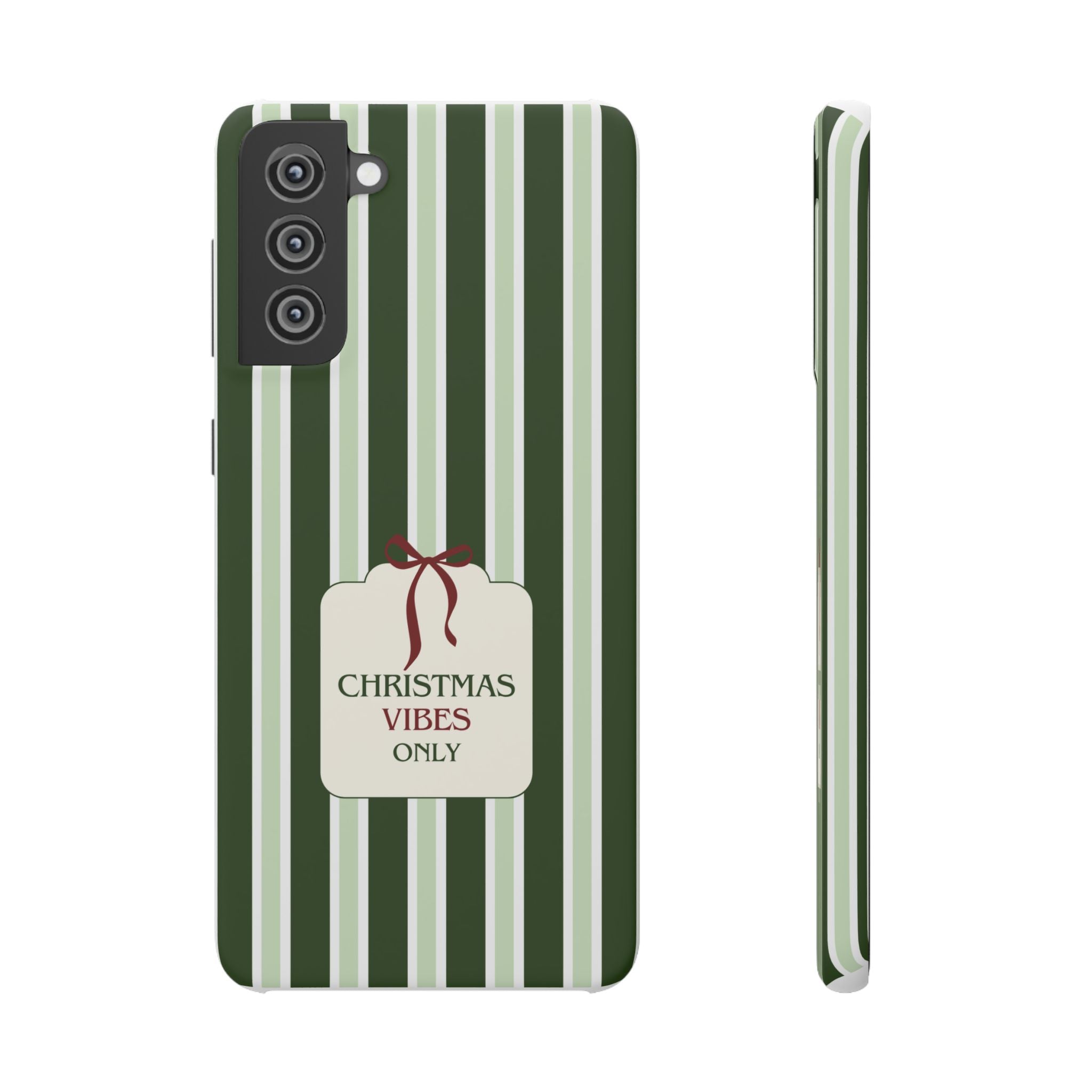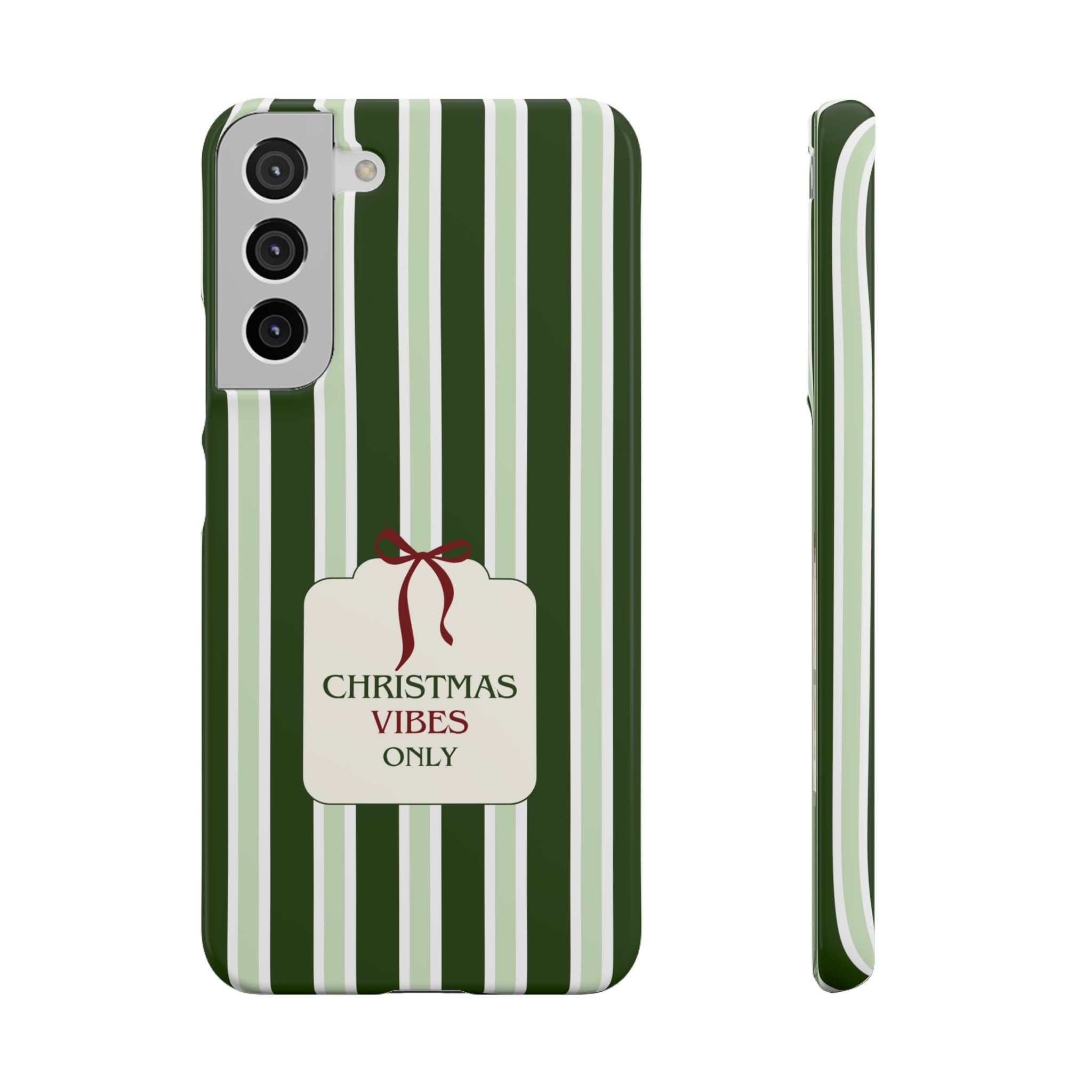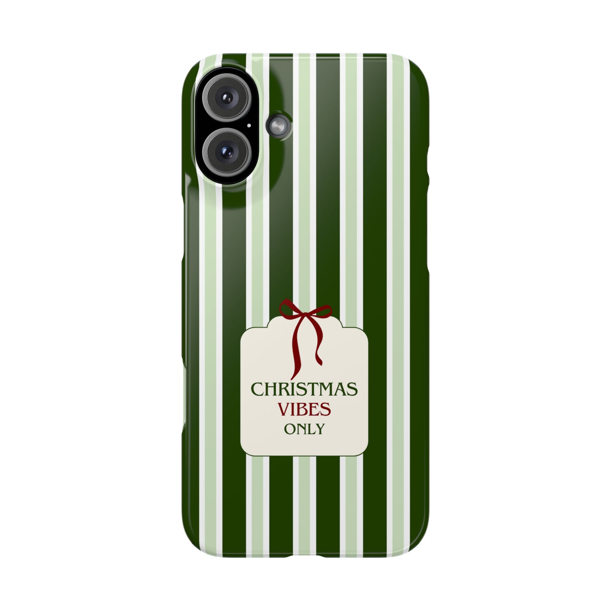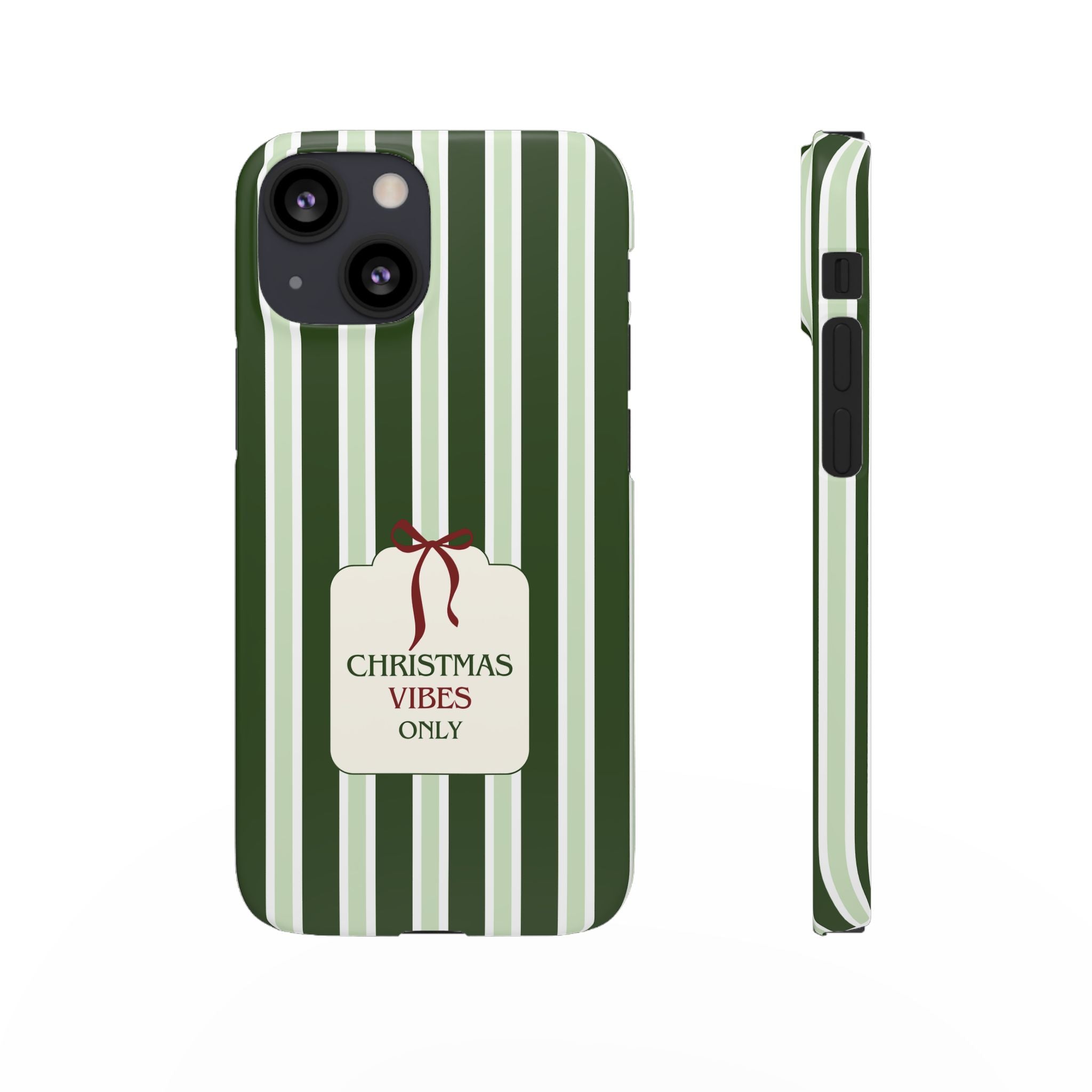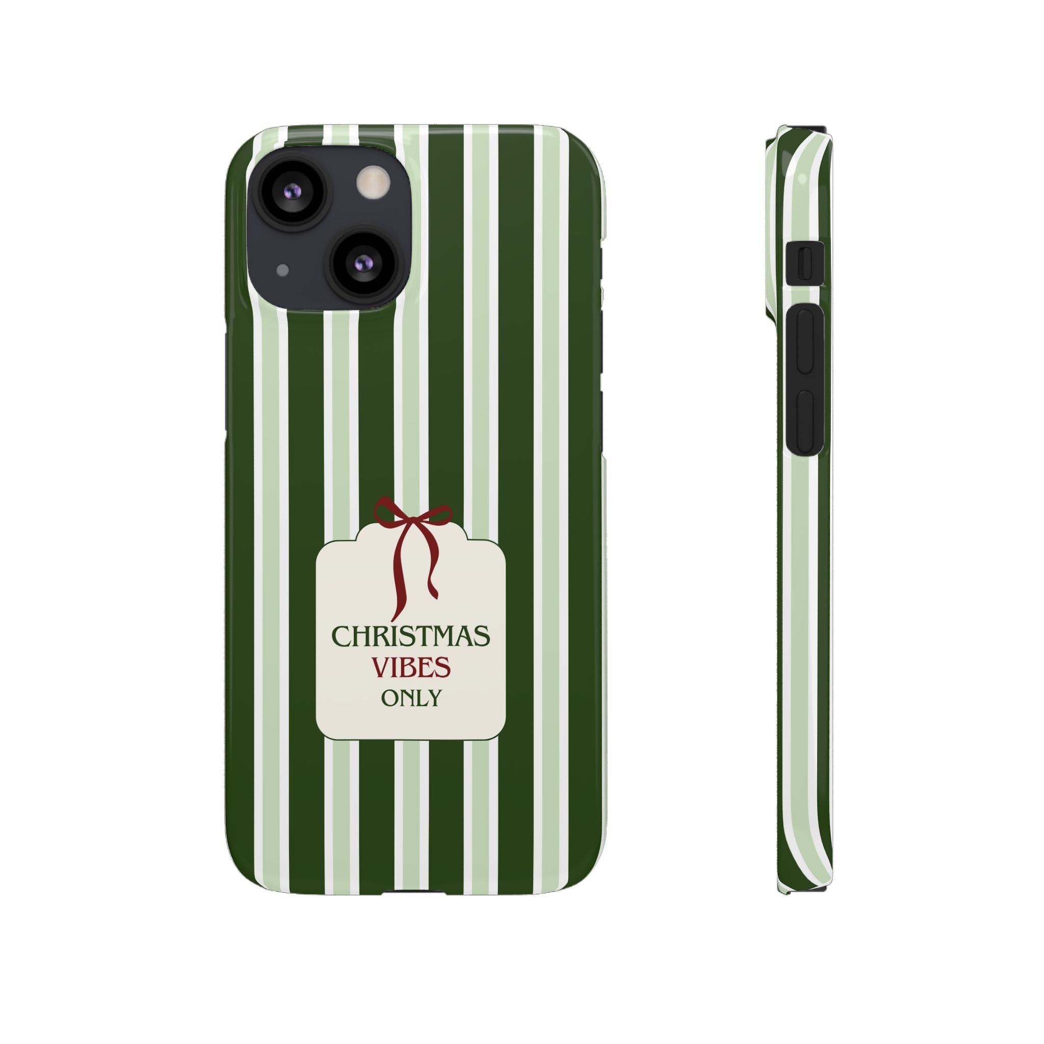 Christmas Vibes Only – schlank & stilvoll, schützt dein Smartphone zuverlässig vor Kratzern & leichten Stößen und bringt mit den frischen grünen Streifen und dem „Christmas Vibes Only“-Schriftzug moderne, entspannte Weihnachtsstimmung in deinen Alltag.