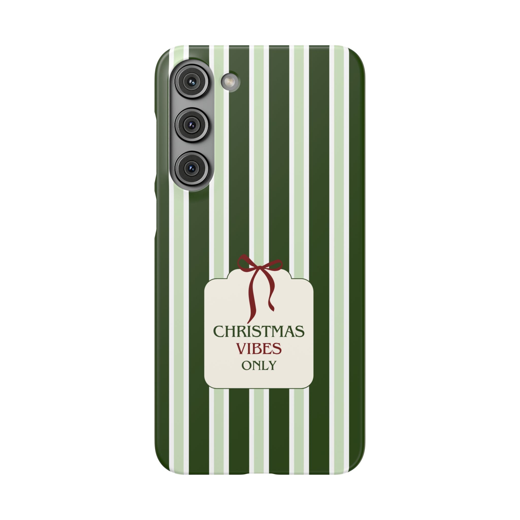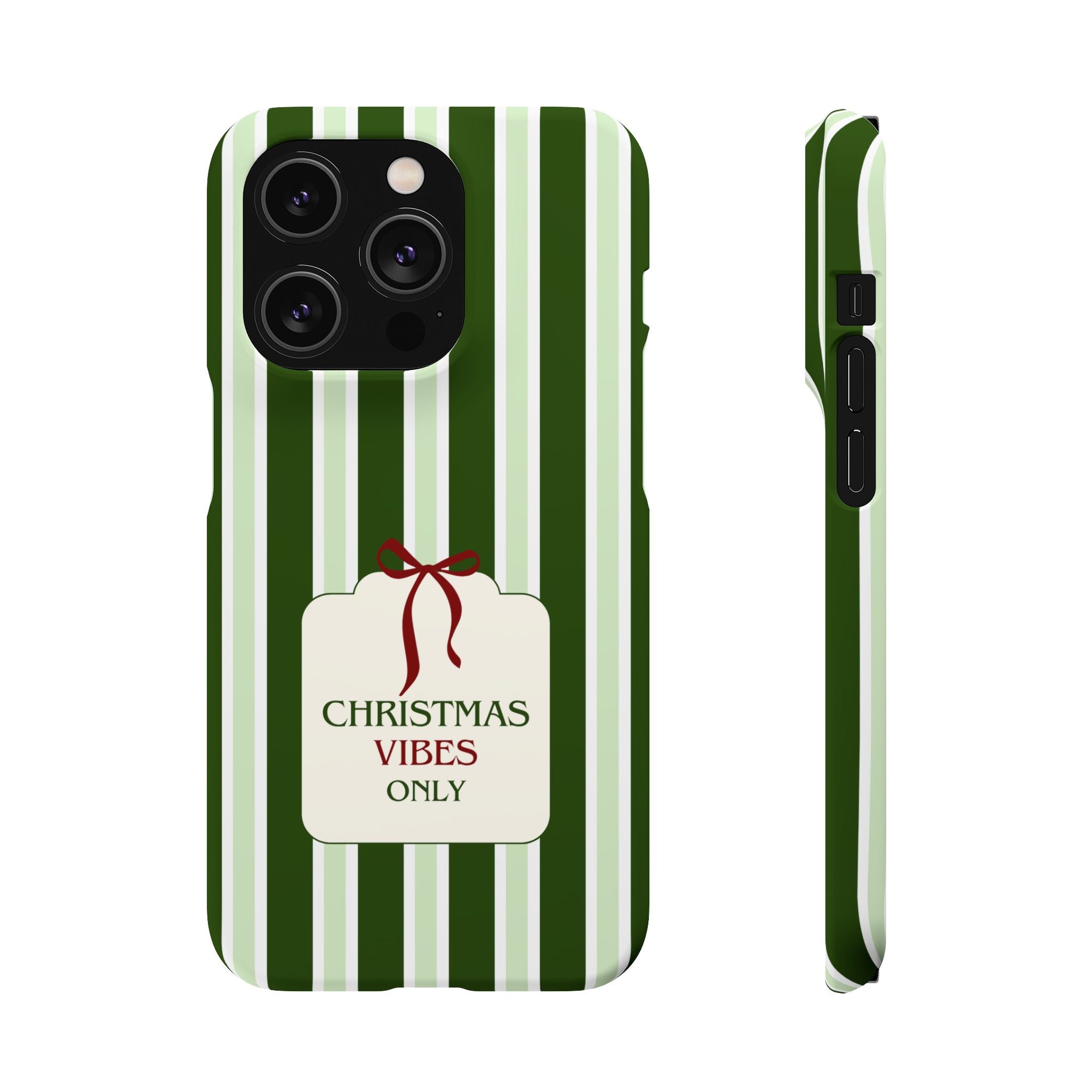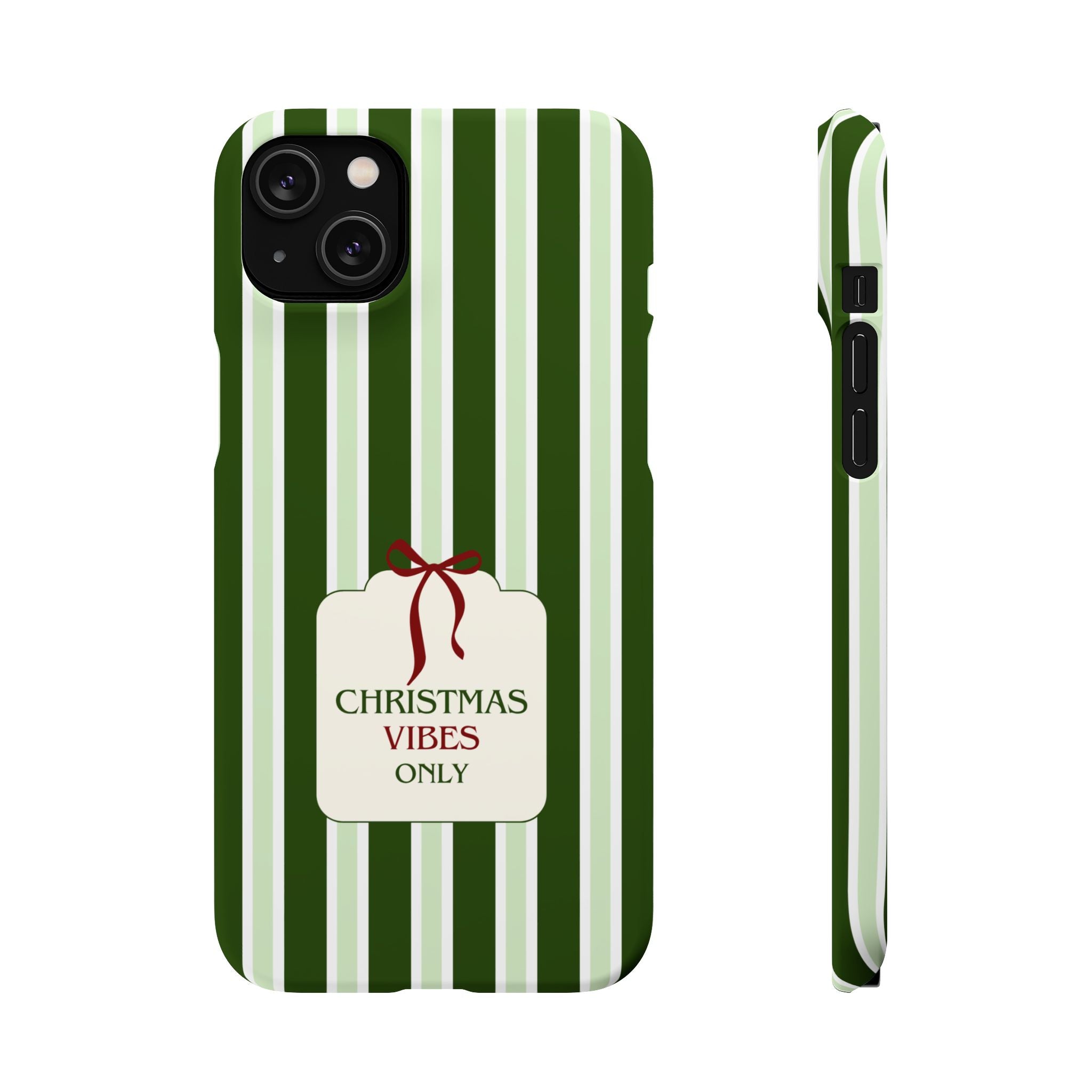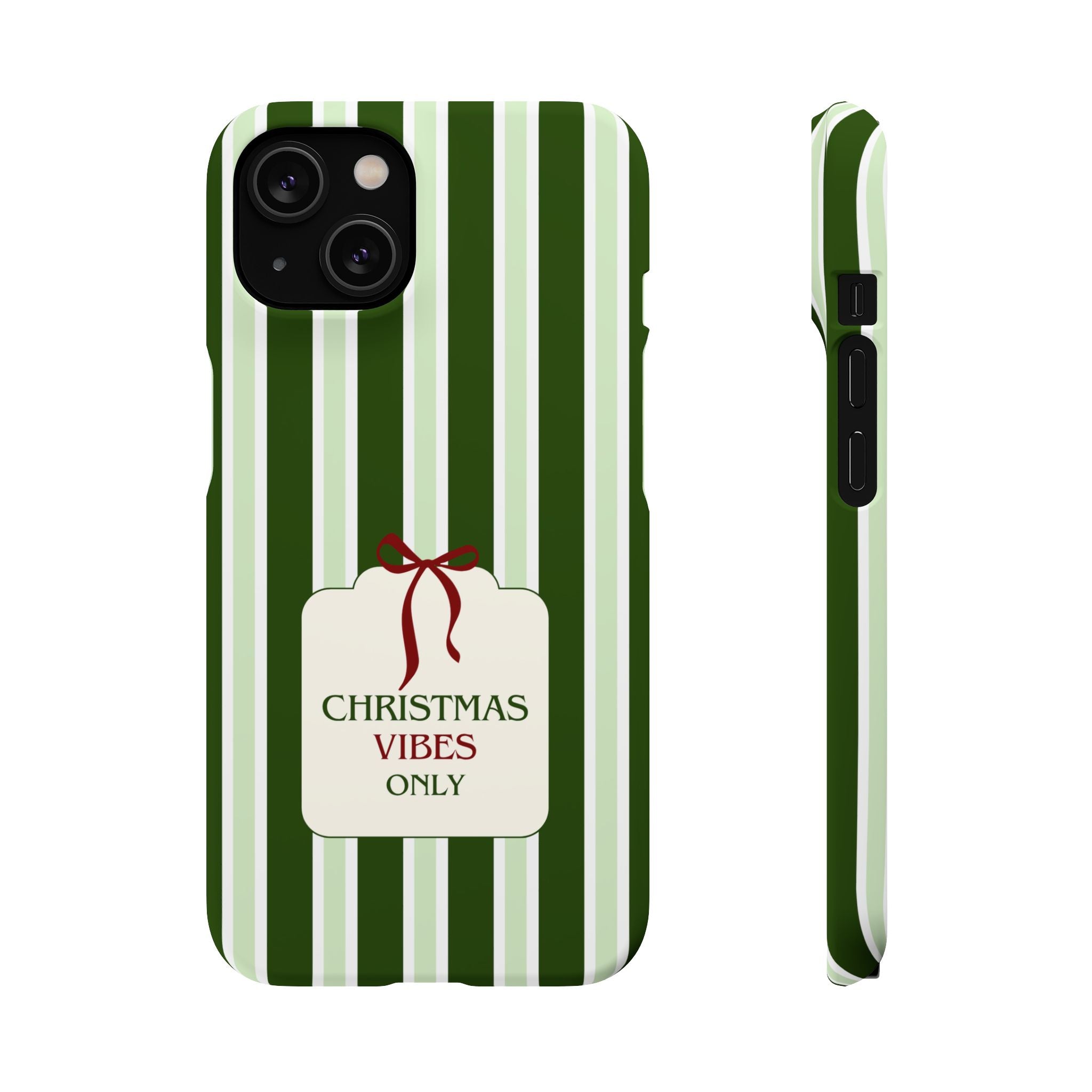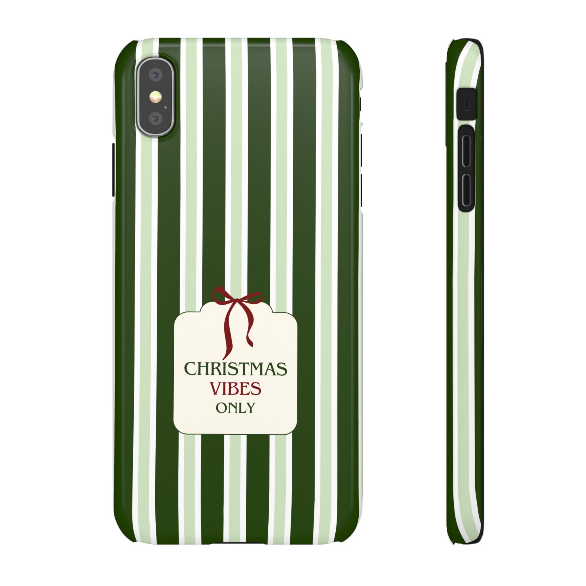 Christmas Vibes Only – schlank & stilvoll, schützt dein Smartphone zuverlässig vor Kratzern & leichten Stößen und bringt mit den frischen grünen Streifen und dem „Christmas Vibes Only“-Schriftzug moderne, entspannte Weihnachtsstimmung in deinen Alltag.