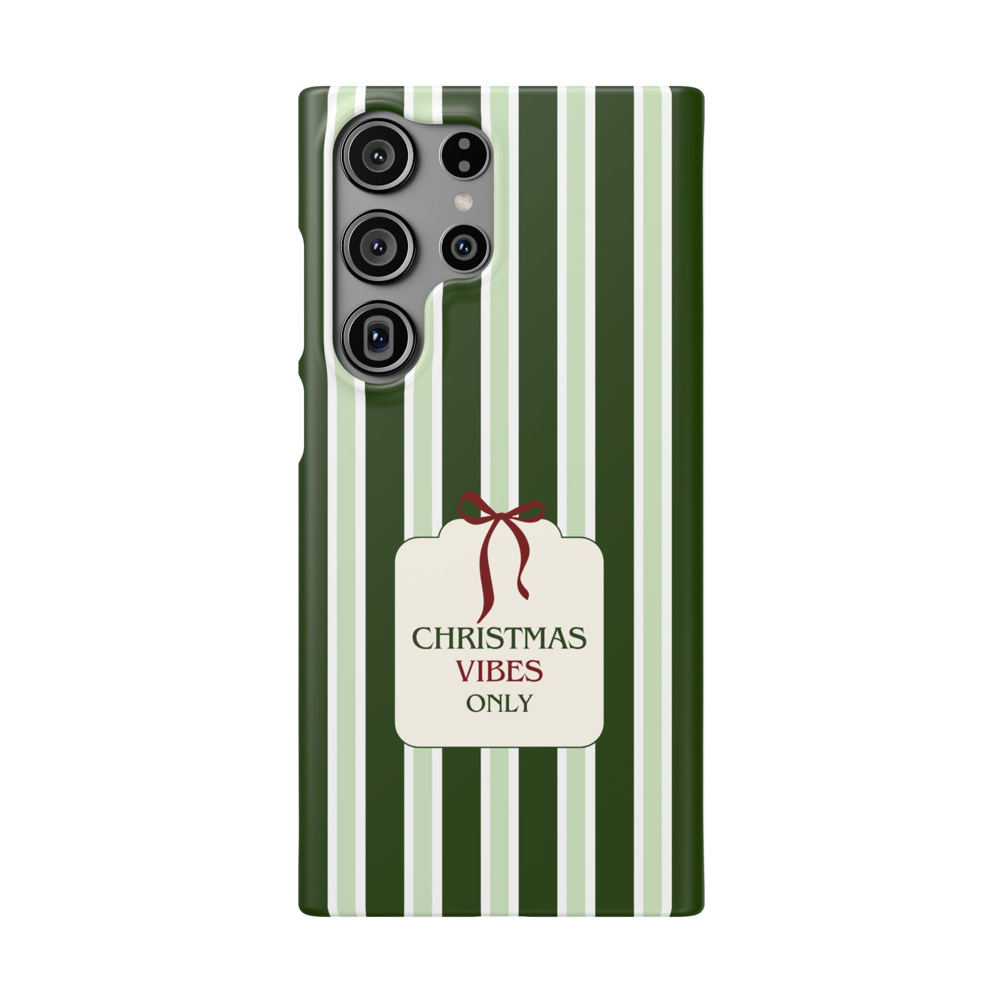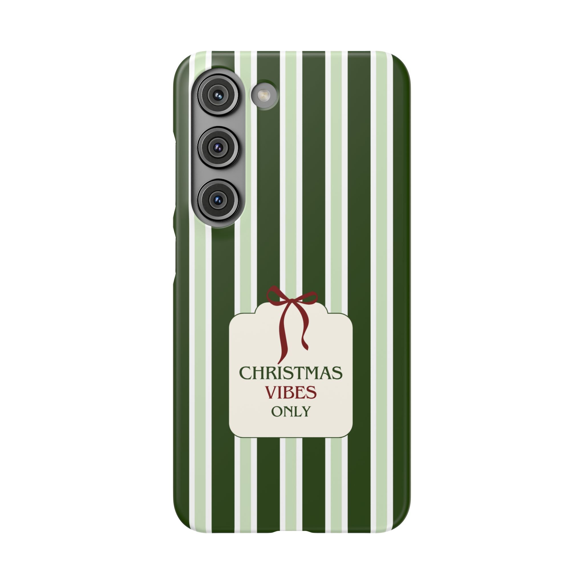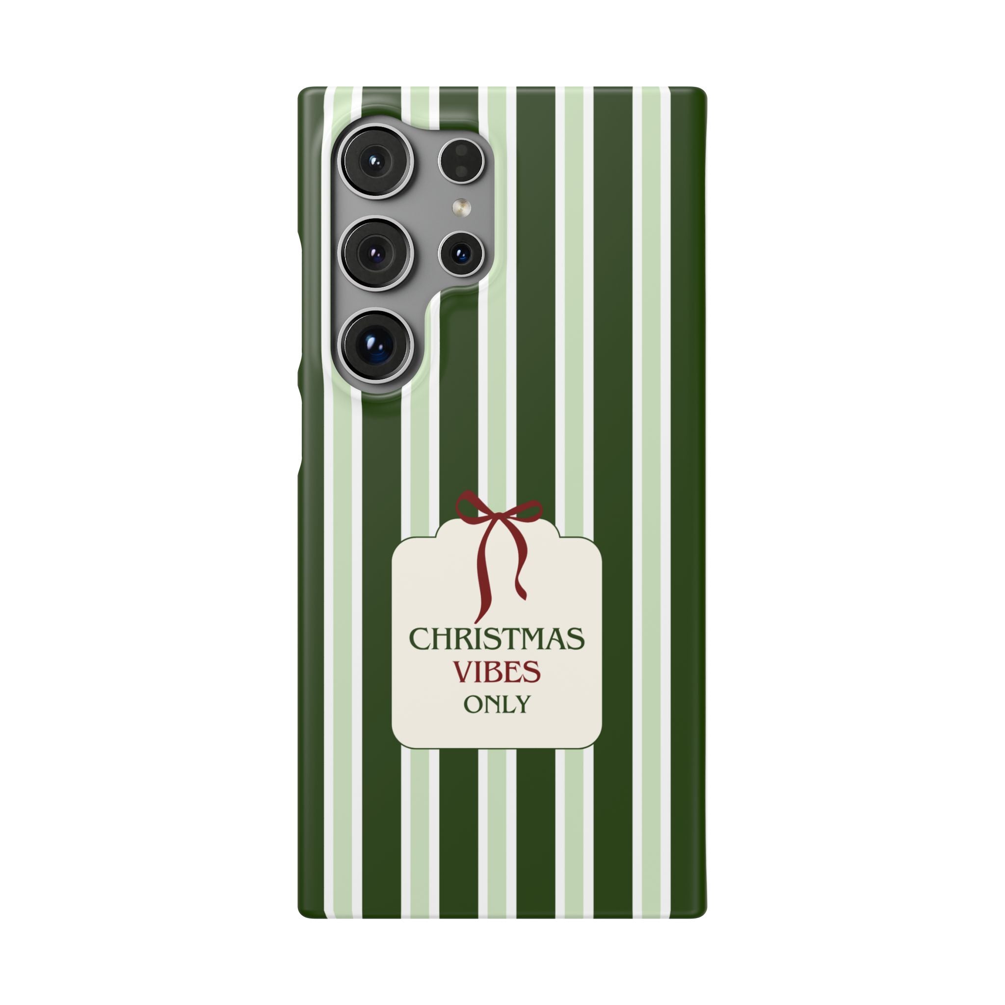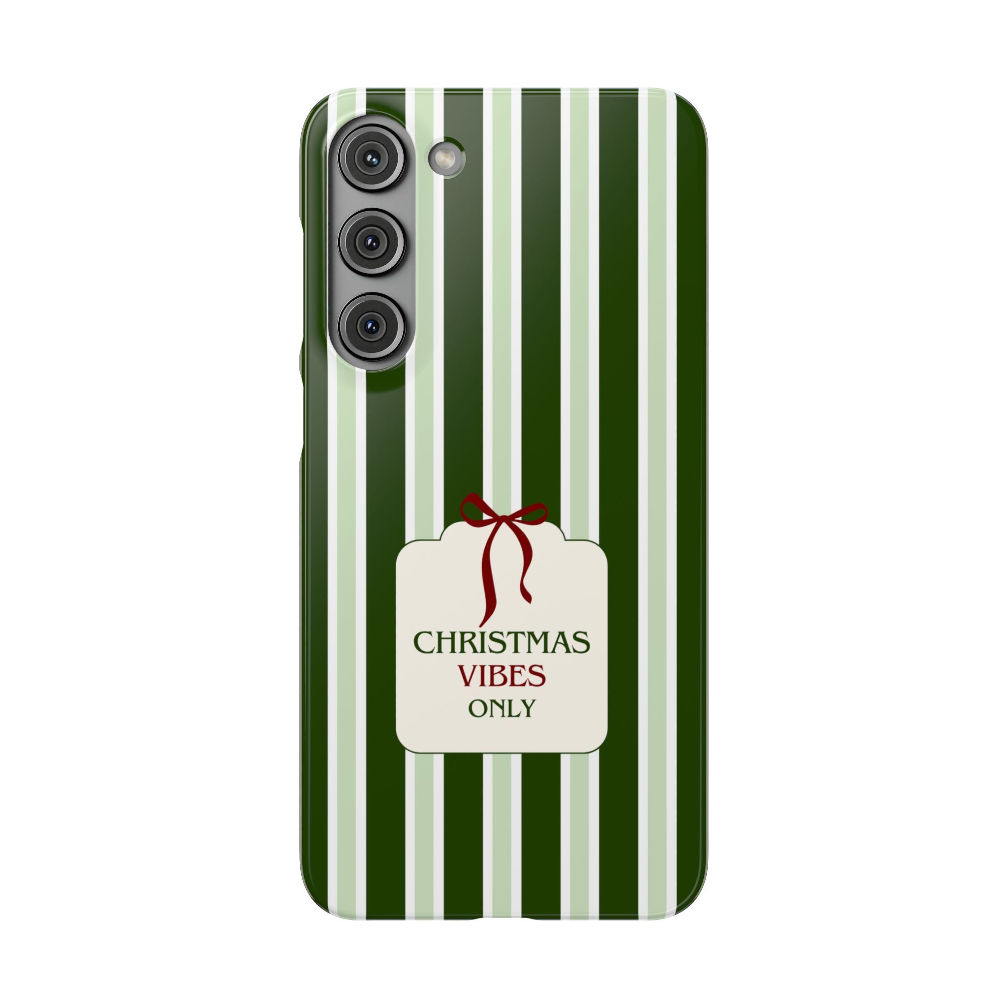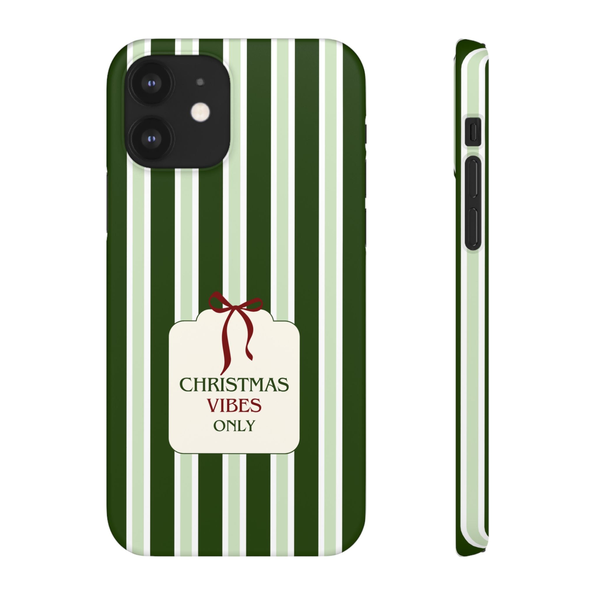 Christmas Vibes Only – schlank & stilvoll, schützt dein Smartphone zuverlässig vor Kratzern & leichten Stößen und bringt mit den frischen grünen Streifen und dem „Christmas Vibes Only“-Schriftzug moderne, entspannte Weihnachtsstimmung in deinen Alltag.