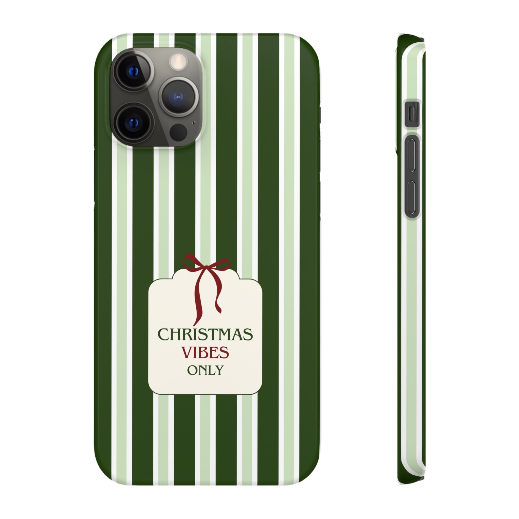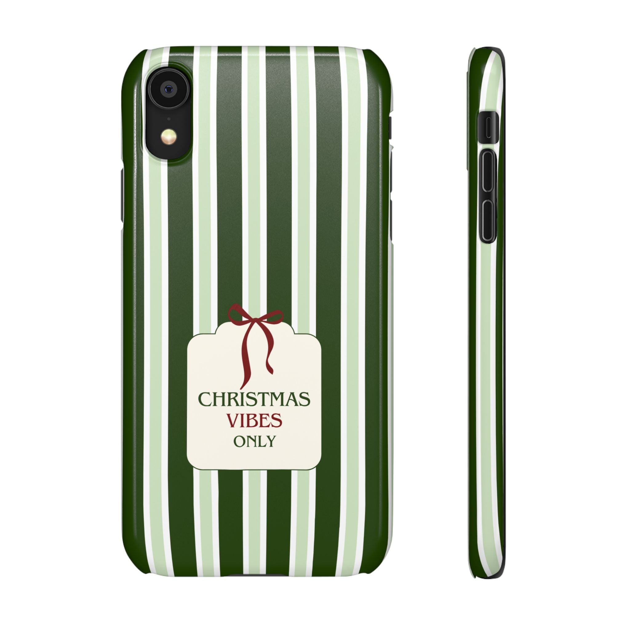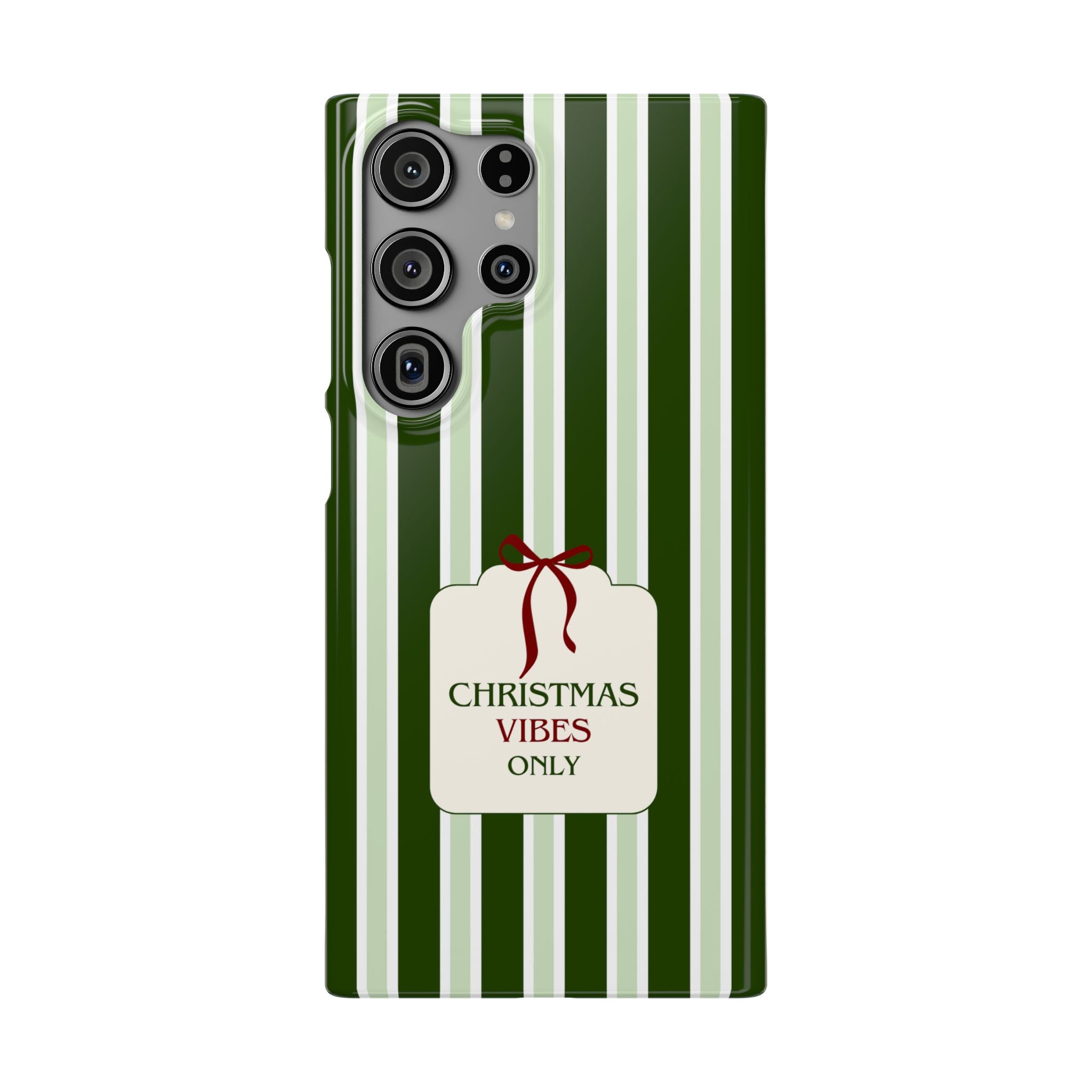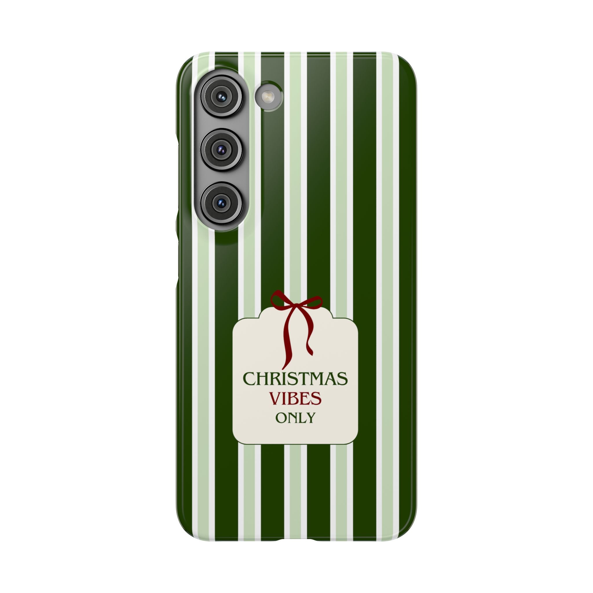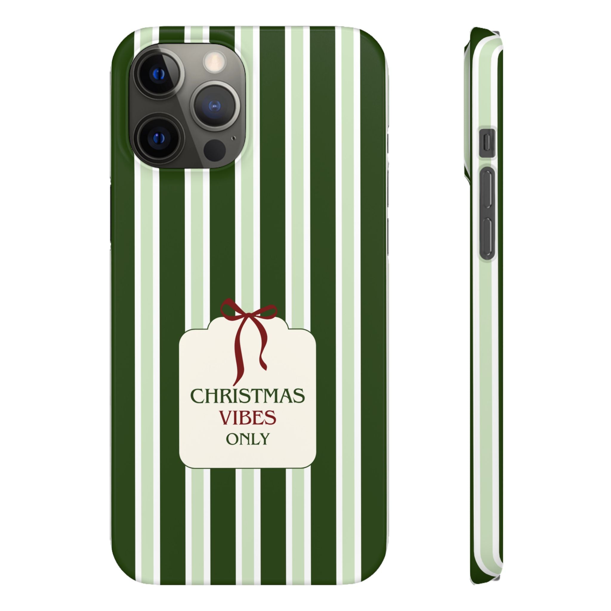 Christmas Vibes Only – schlank & stilvoll, schützt dein Smartphone zuverlässig vor Kratzern & leichten Stößen und bringt mit den frischen grünen Streifen und dem „Christmas Vibes Only“-Schriftzug moderne, entspannte Weihnachtsstimmung in deinen Alltag.