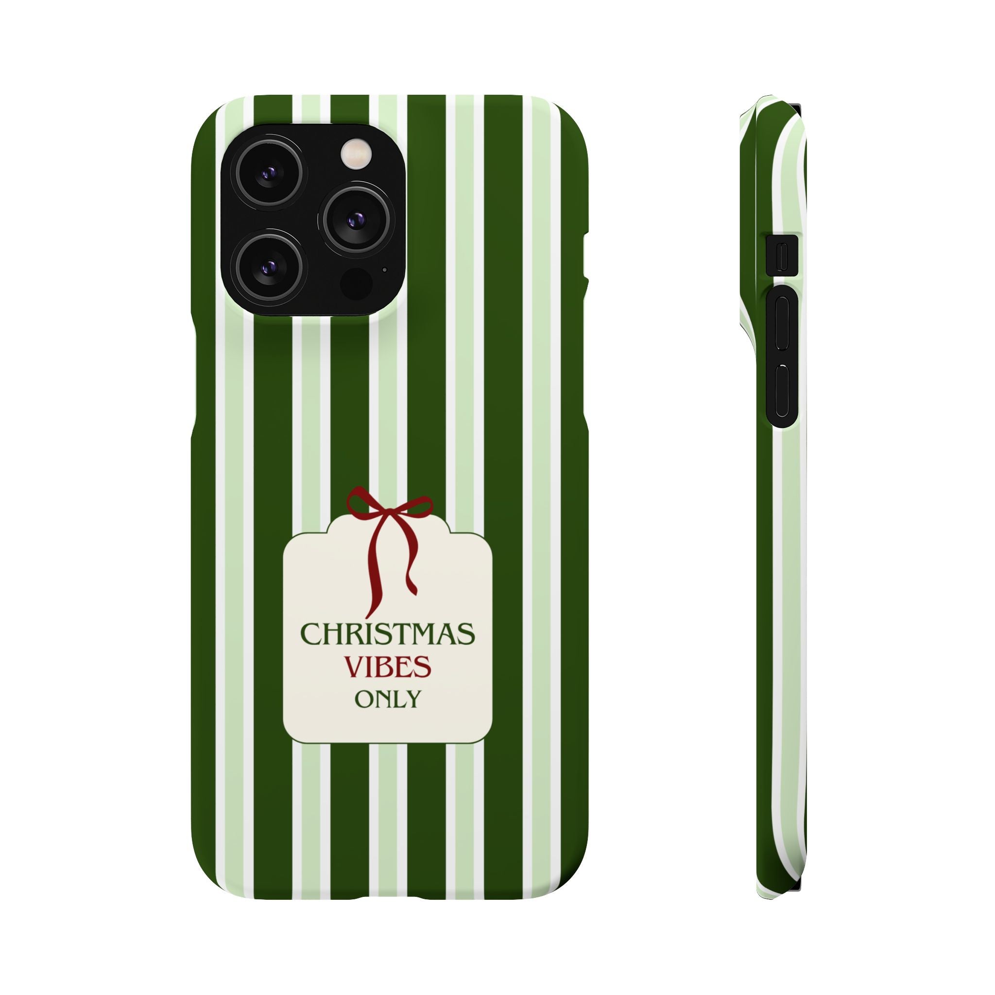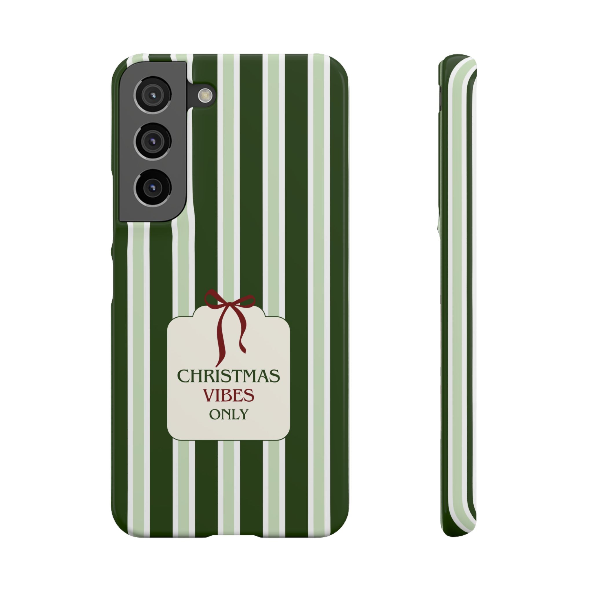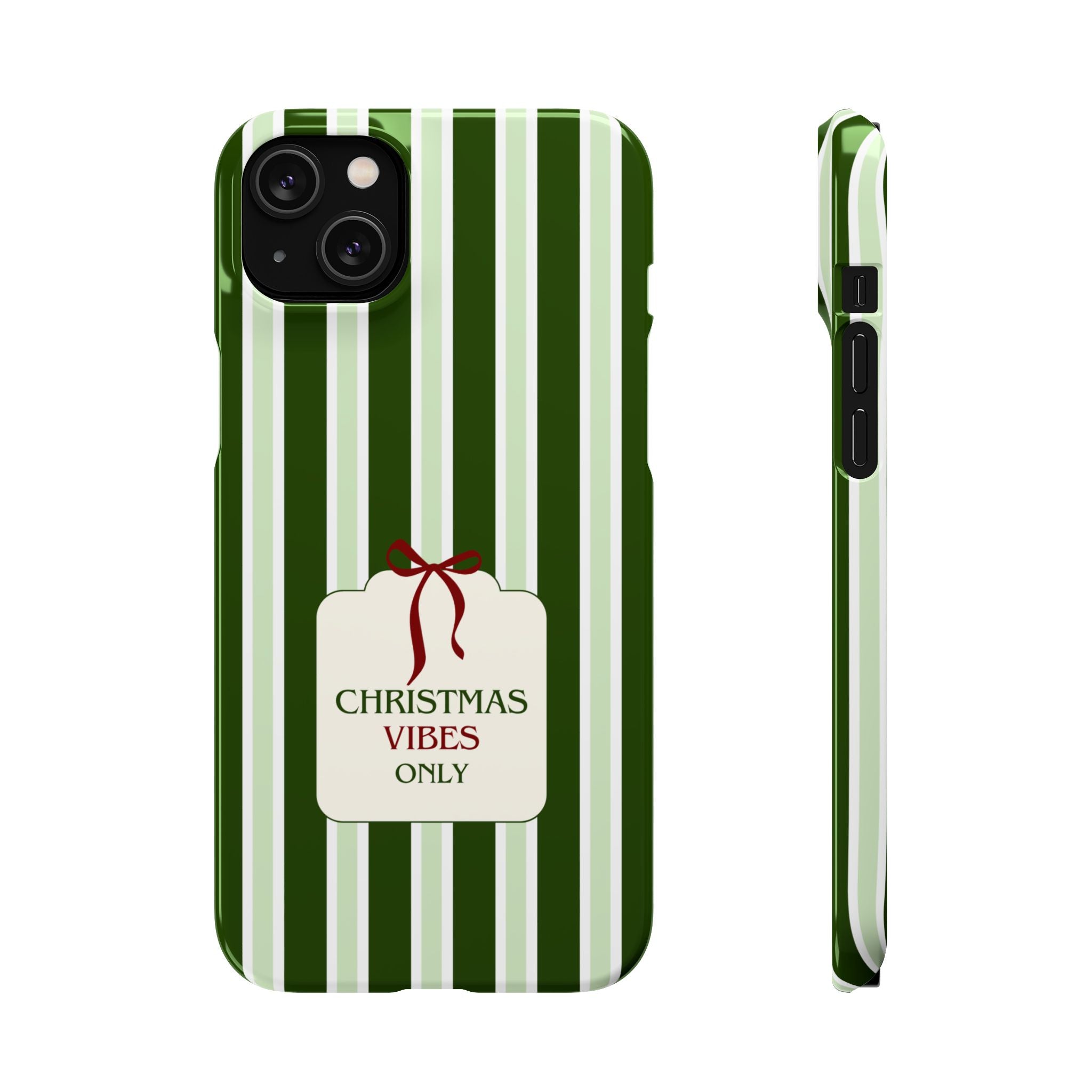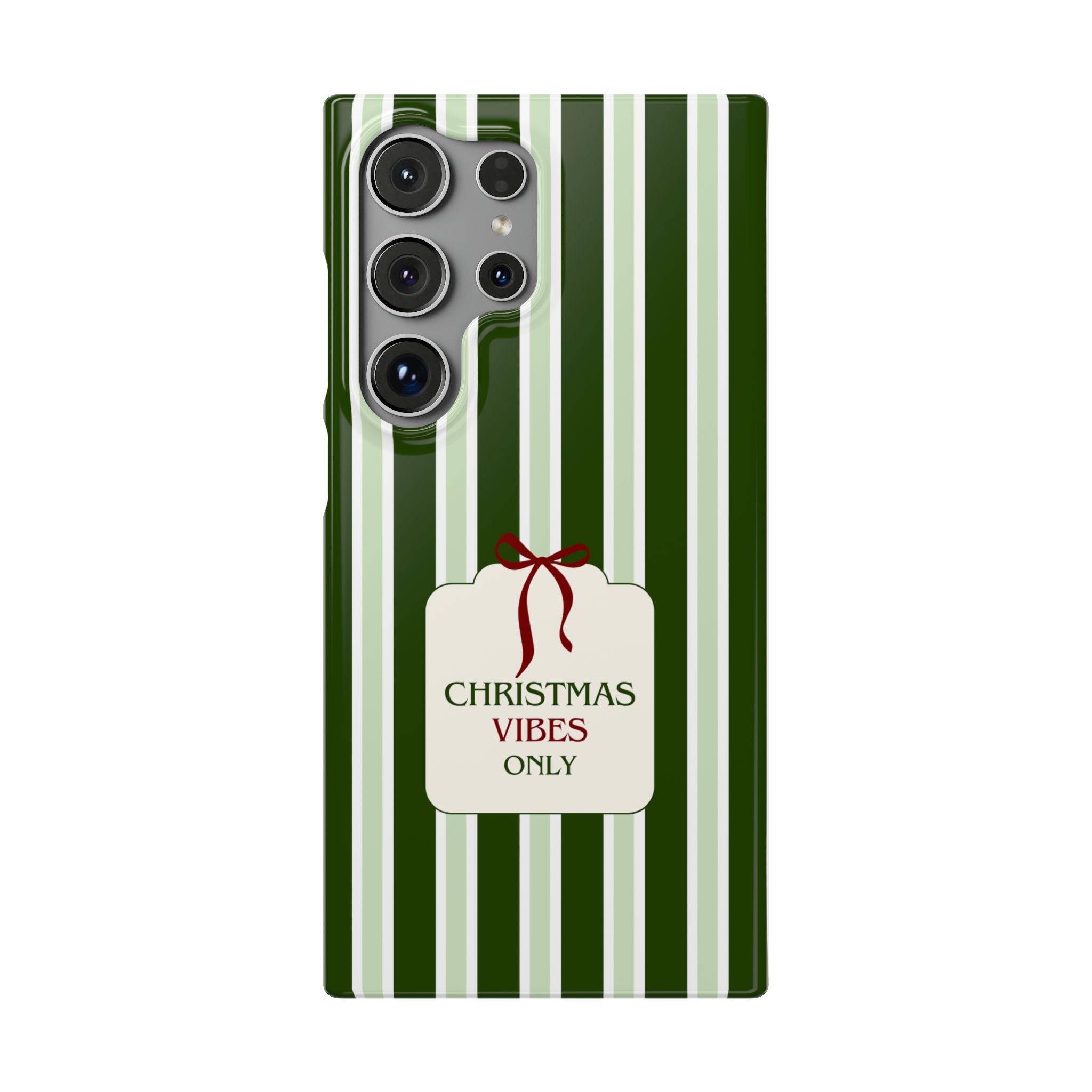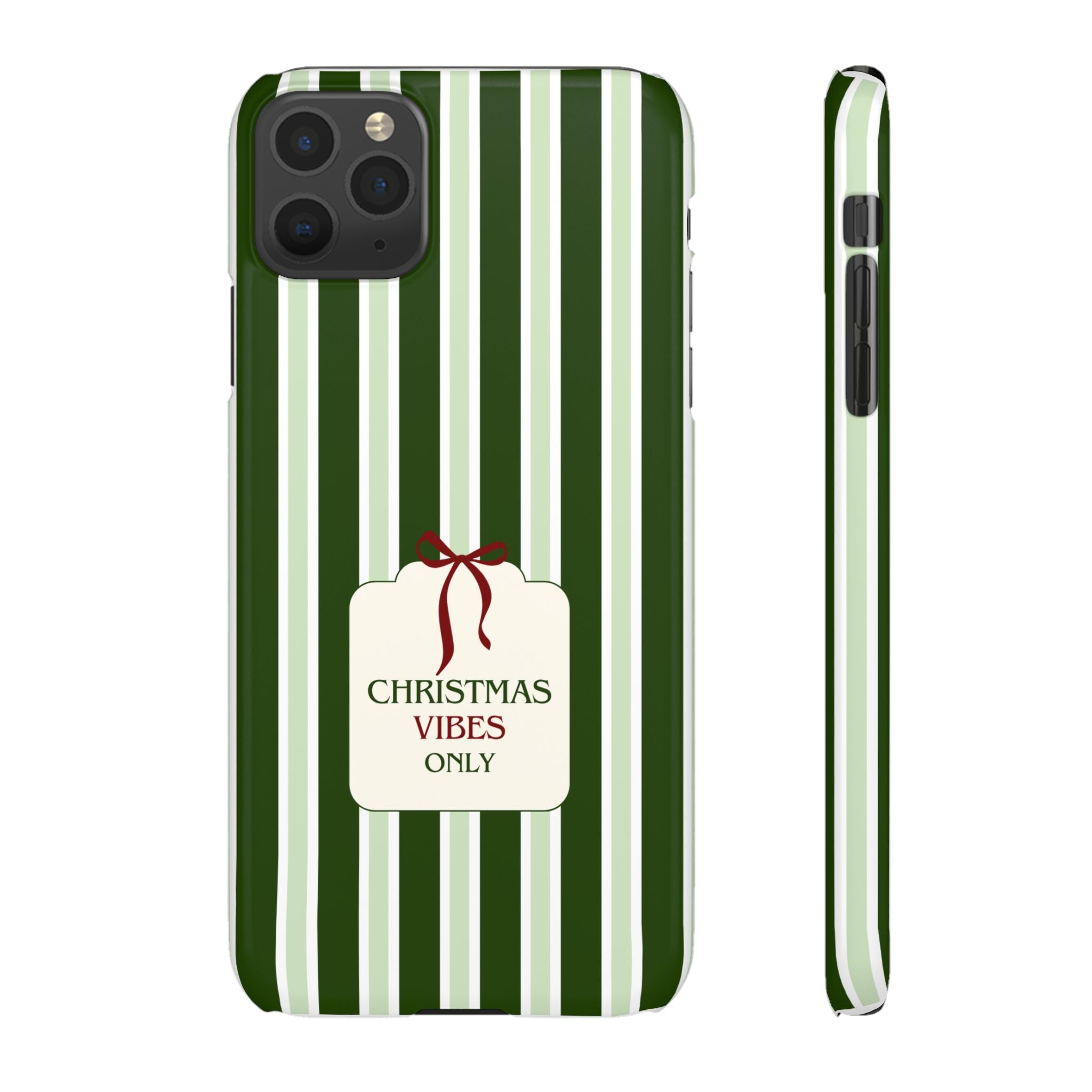 Christmas Vibes Only – schlank & stilvoll, schützt dein Smartphone zuverlässig vor Kratzern & leichten Stößen und bringt mit den frischen grünen Streifen und dem „Christmas Vibes Only“-Schriftzug moderne, entspannte Weihnachtsstimmung in deinen Alltag.