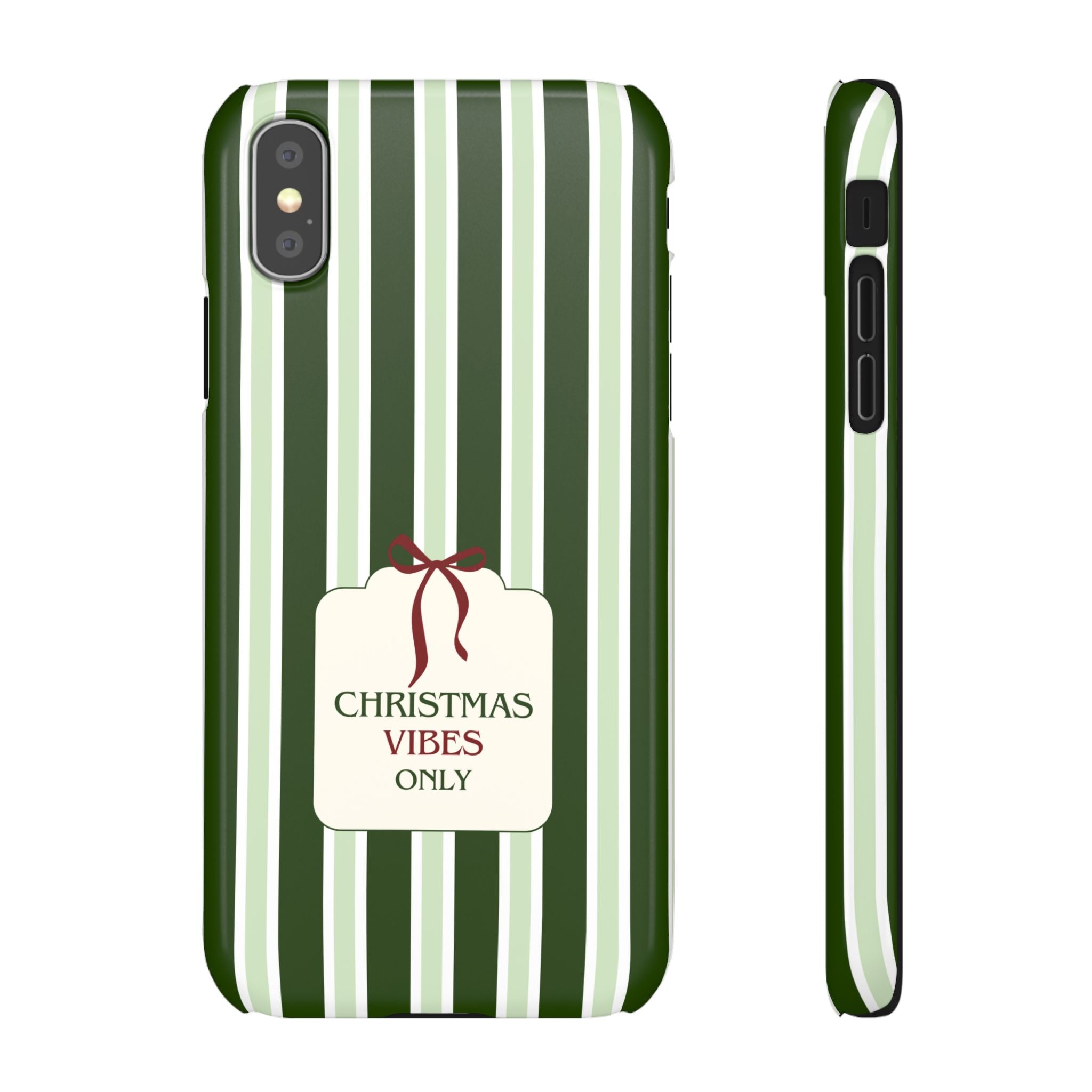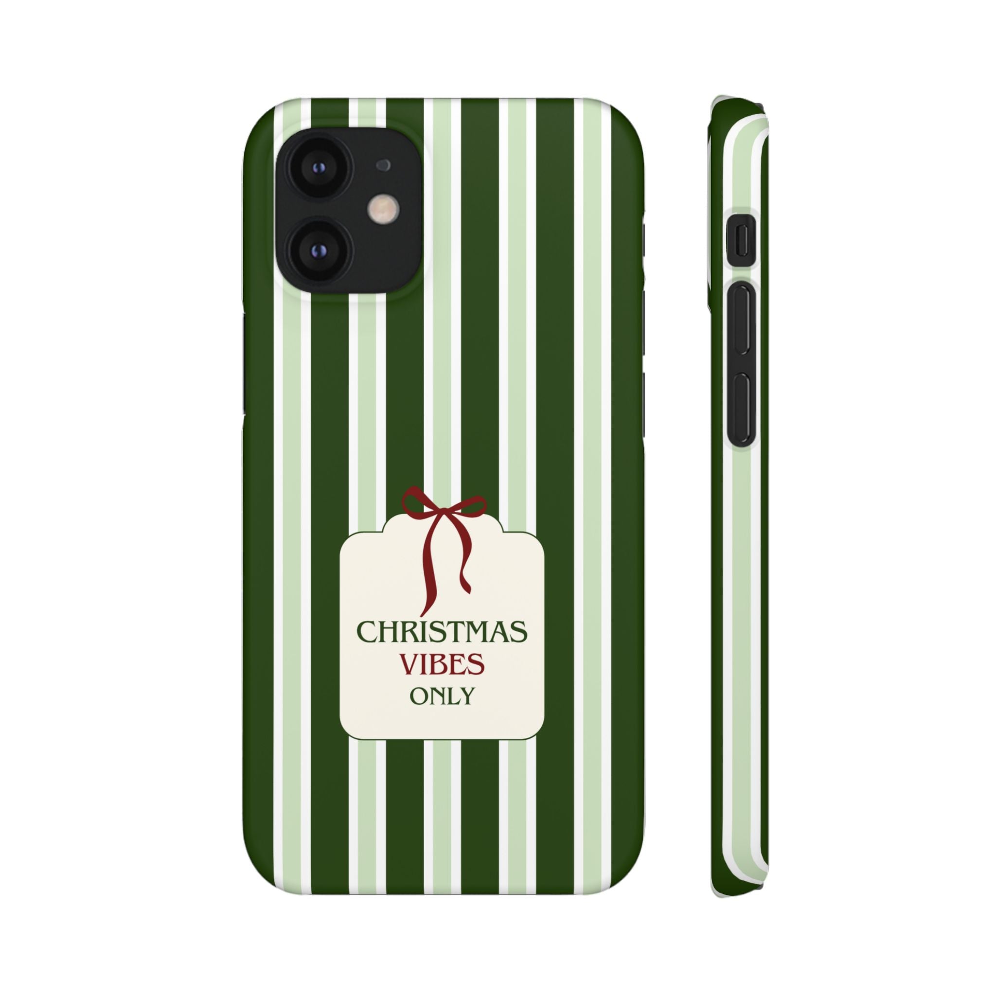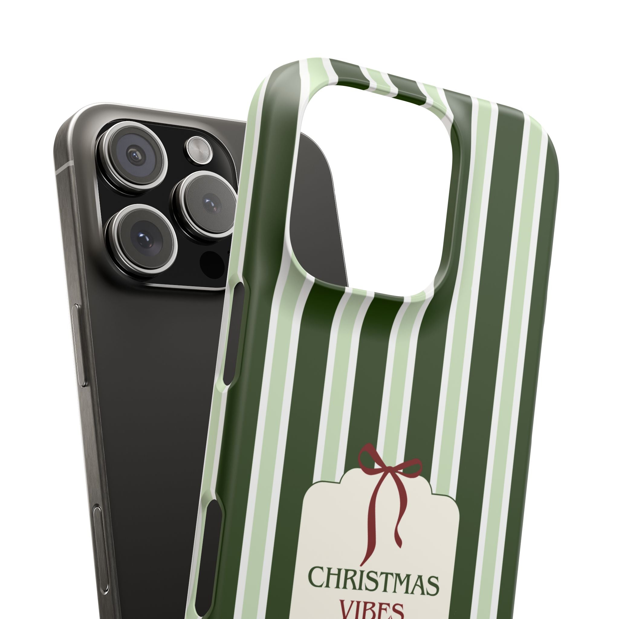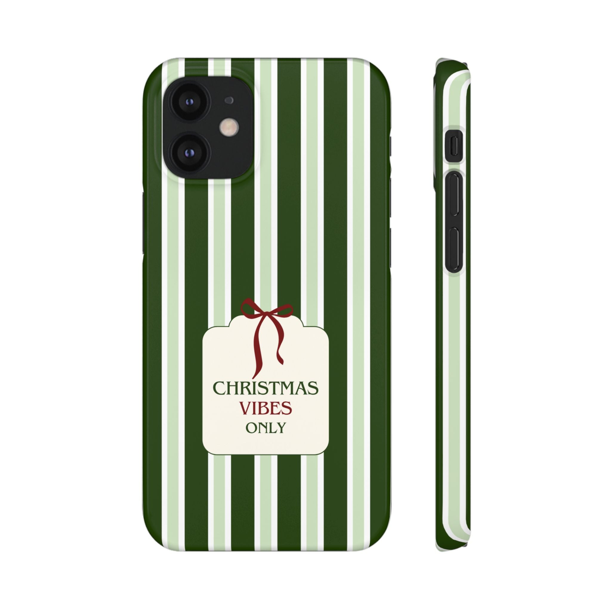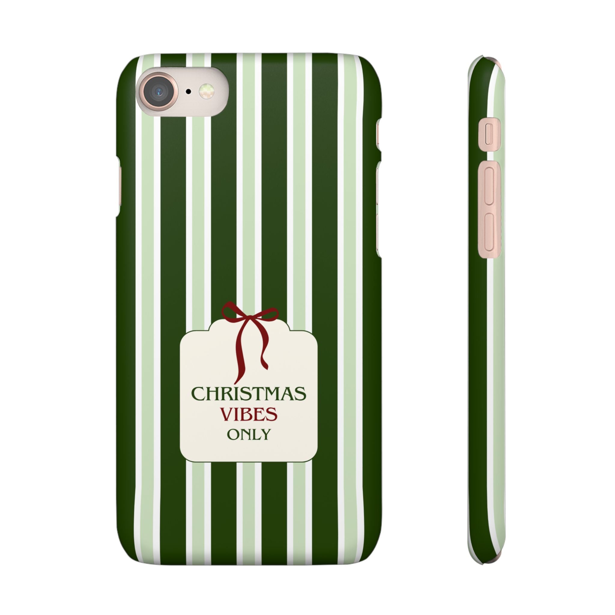 Christmas Vibes Only – schlank & stilvoll, schützt dein Smartphone zuverlässig vor Kratzern & leichten Stößen und bringt mit den frischen grünen Streifen und dem „Christmas Vibes Only“-Schriftzug moderne, entspannte Weihnachtsstimmung in deinen Alltag.
