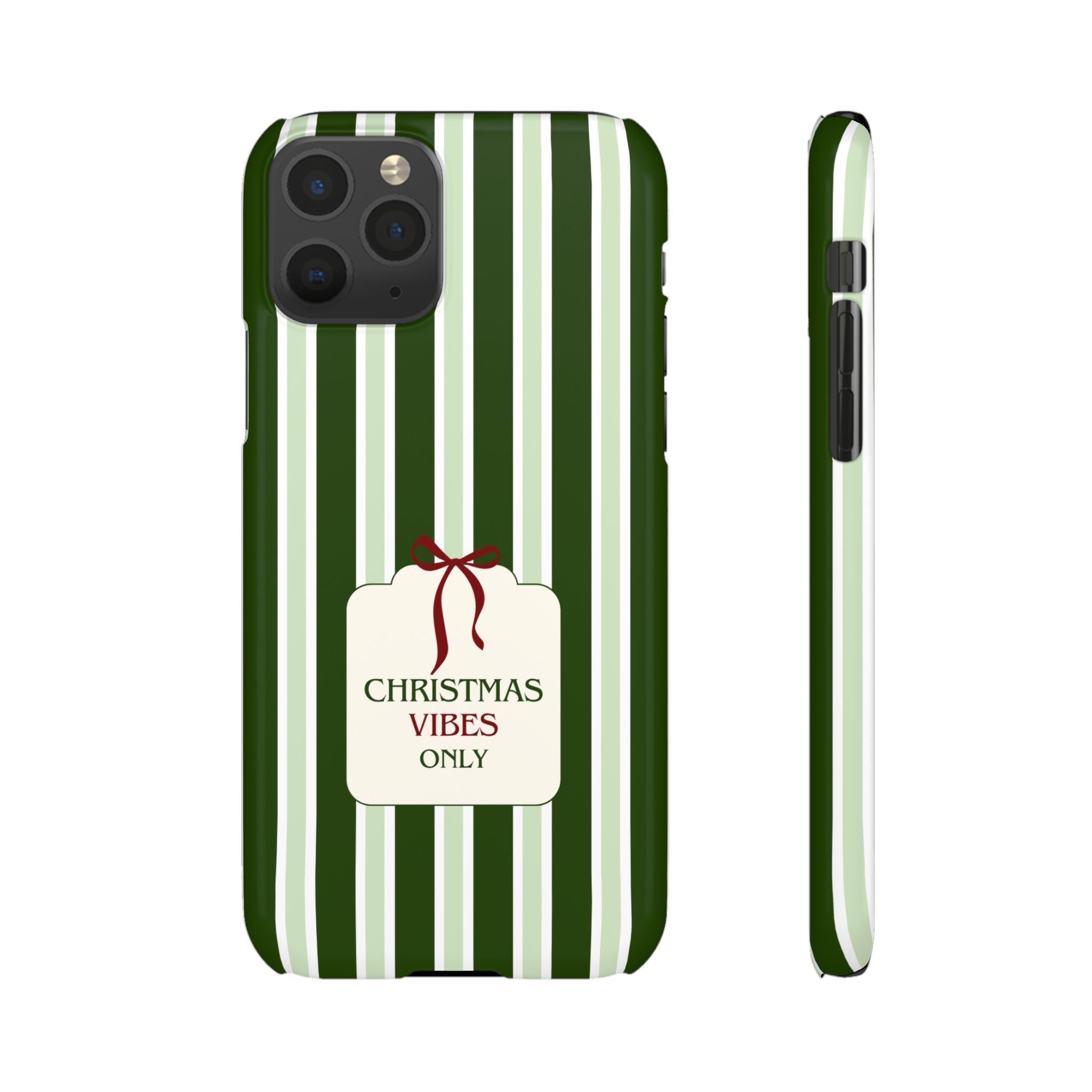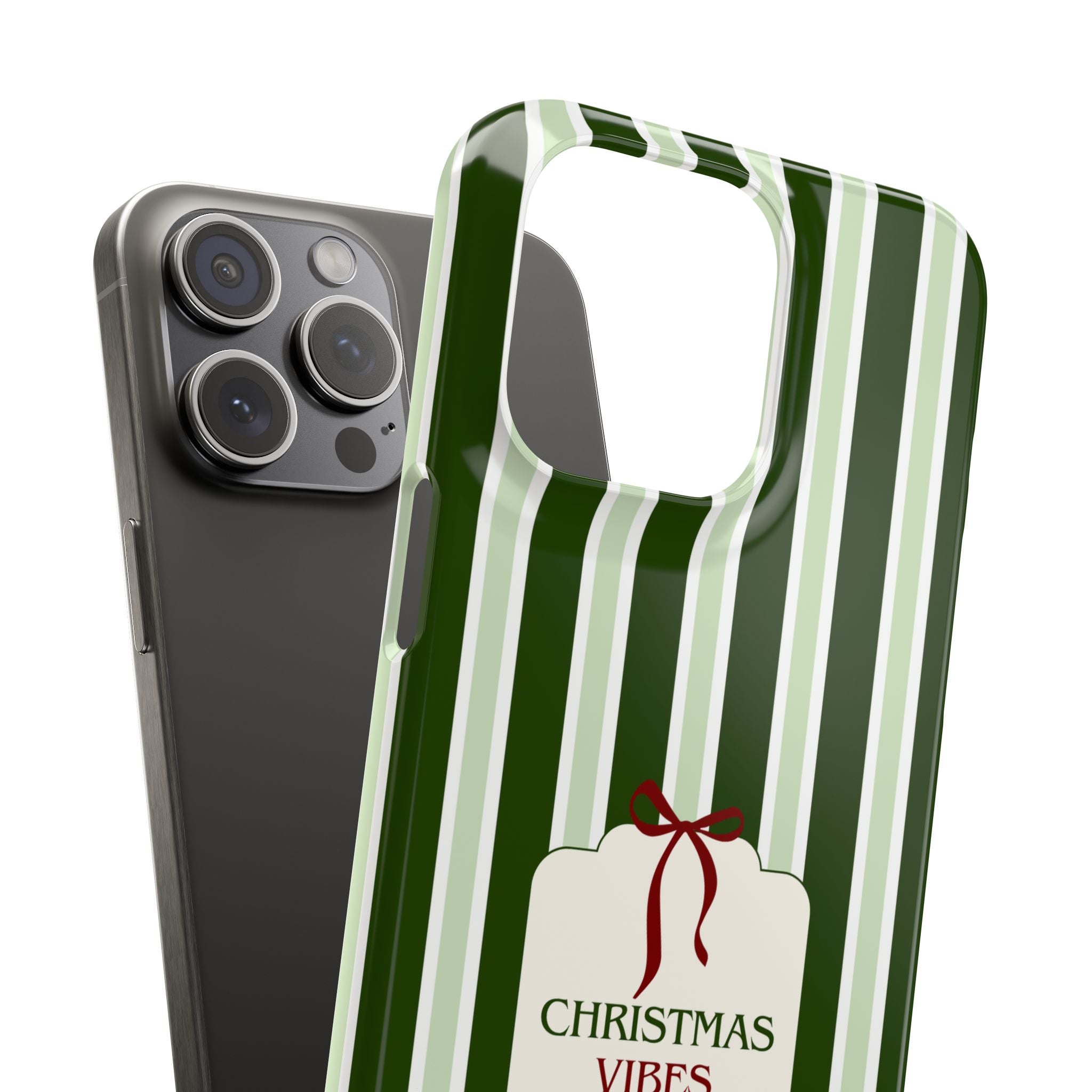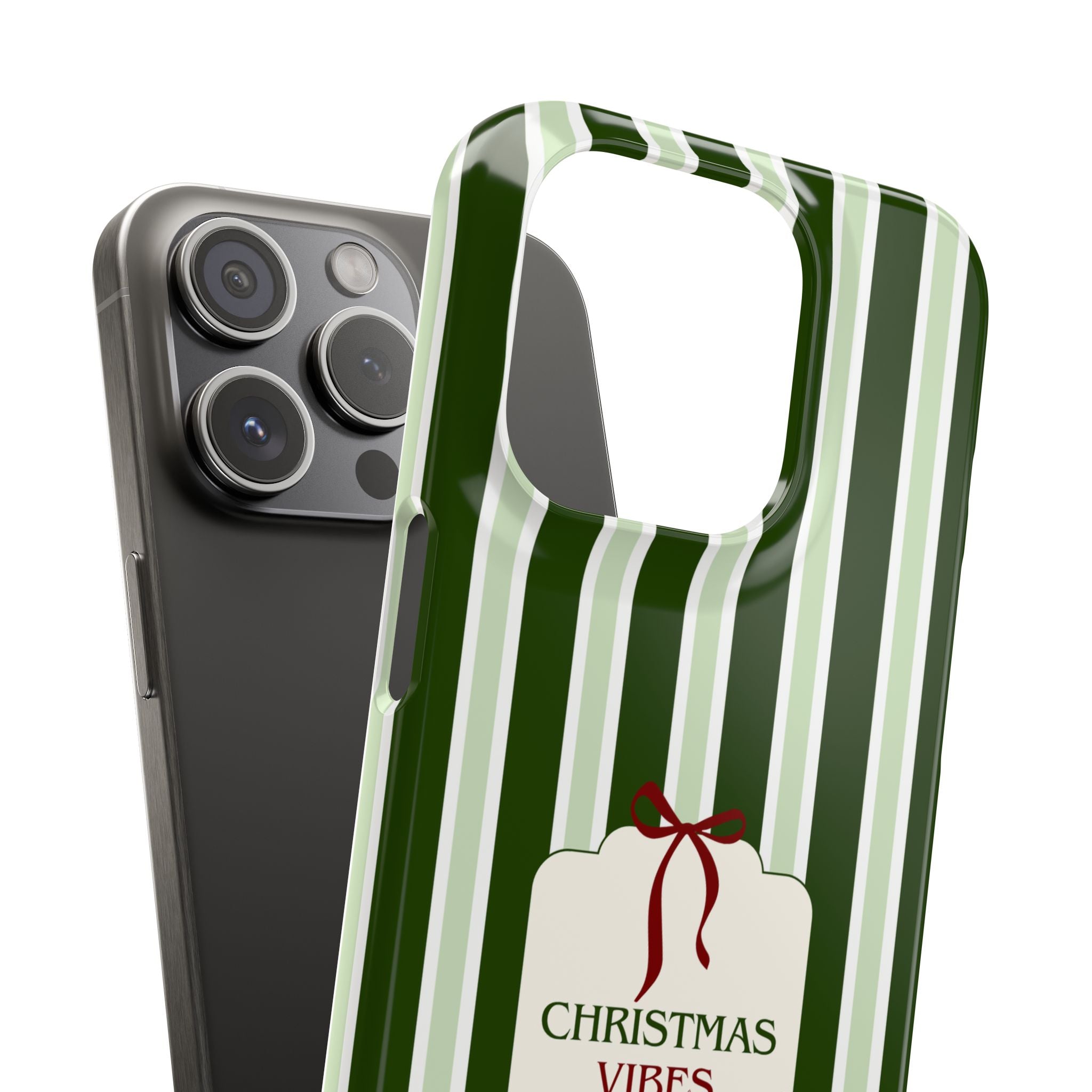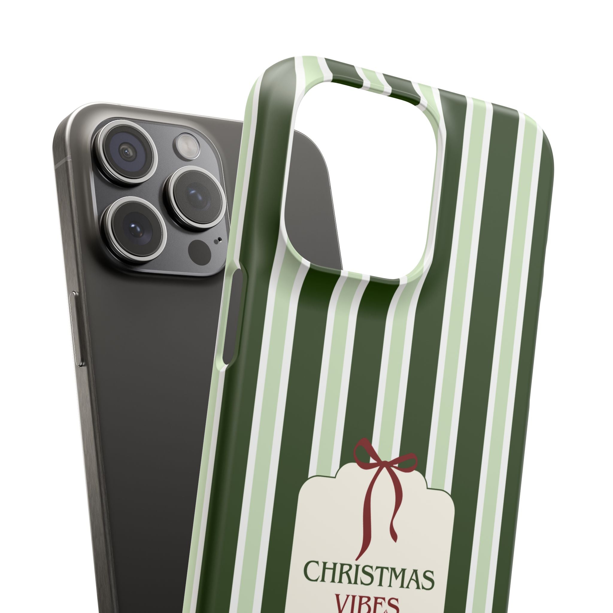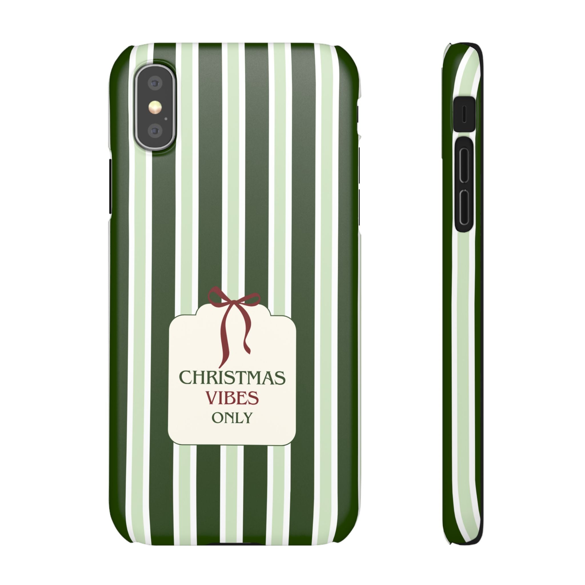 Christmas Vibes Only – schlank & stilvoll, schützt dein Smartphone zuverlässig vor Kratzern & leichten Stößen und bringt mit den frischen grünen Streifen und dem „Christmas Vibes Only“-Schriftzug moderne, entspannte Weihnachtsstimmung in deinen Alltag.