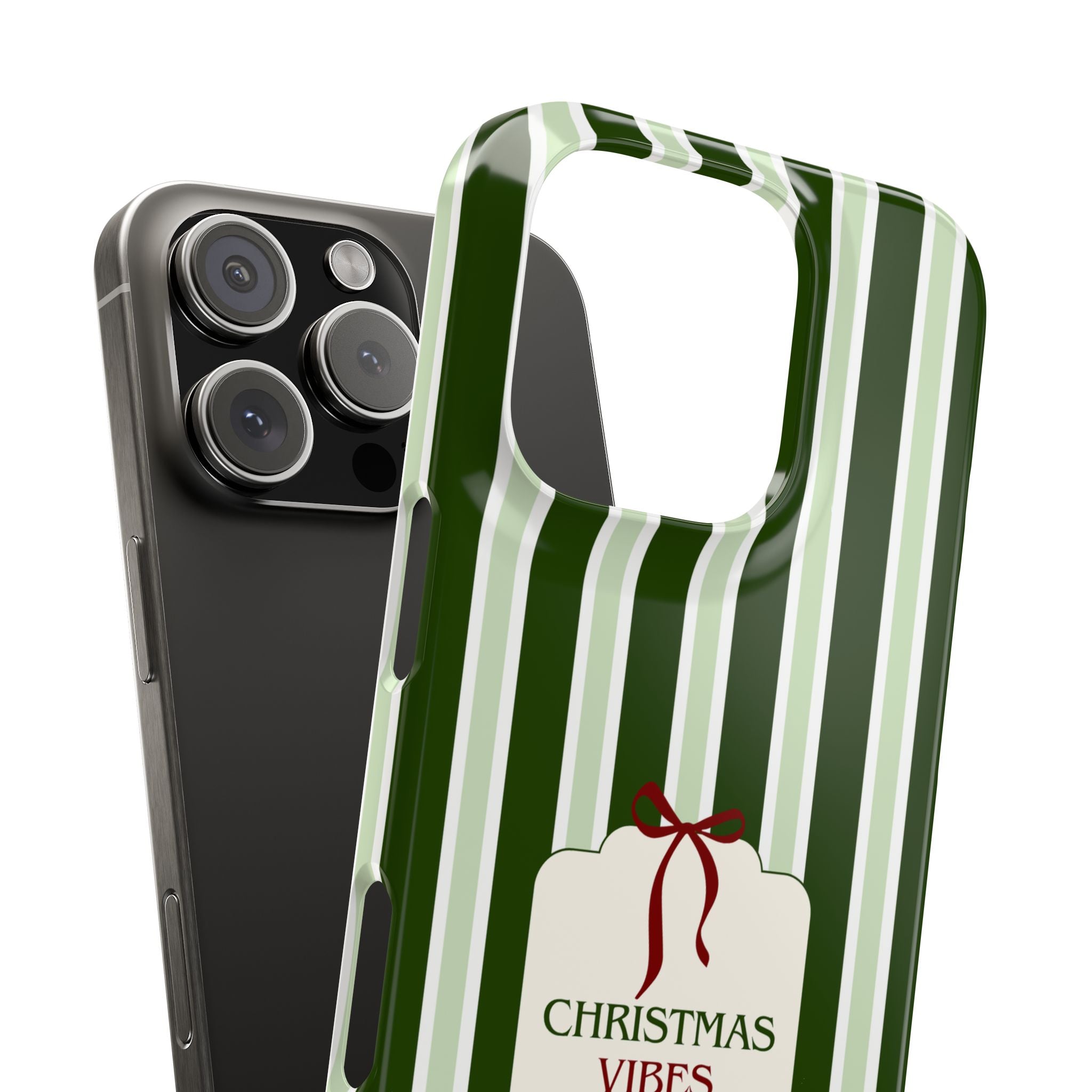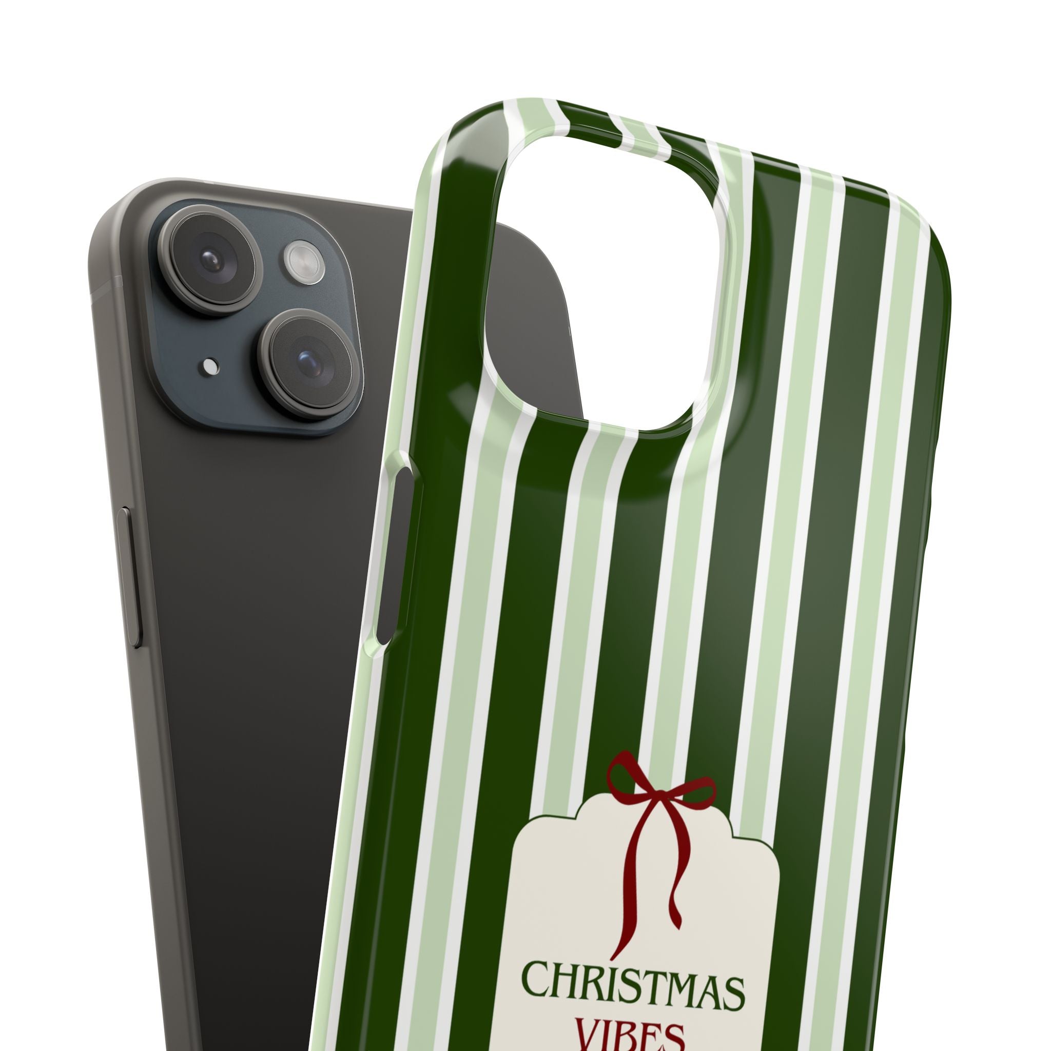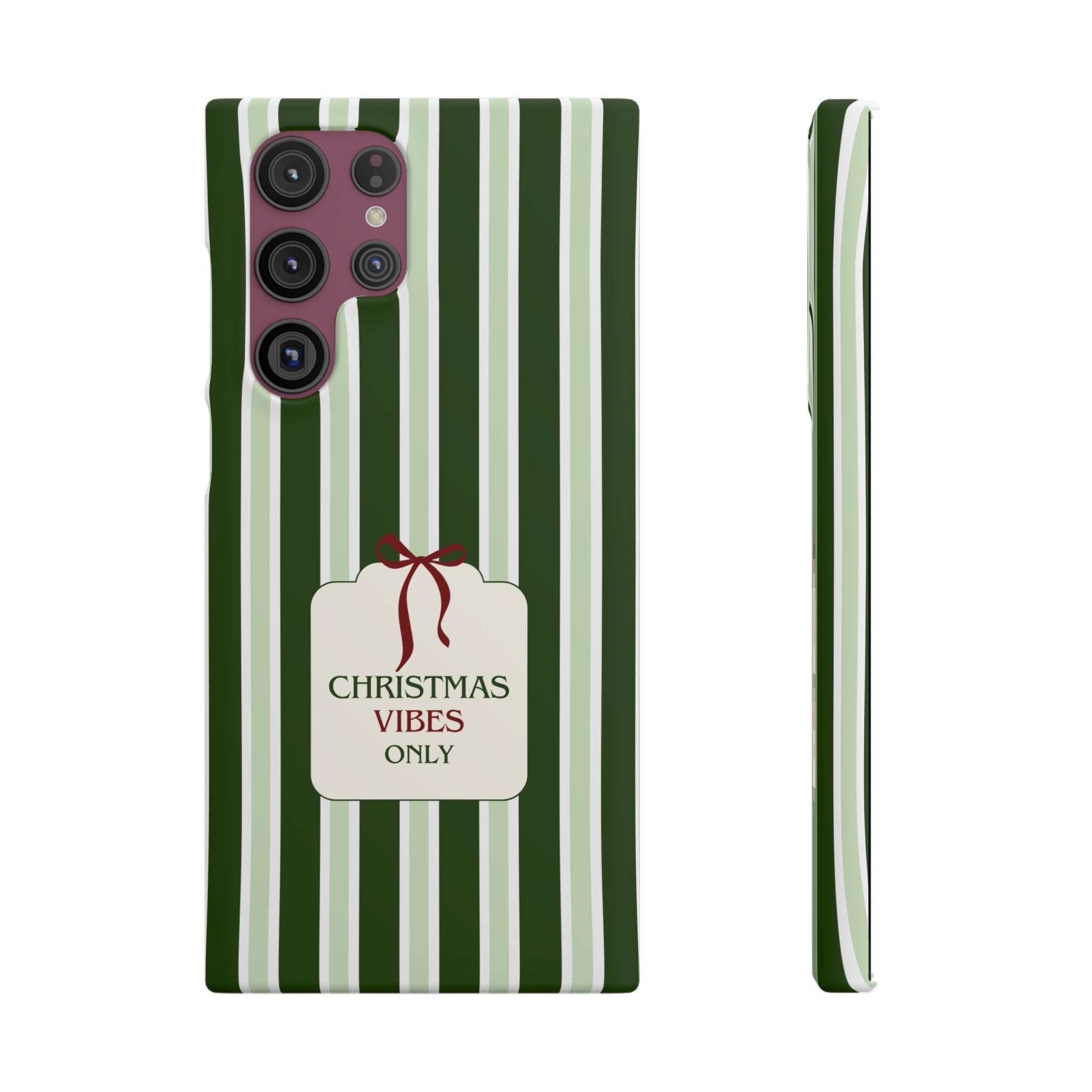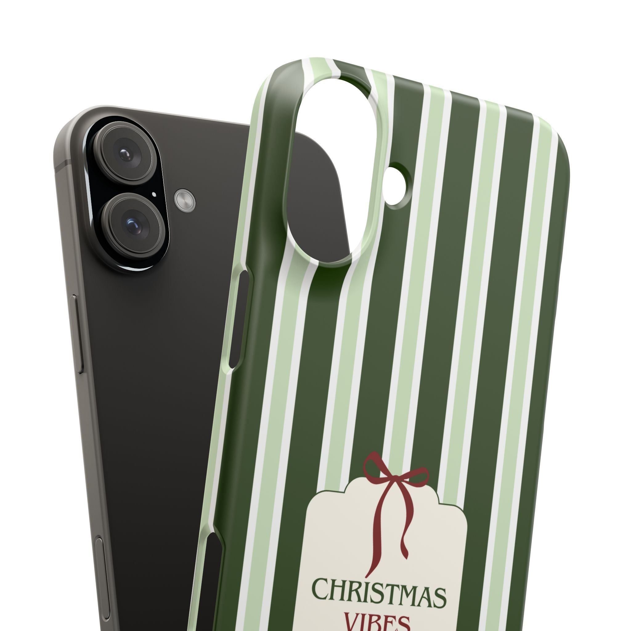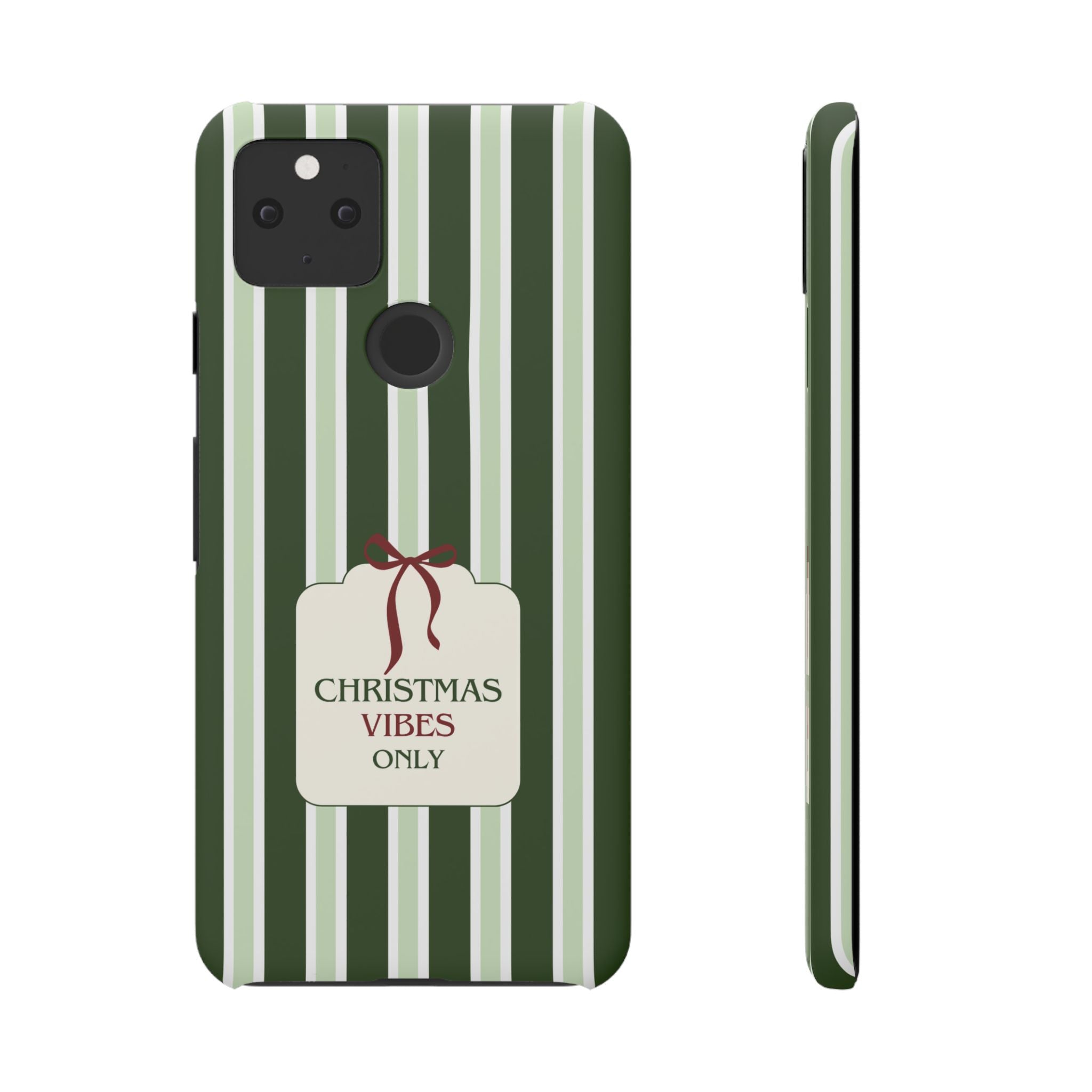 Christmas Vibes Only – schlank & stilvoll, schützt dein Smartphone zuverlässig vor Kratzern & leichten Stößen und bringt mit den frischen grünen Streifen und dem „Christmas Vibes Only“-Schriftzug moderne, entspannte Weihnachtsstimmung in deinen Alltag.