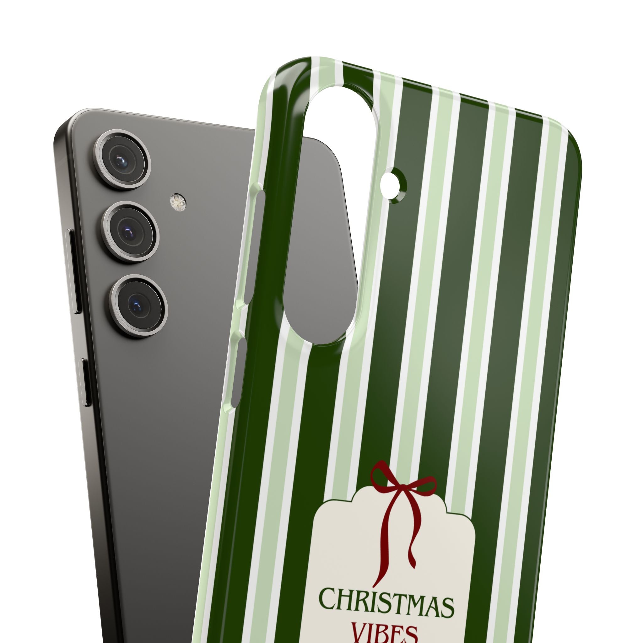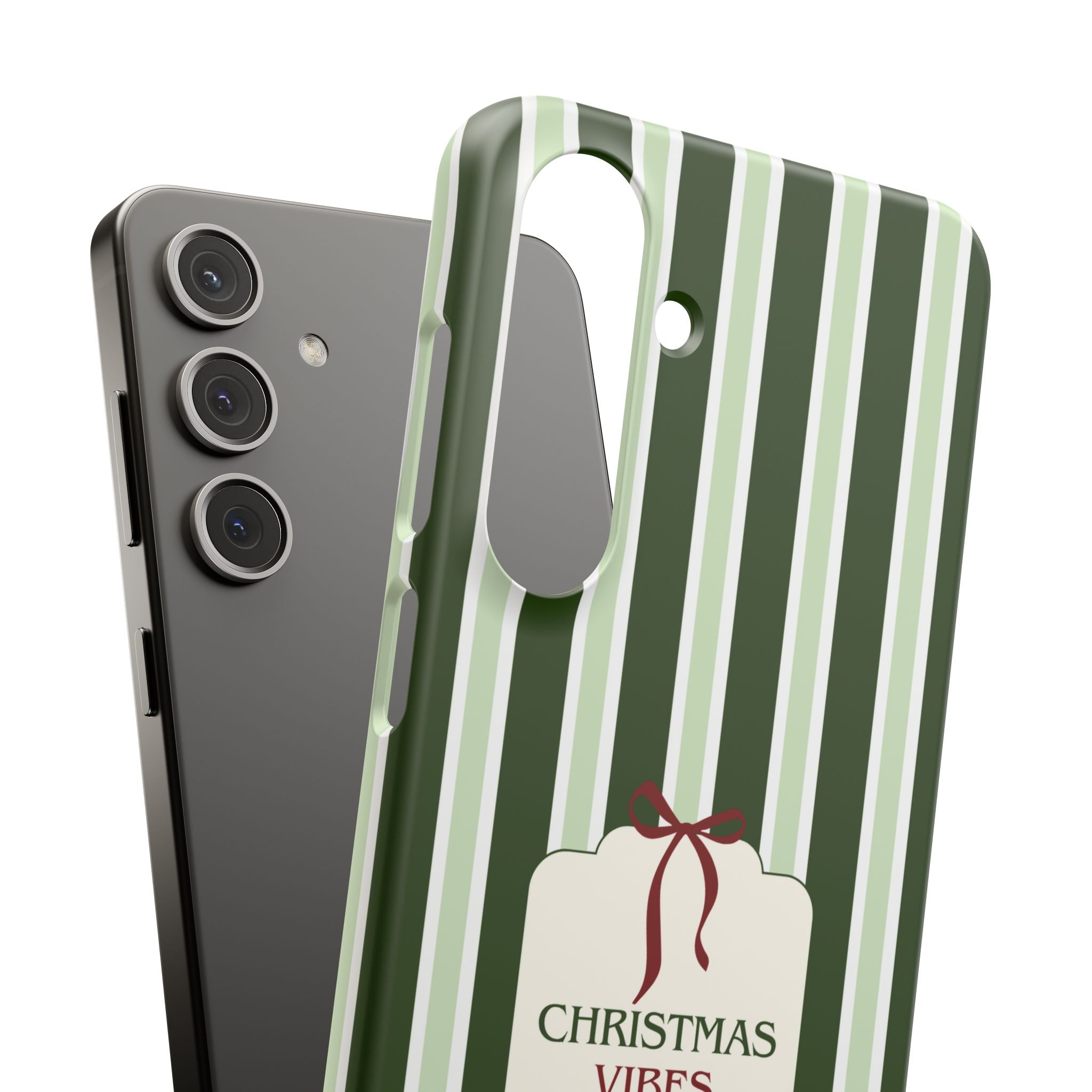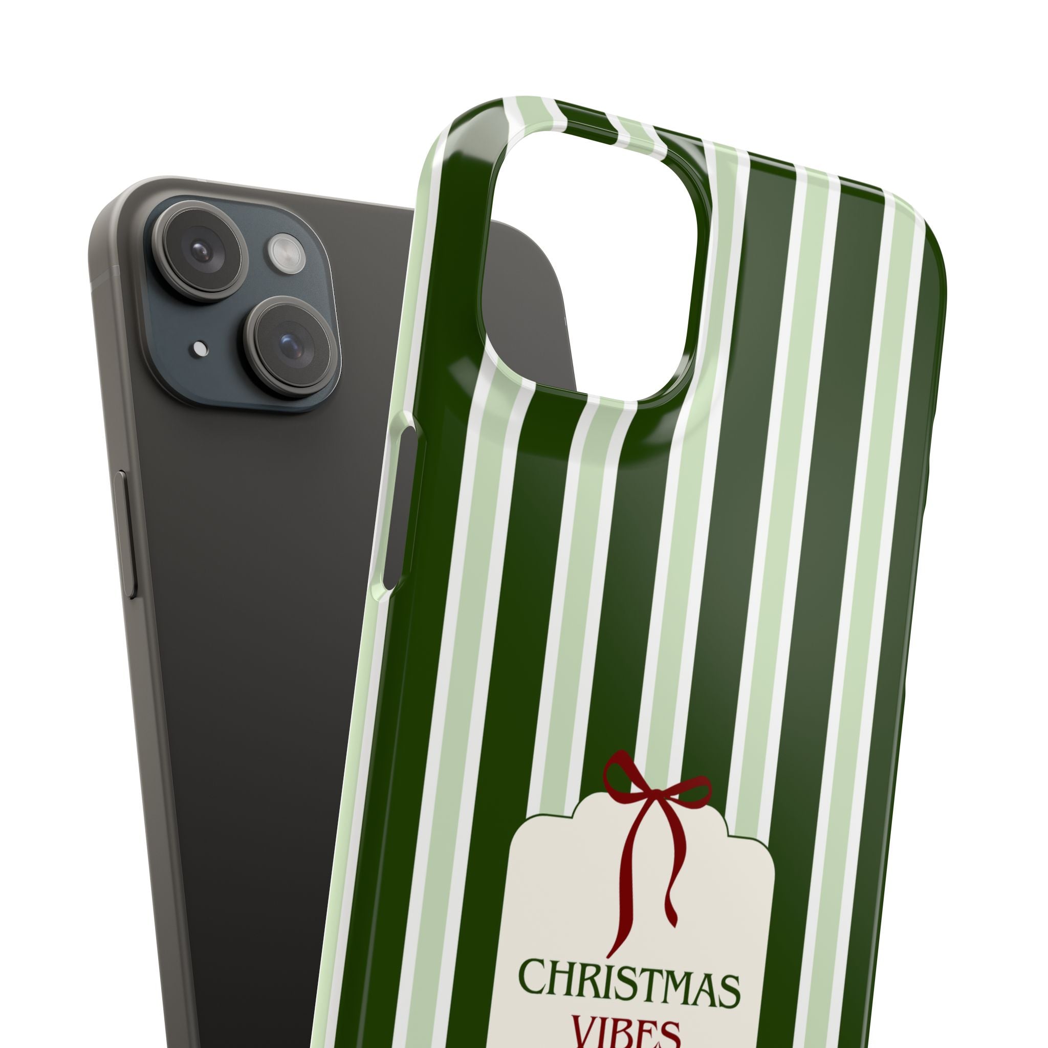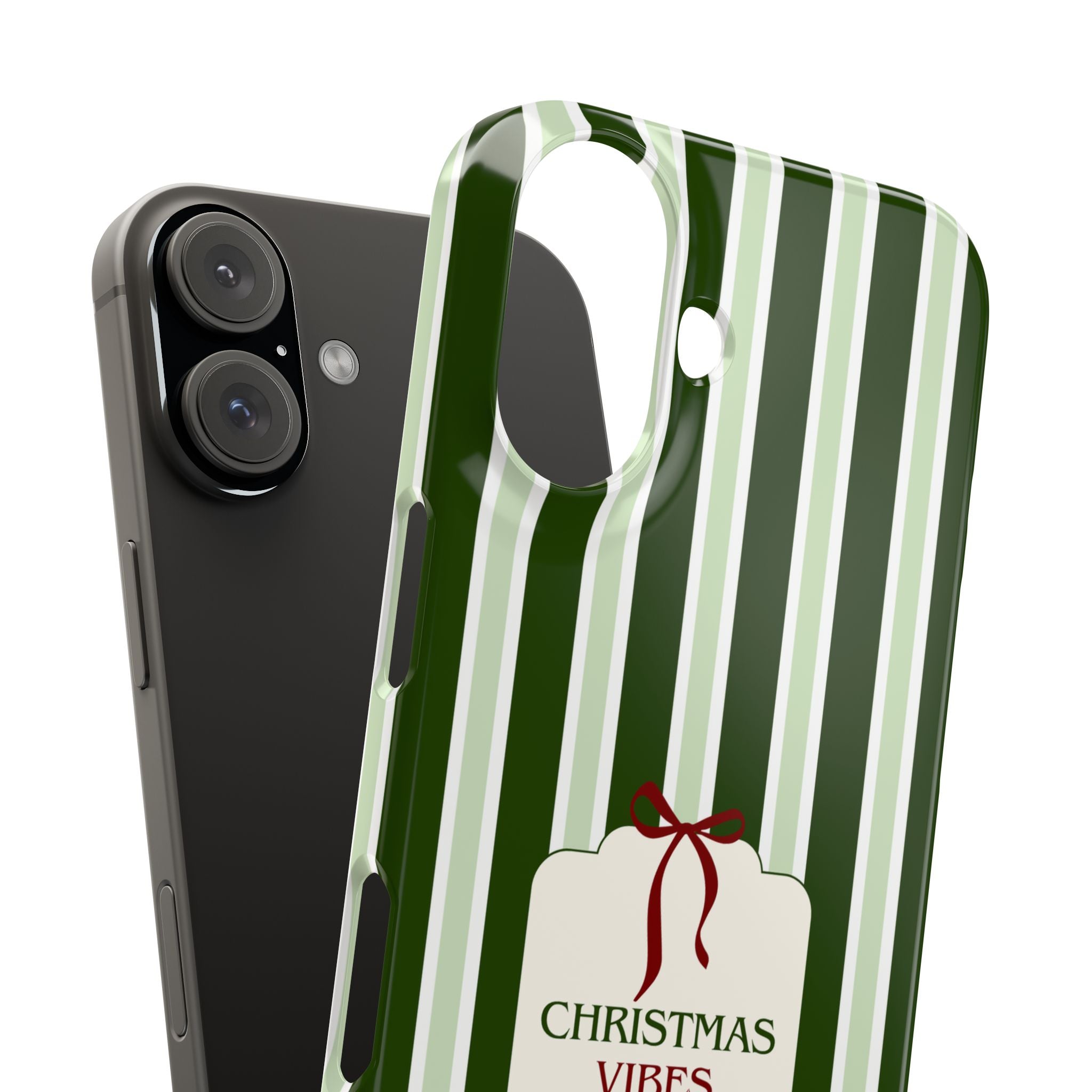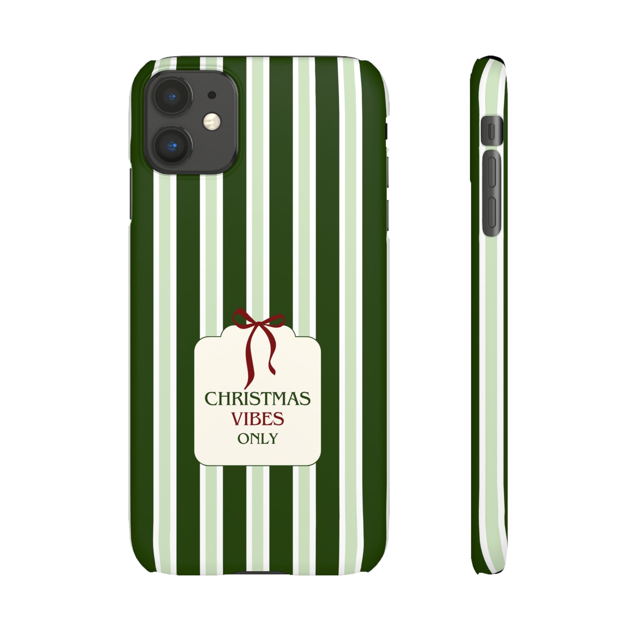 Christmas Vibes Only – schlank & stilvoll, schützt dein Smartphone zuverlässig vor Kratzern & leichten Stößen und bringt mit den frischen grünen Streifen und dem „Christmas Vibes Only“-Schriftzug moderne, entspannte Weihnachtsstimmung in deinen Alltag.
