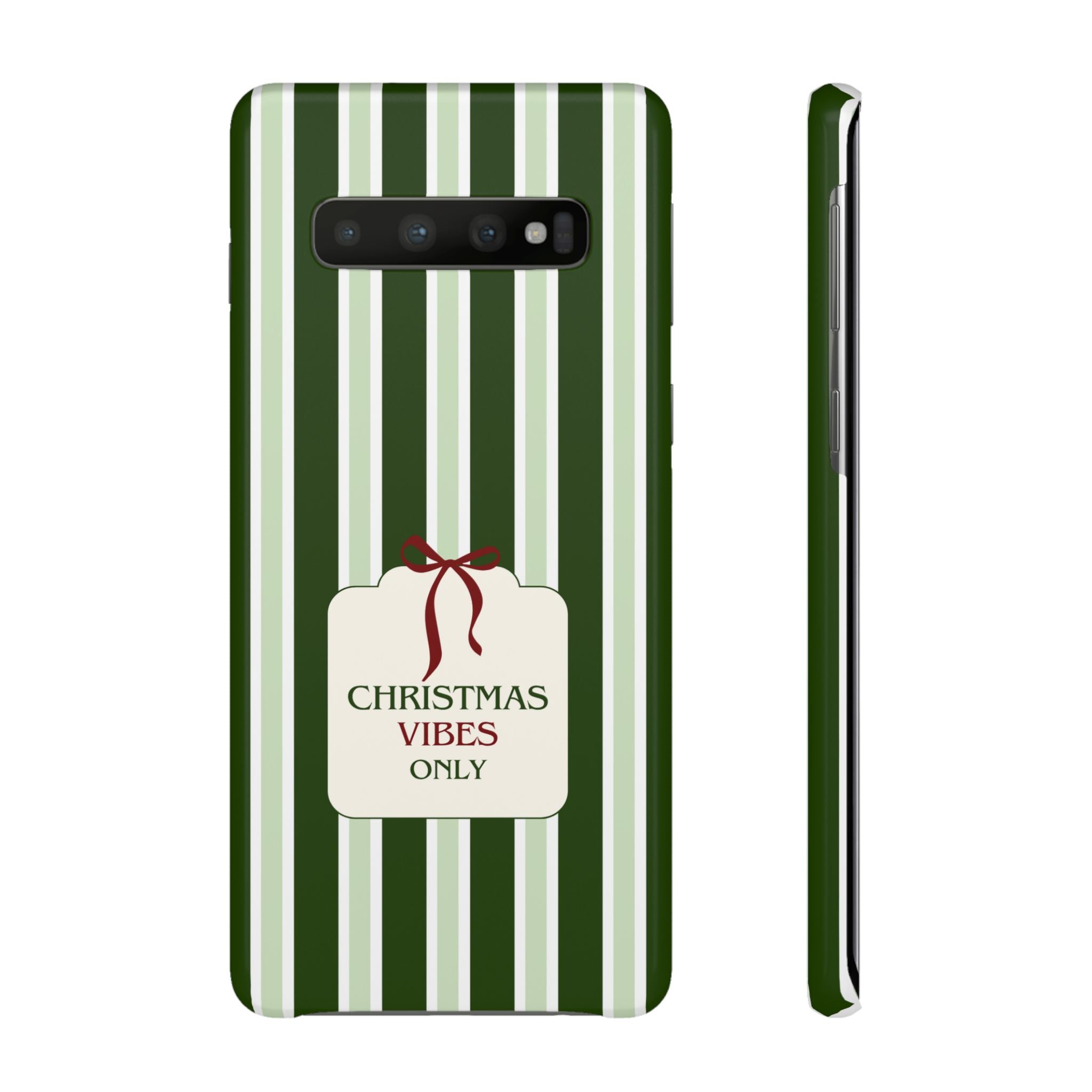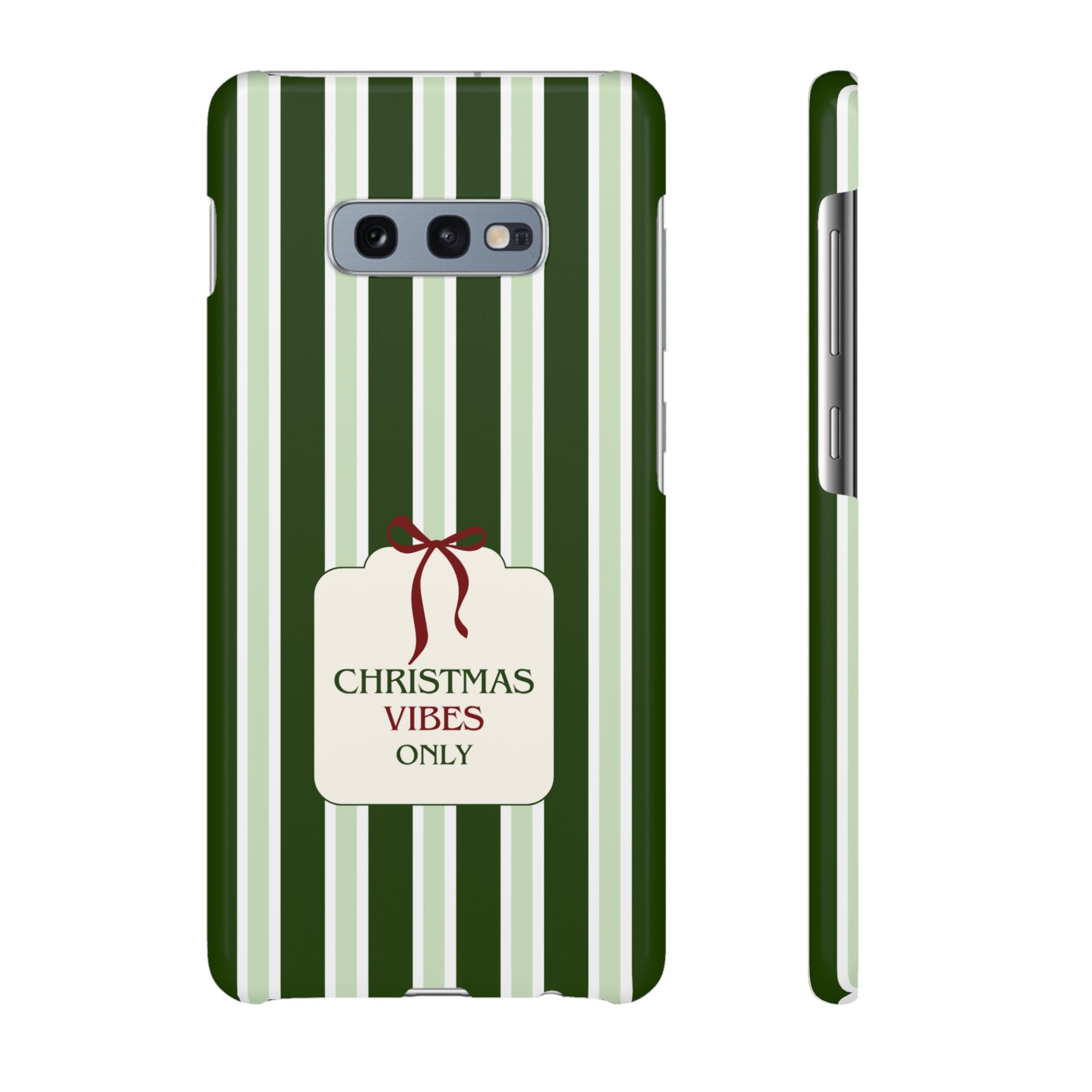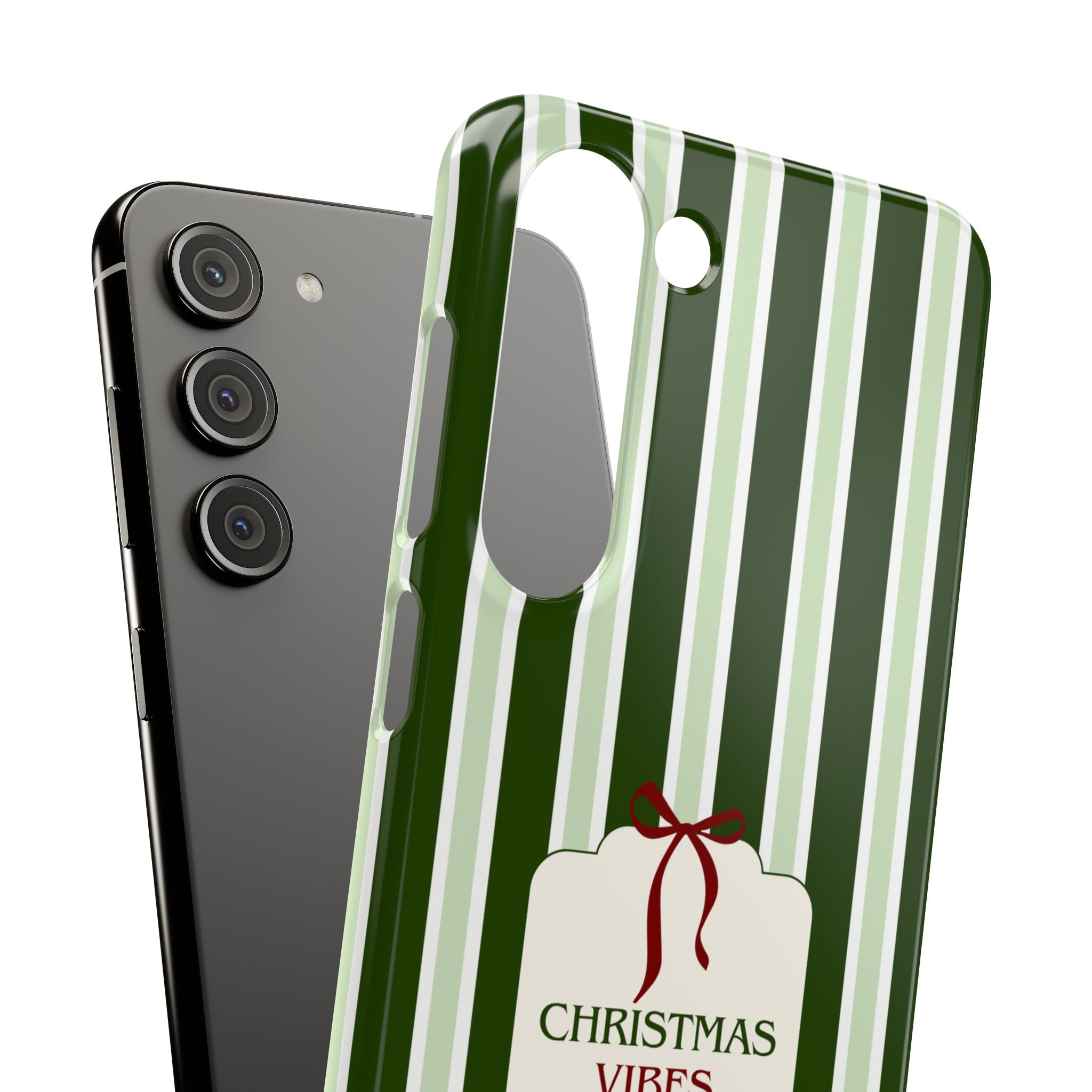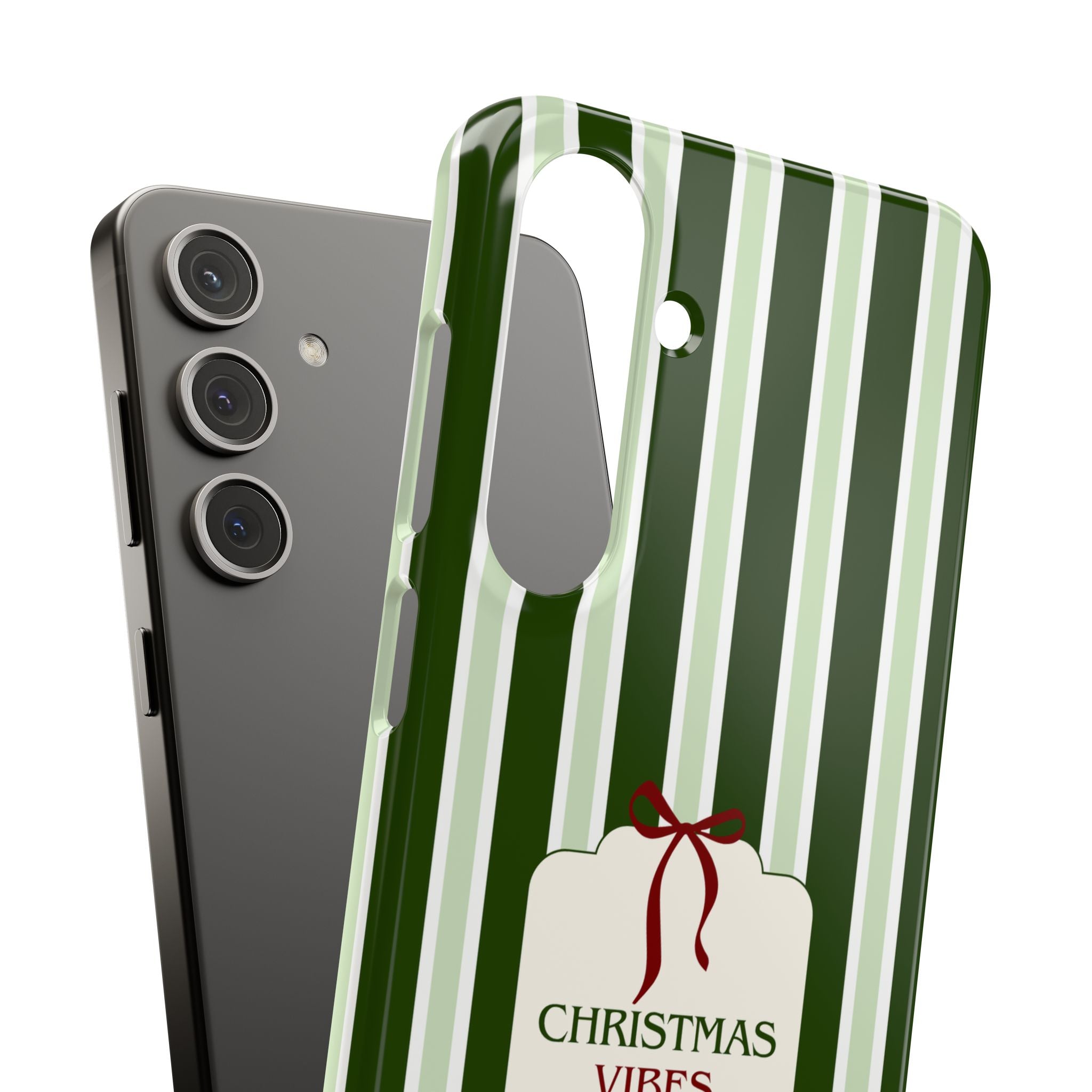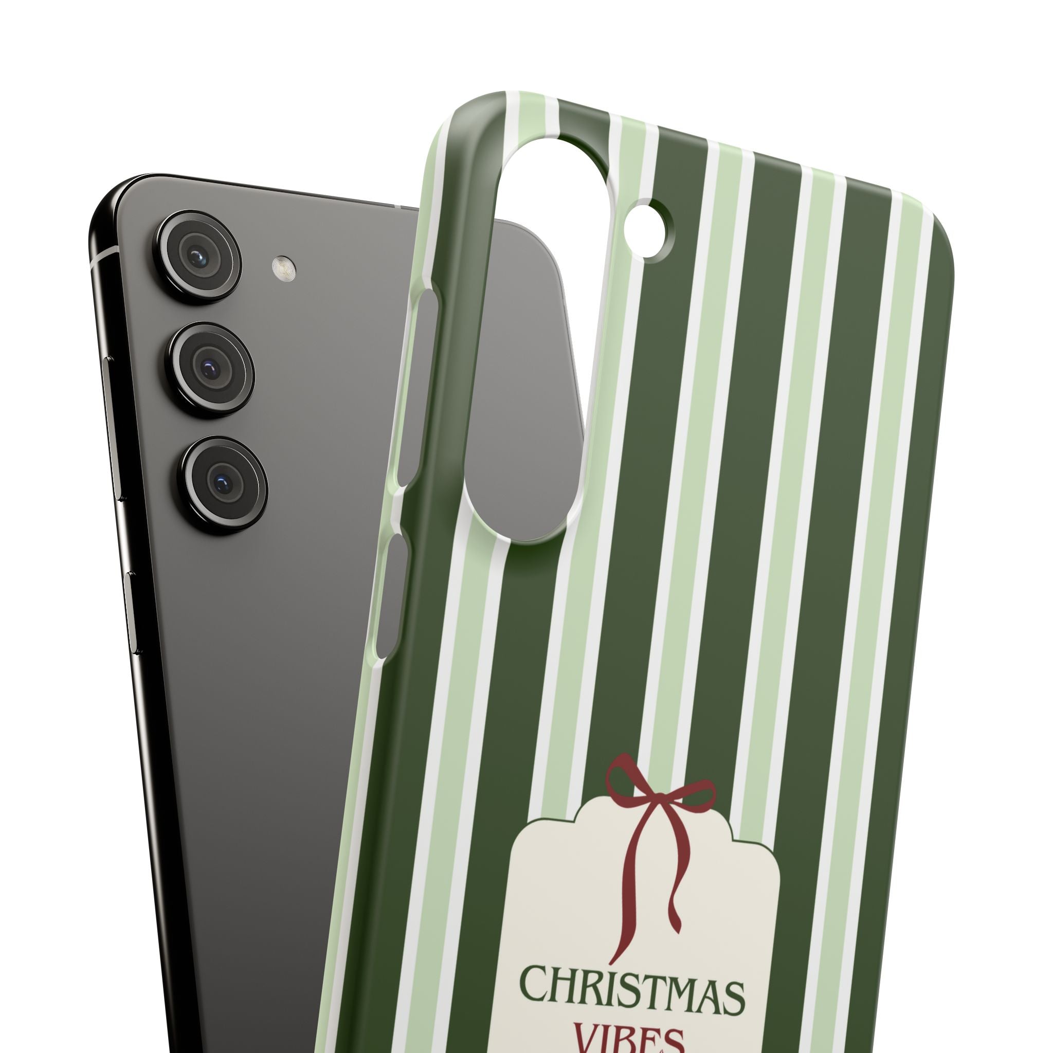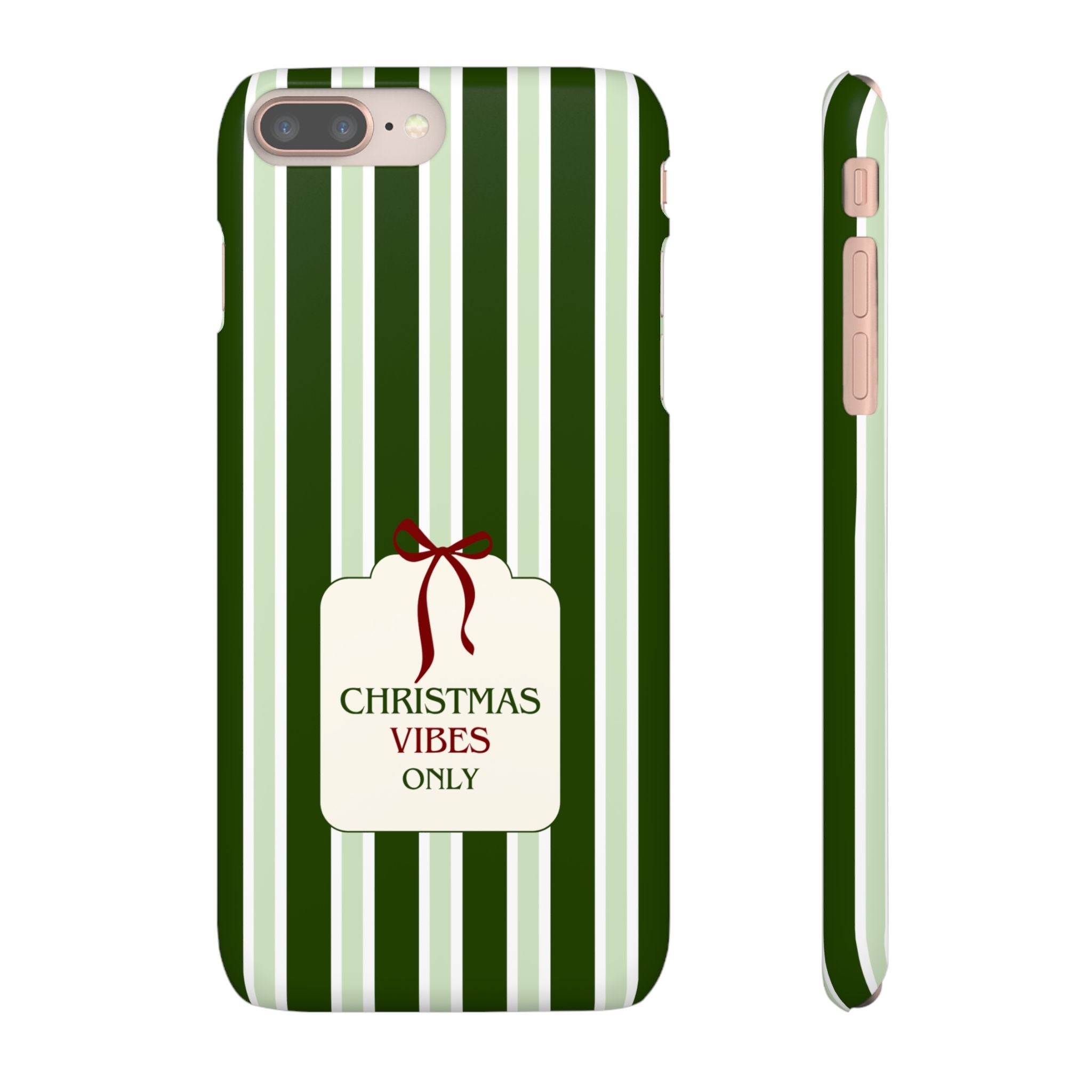 Christmas Vibes Only – schlank & stilvoll, schützt dein Smartphone zuverlässig vor Kratzern & leichten Stößen und bringt mit den frischen grünen Streifen und dem „Christmas Vibes Only“-Schriftzug moderne, entspannte Weihnachtsstimmung in deinen Alltag.