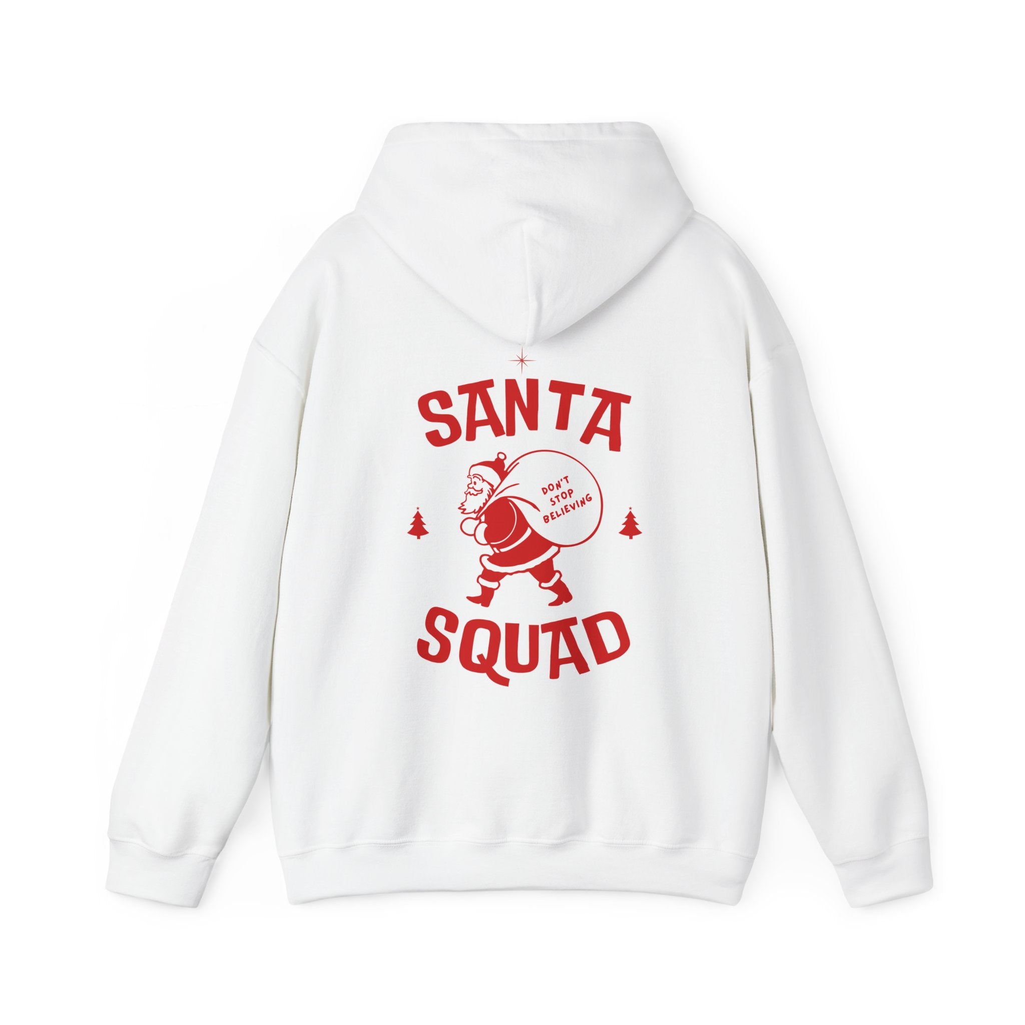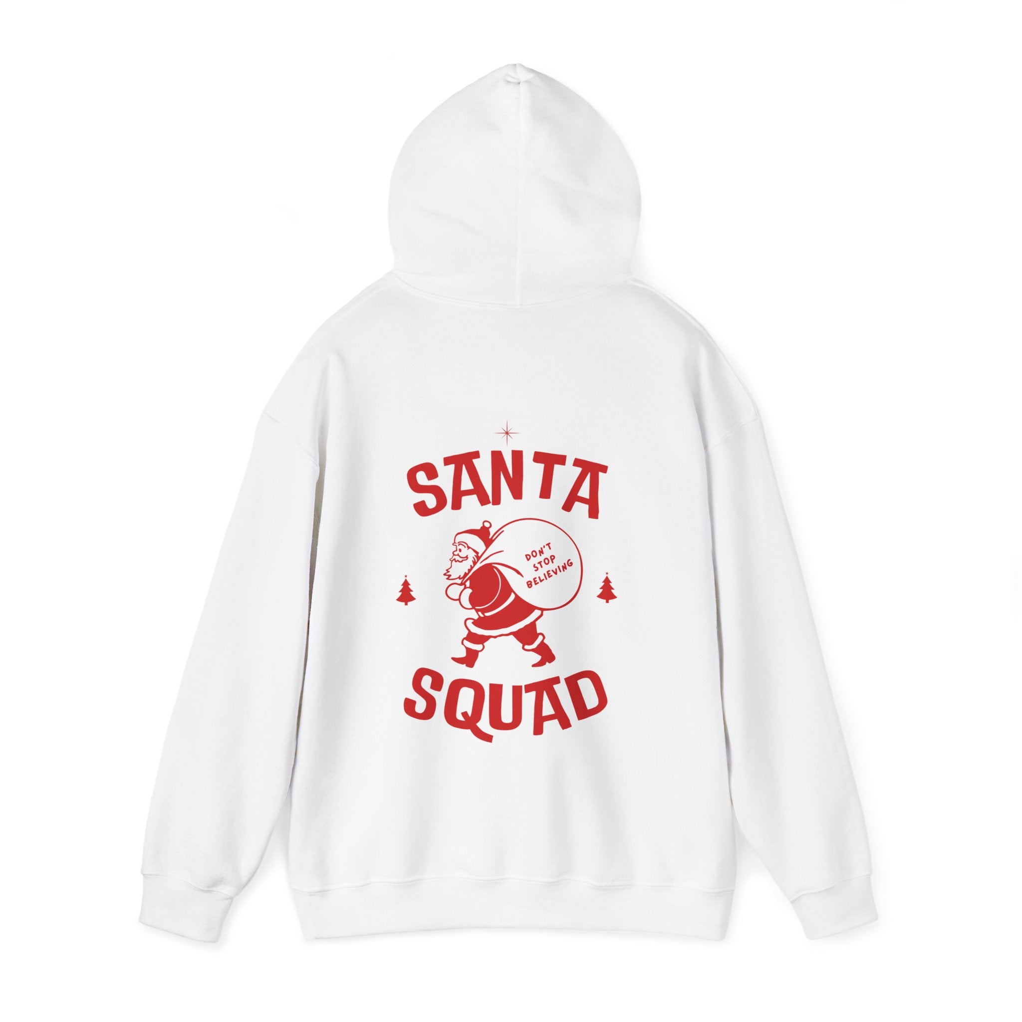Weicher, warmer Unisex Hoodie mit großem „Santa Squad“ Backprint. Der mittelschwere Stoff (271 g/m²) bietet Komfort an kalten Tagen; Classic Fit mit Kängurutasche und doppellagiger Kapuze.